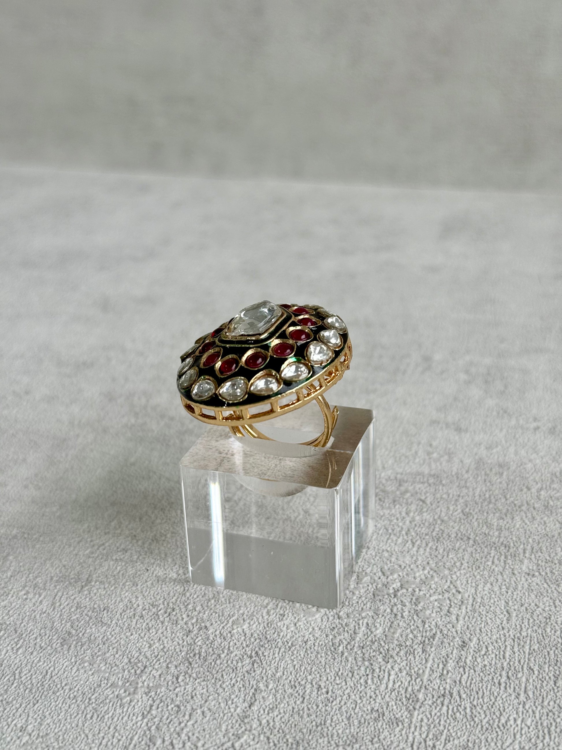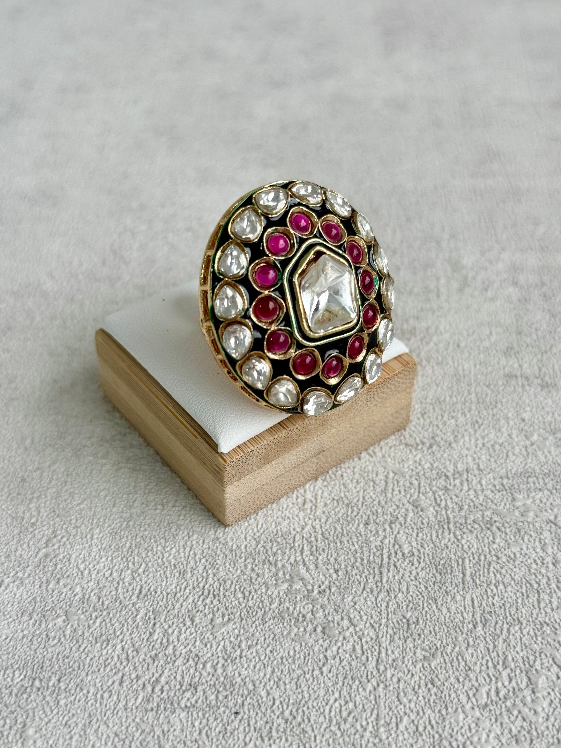 A bold statement piece designed to instantly elevate any look, the Lara Adjustable Ring blends traditional artistry with a striking, modern edge. Featuring a prominent mirror-cut centre stone, the design is framed by vibrant ruby pink accents and deep green enamel detailing, creating a beautifully rich and eye-catching finish.