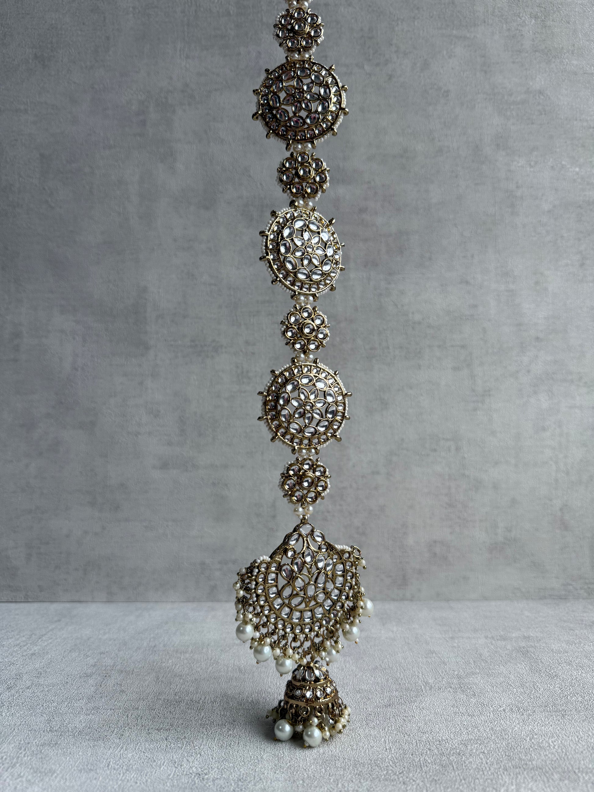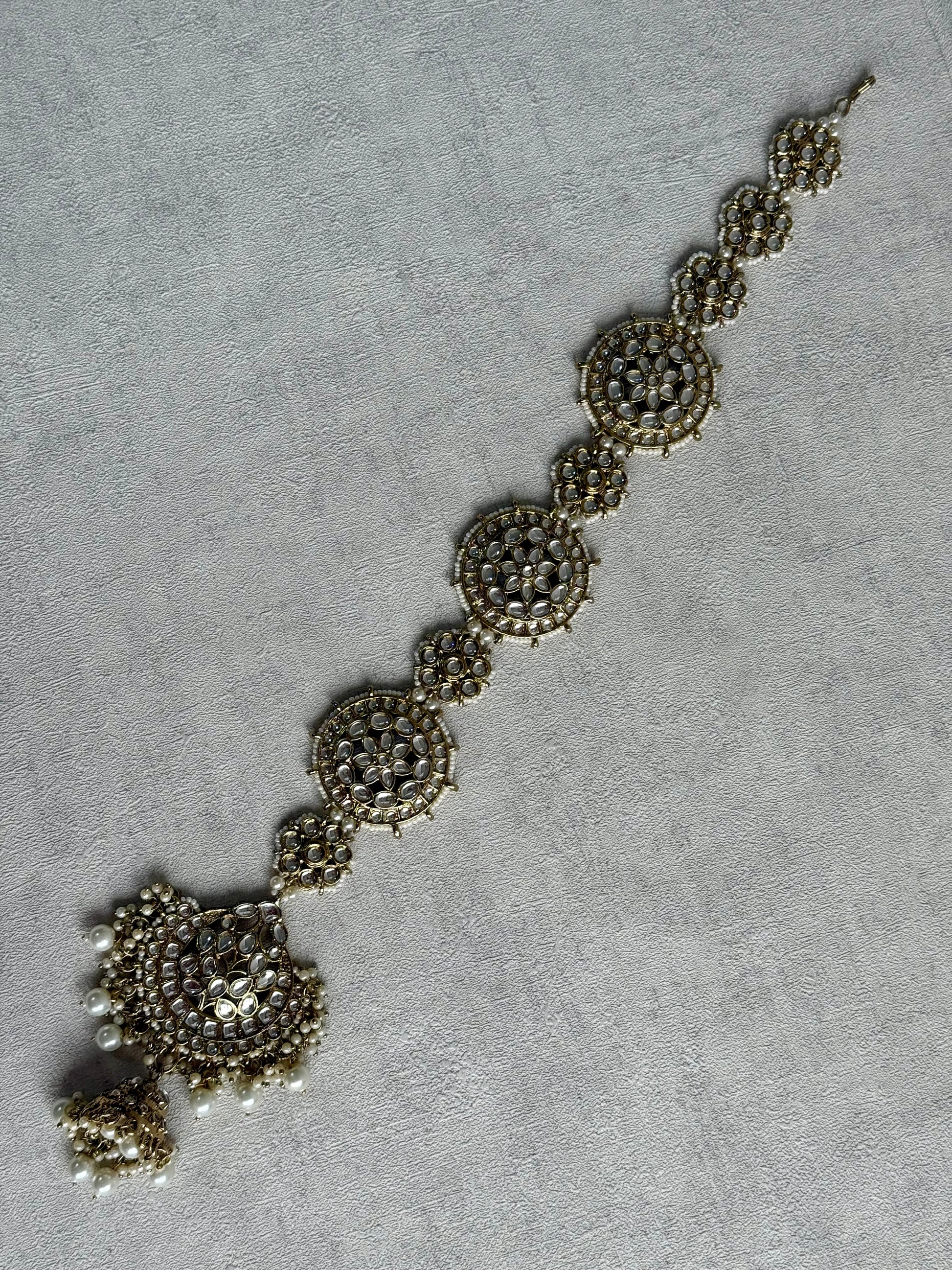 The antique gold finish adds a touch of heirloom character, creating a rich contrast against the brilliance of the mirror-cut detailing. Each panel leads gracefully into the next, building towards a grand statement jhumki at the base — generously adorned with soft ivory pearls that cluster and sway with movement.
