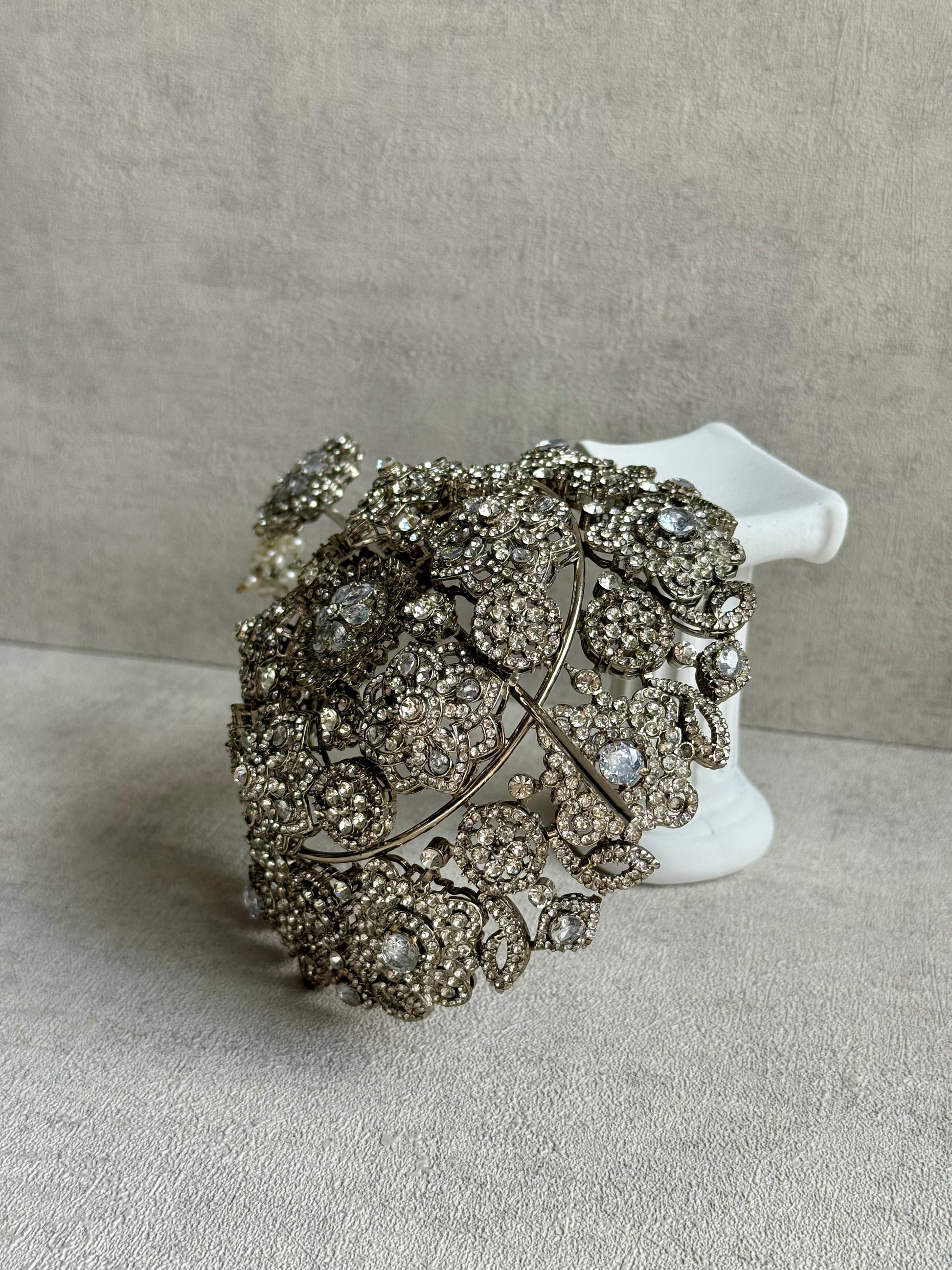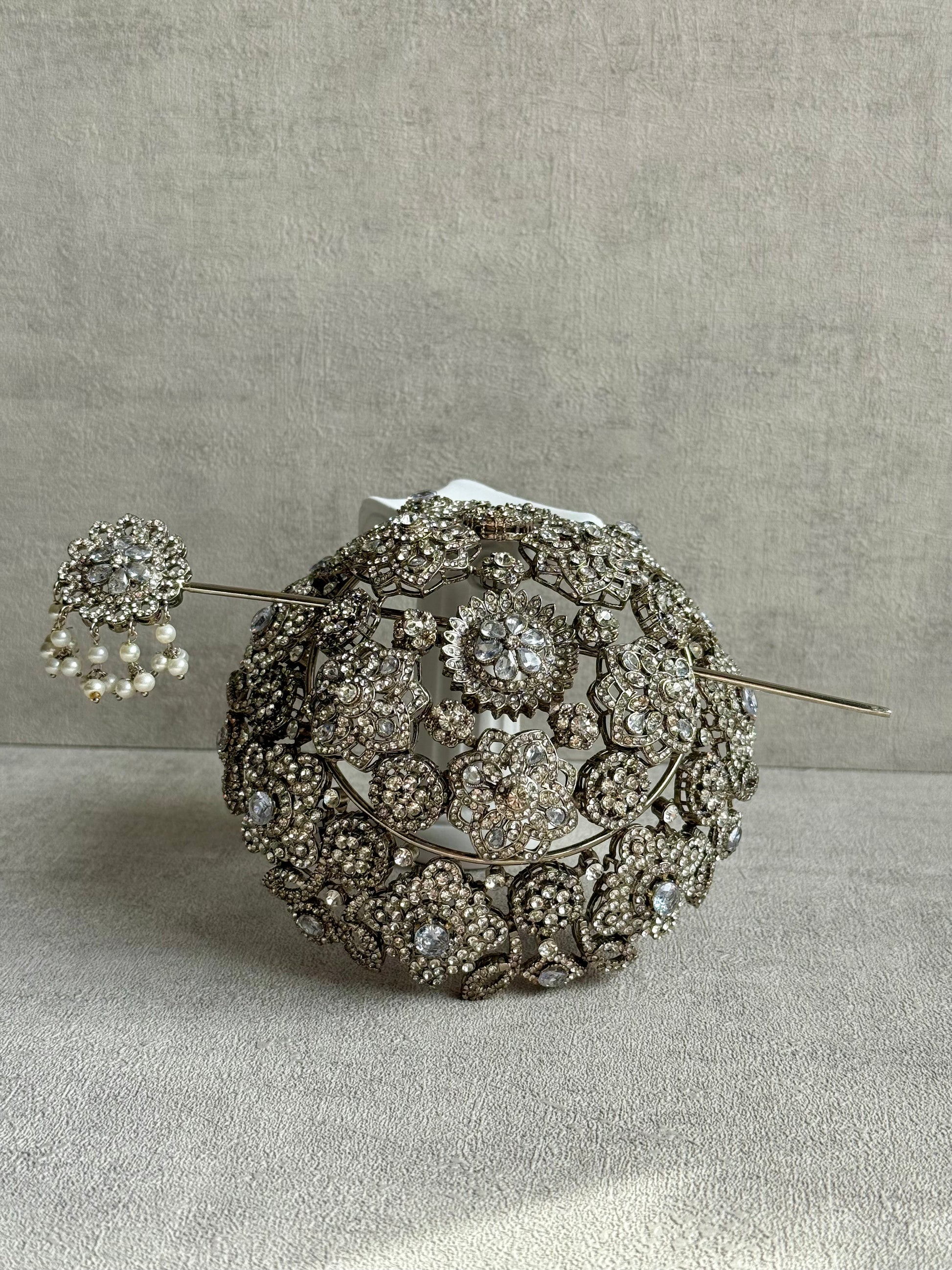 Crafted in an antique silver finish, the detailing captures a regal yet contemporary charm. The fine arrangement of stones and petals highlights the craftsmanship, making this bun cover an unforgettable accent for bridal, festive, or special occasion styling.