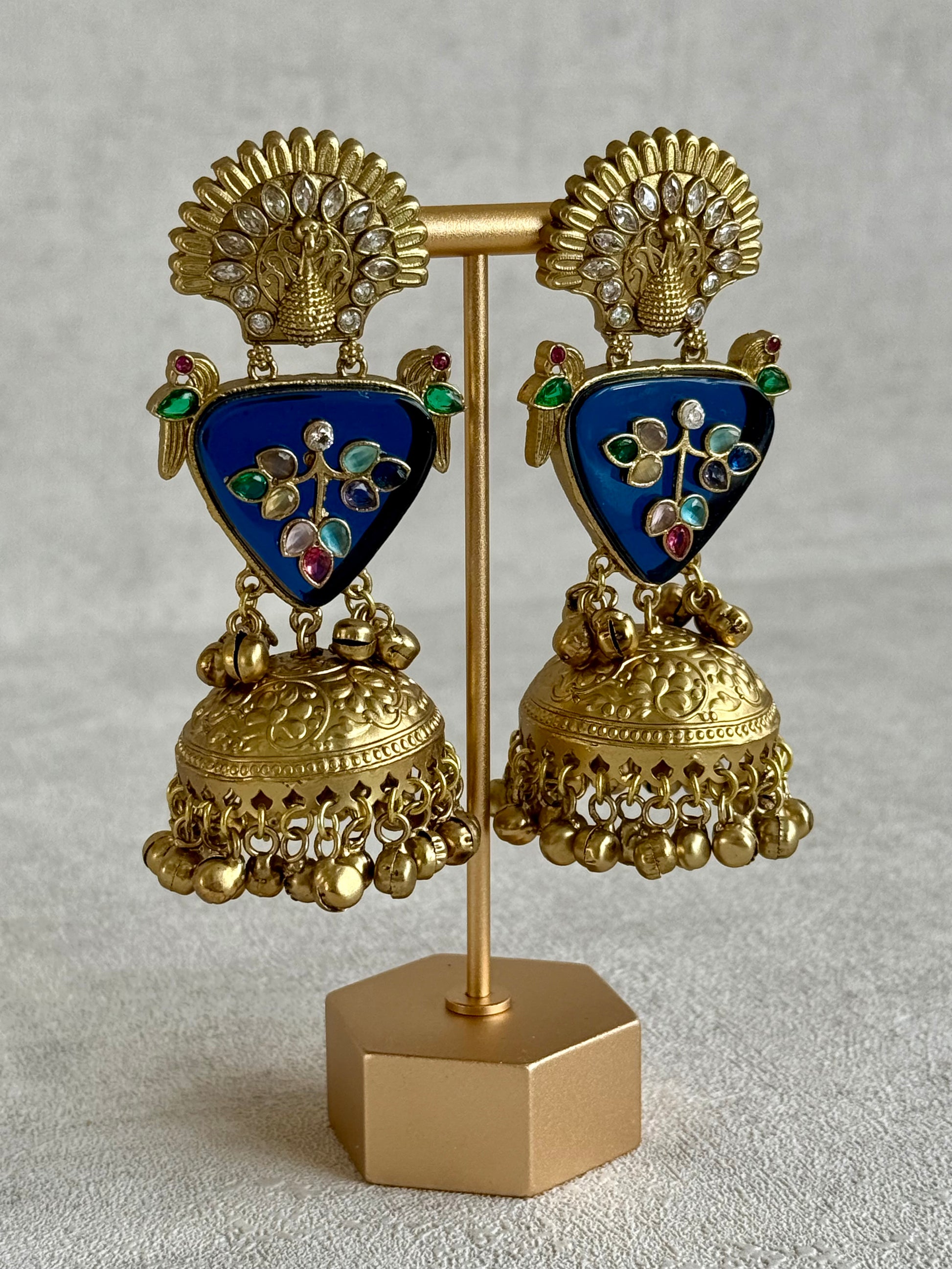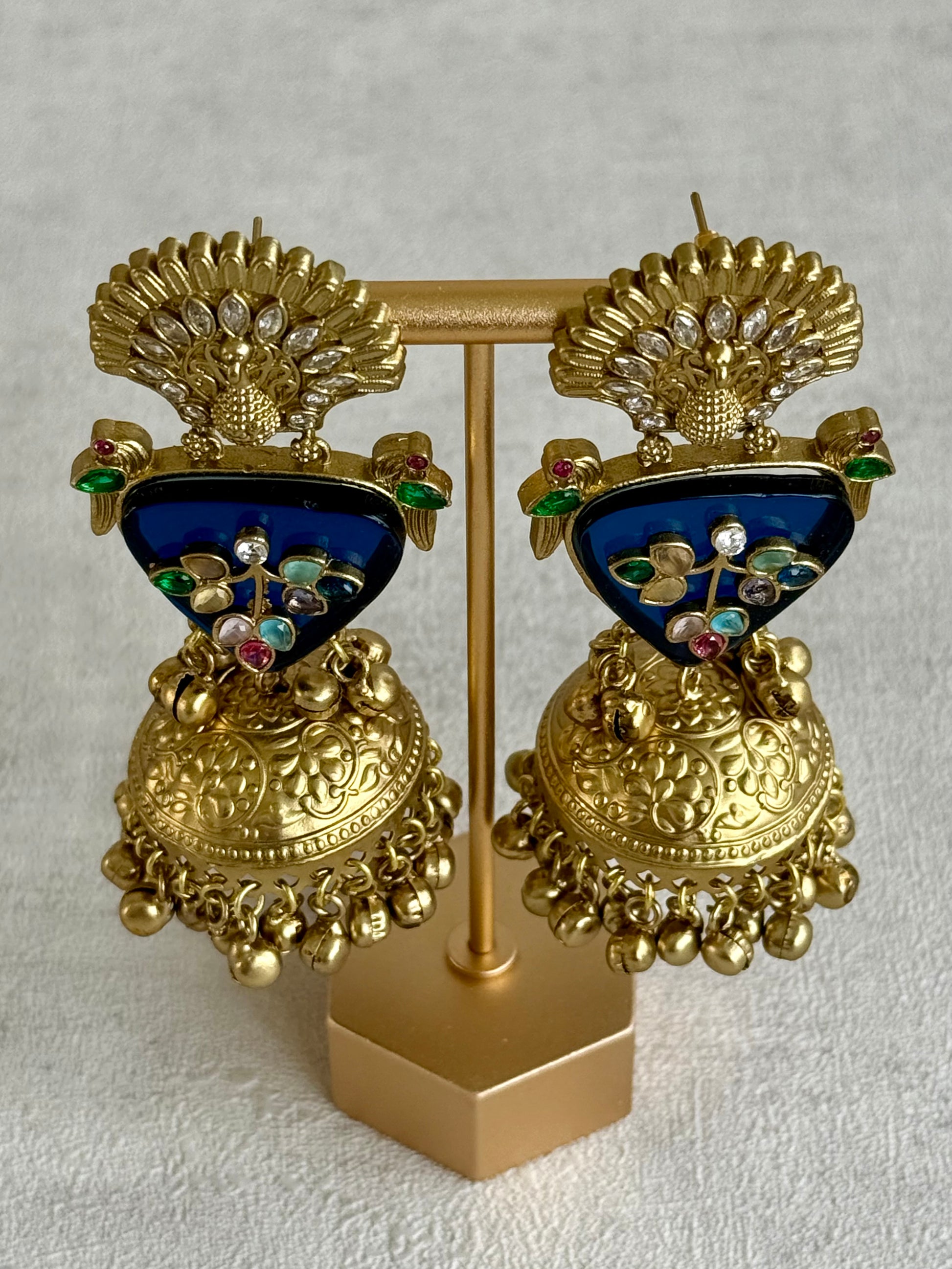 Ayura Designs Makali Earrings – Midnight Blue Enamel with Multicolour Stones & Antique Gold Jhumkis