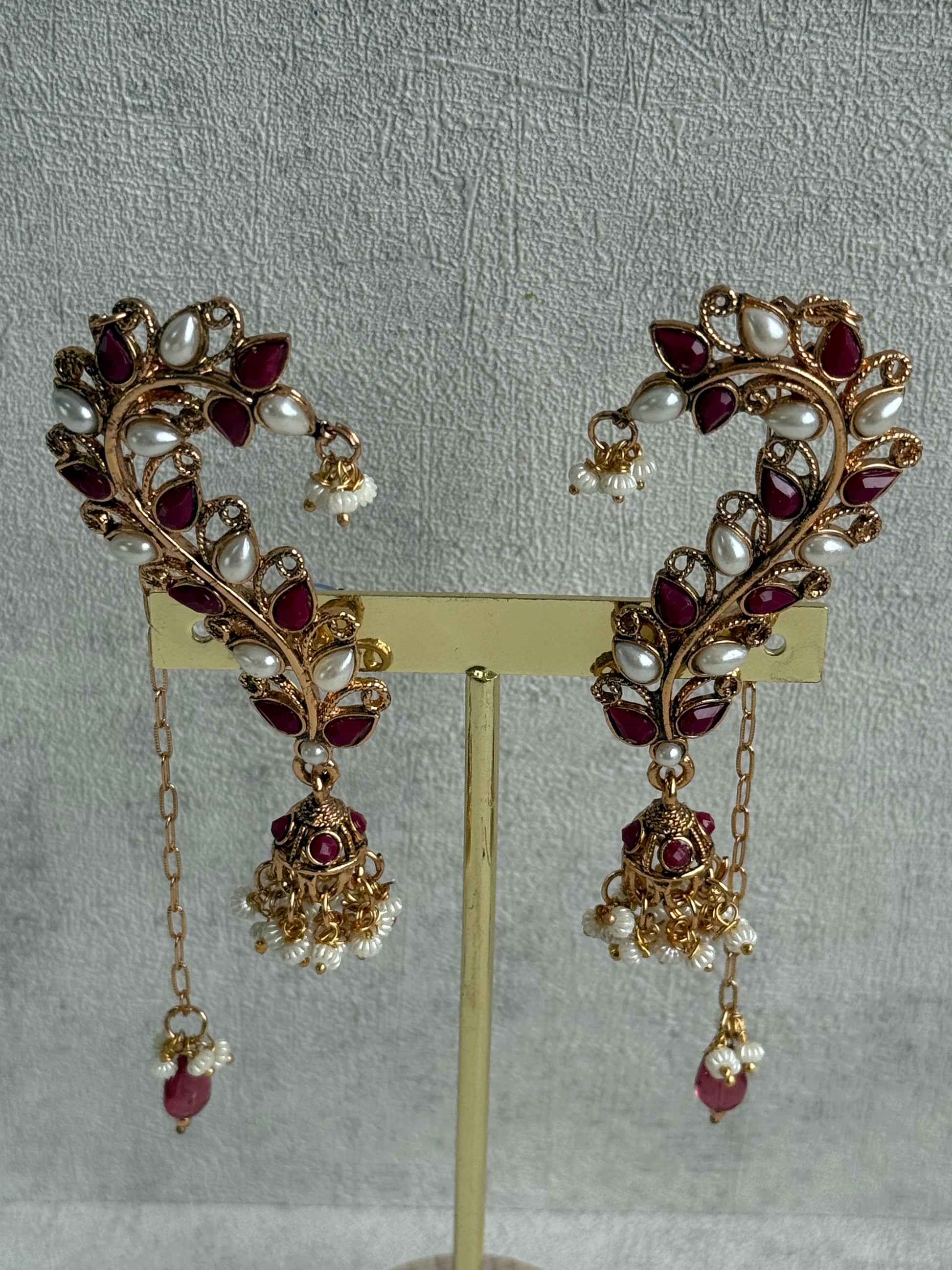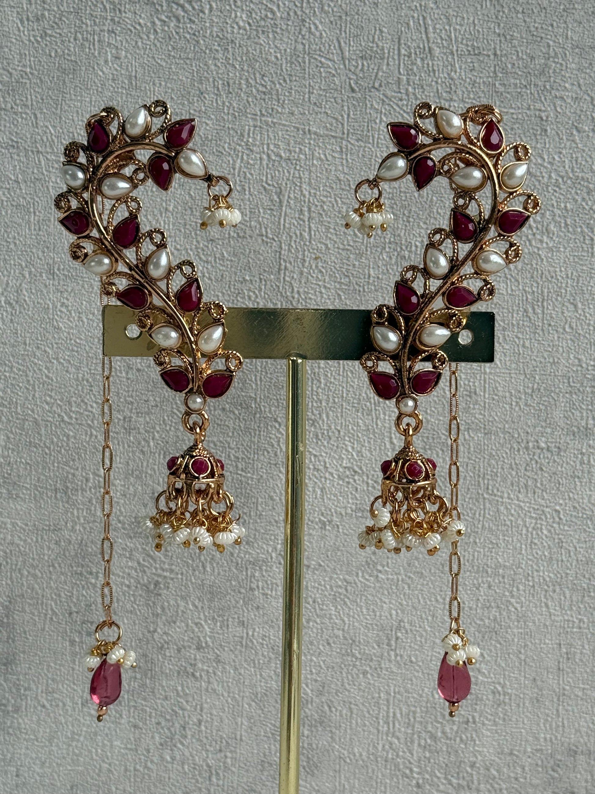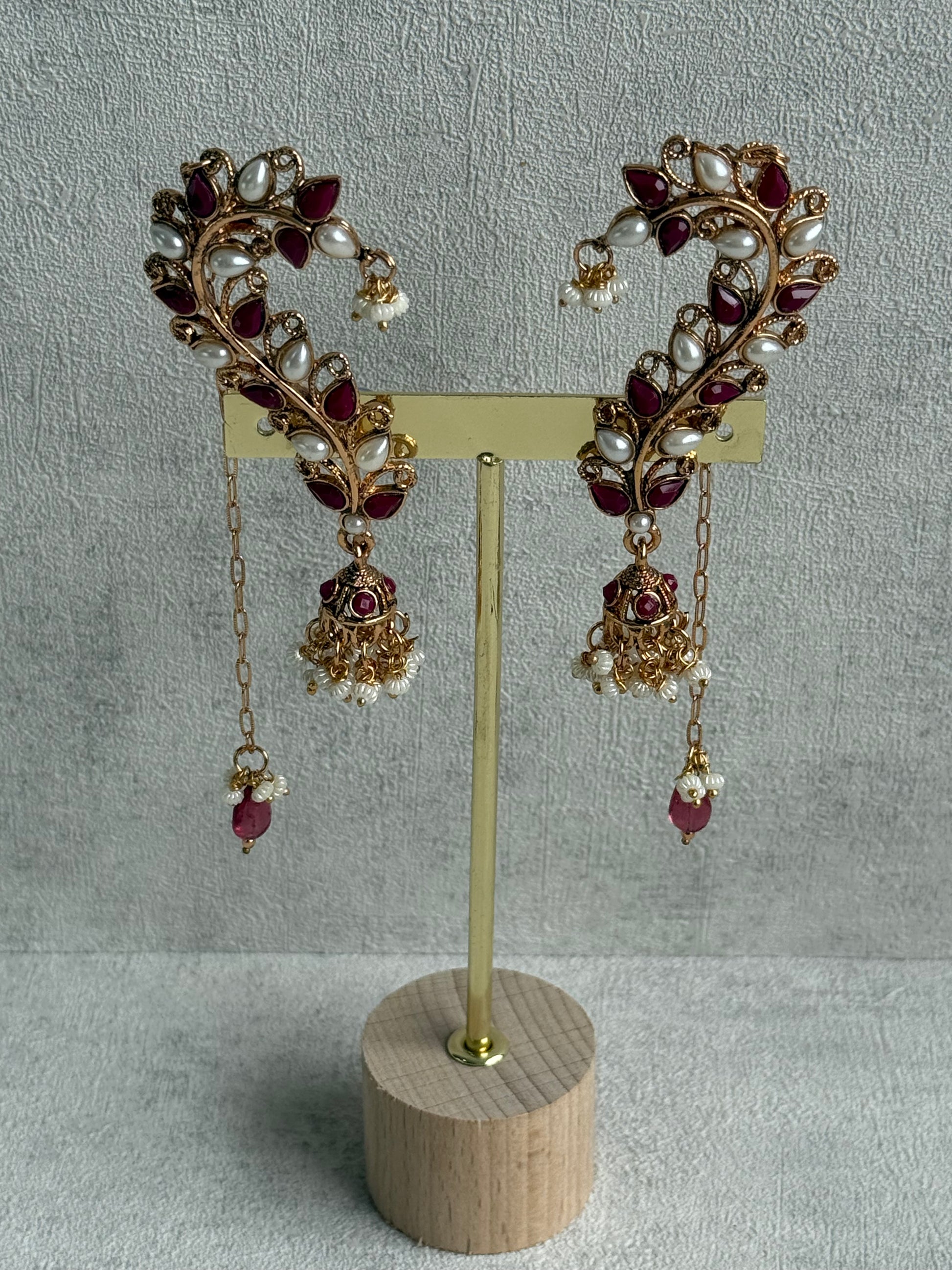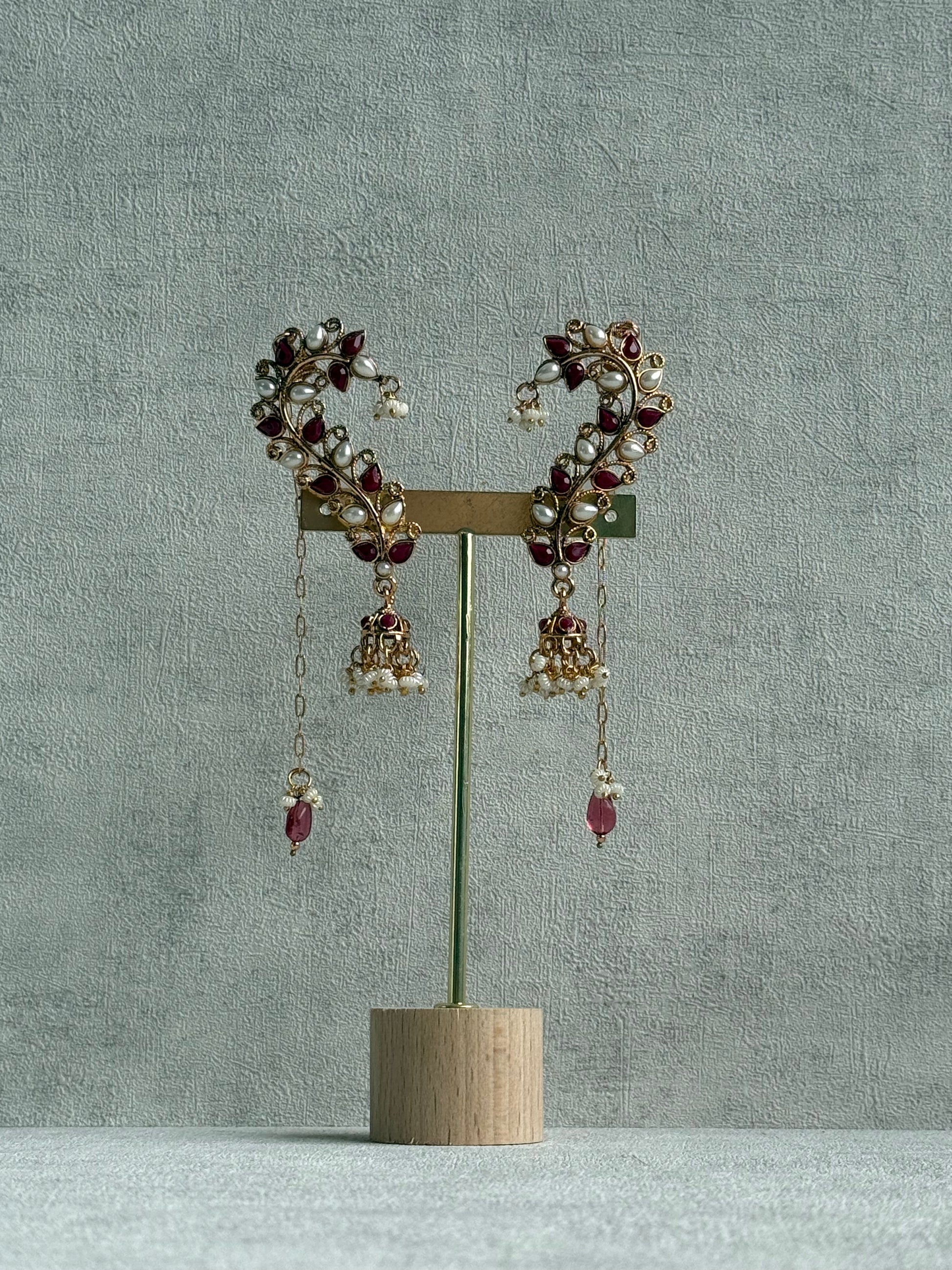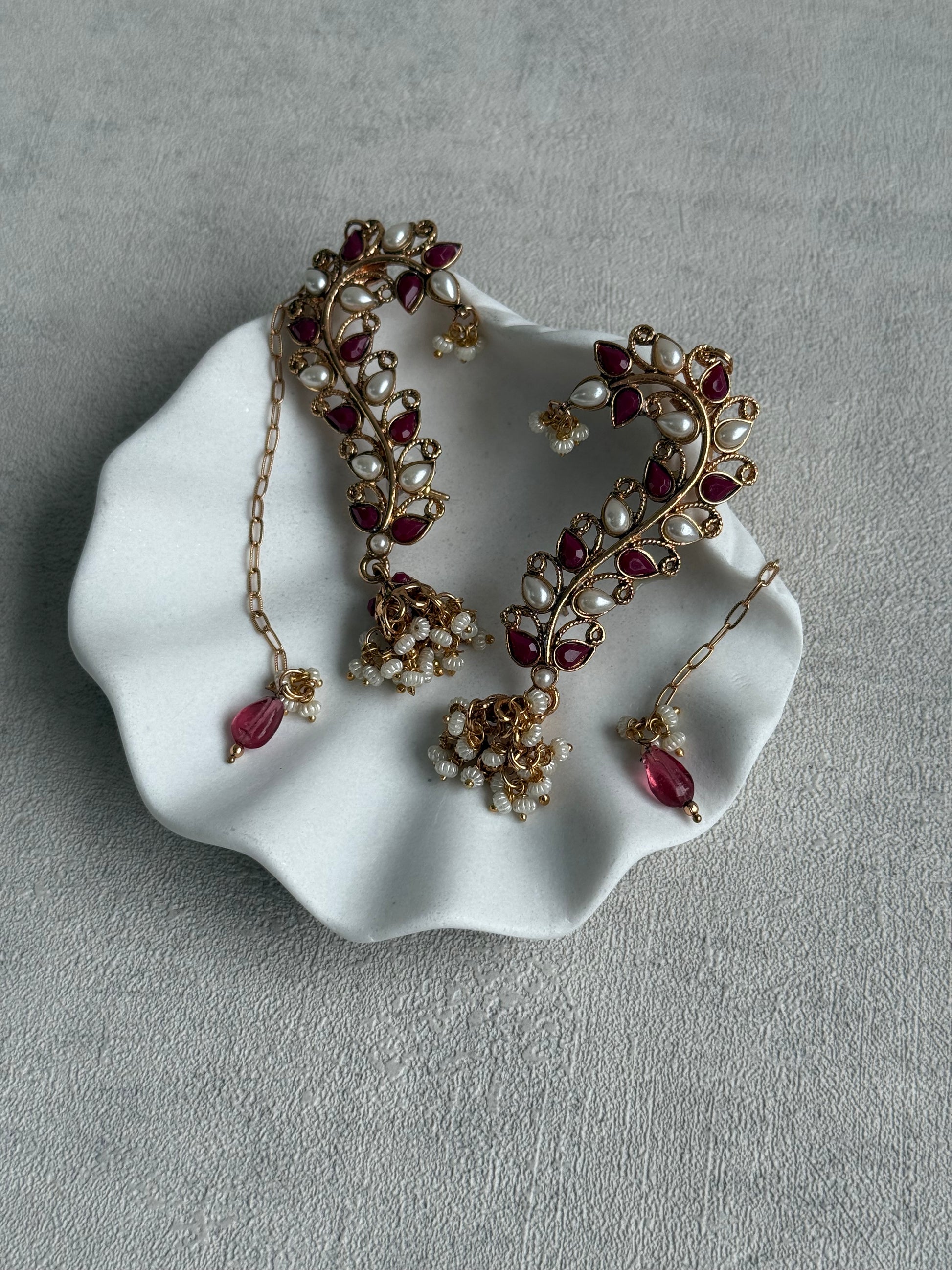Suspended from the end of each ear climber is a delicate jhumki, adorned with tiny pearl clusters and a single ruby bead drop. A slim gold chain drapes elegantly to the back, allowing the piece to sit securely while adding a soft movement that catches the light with every turn.