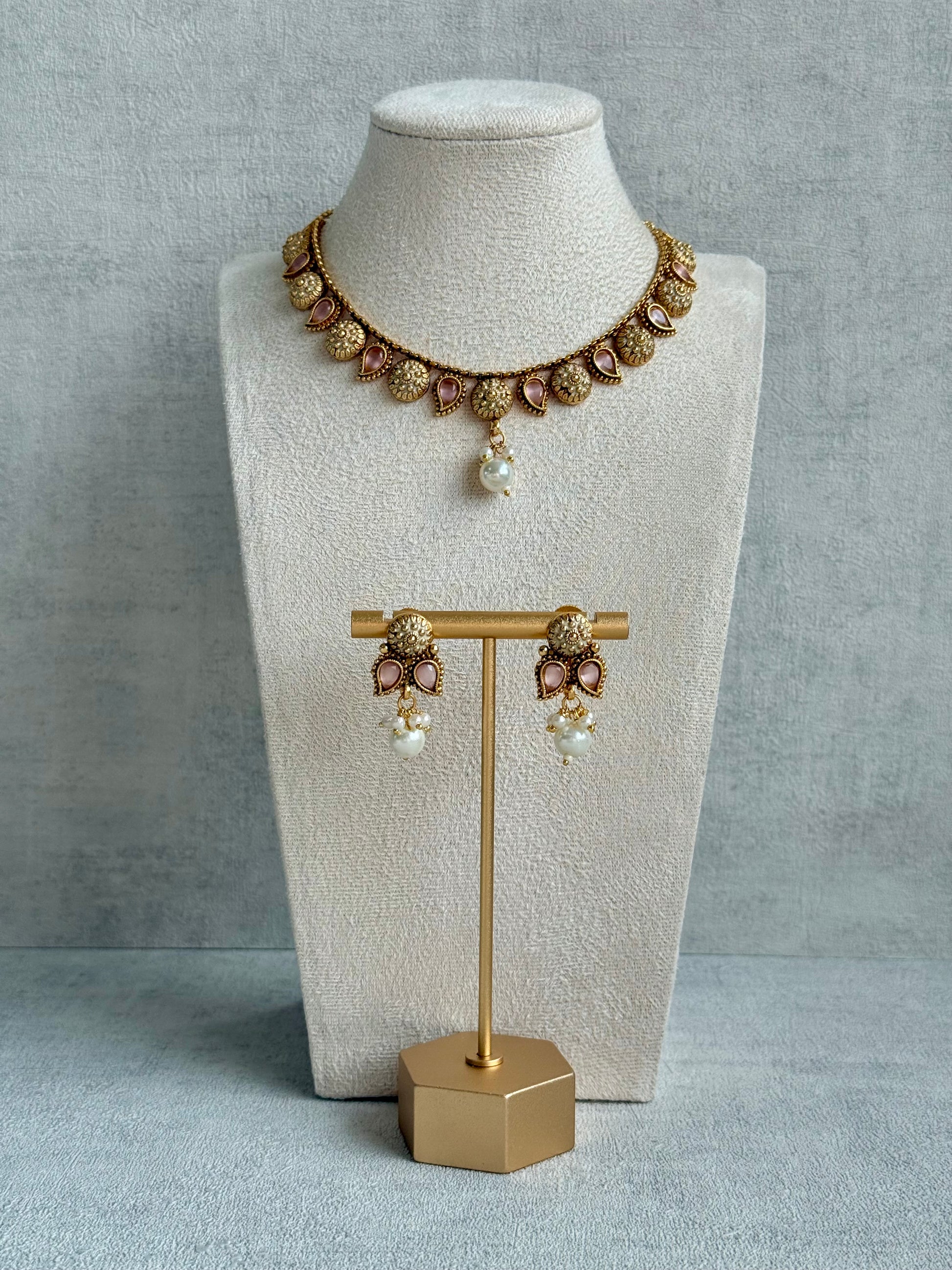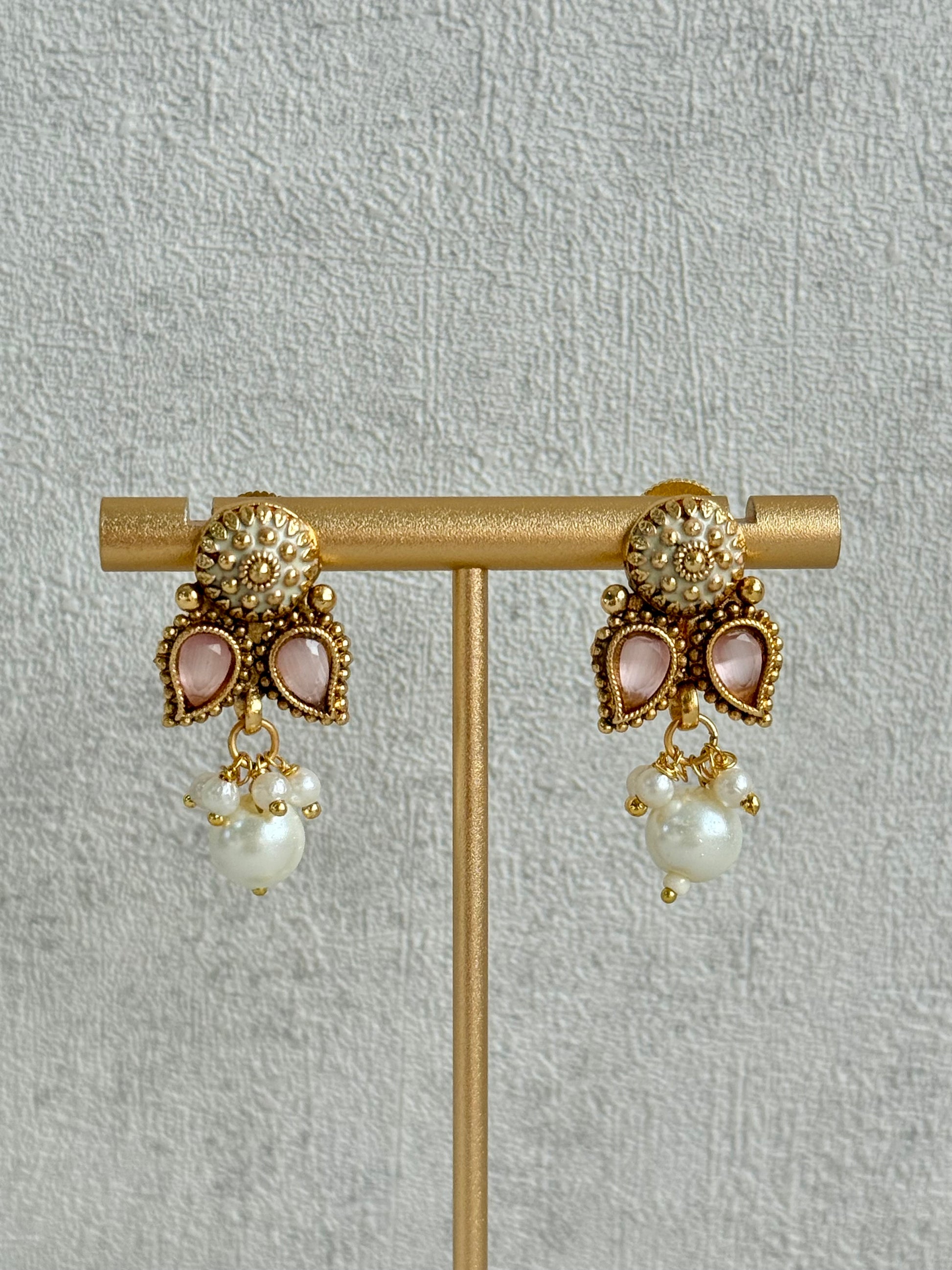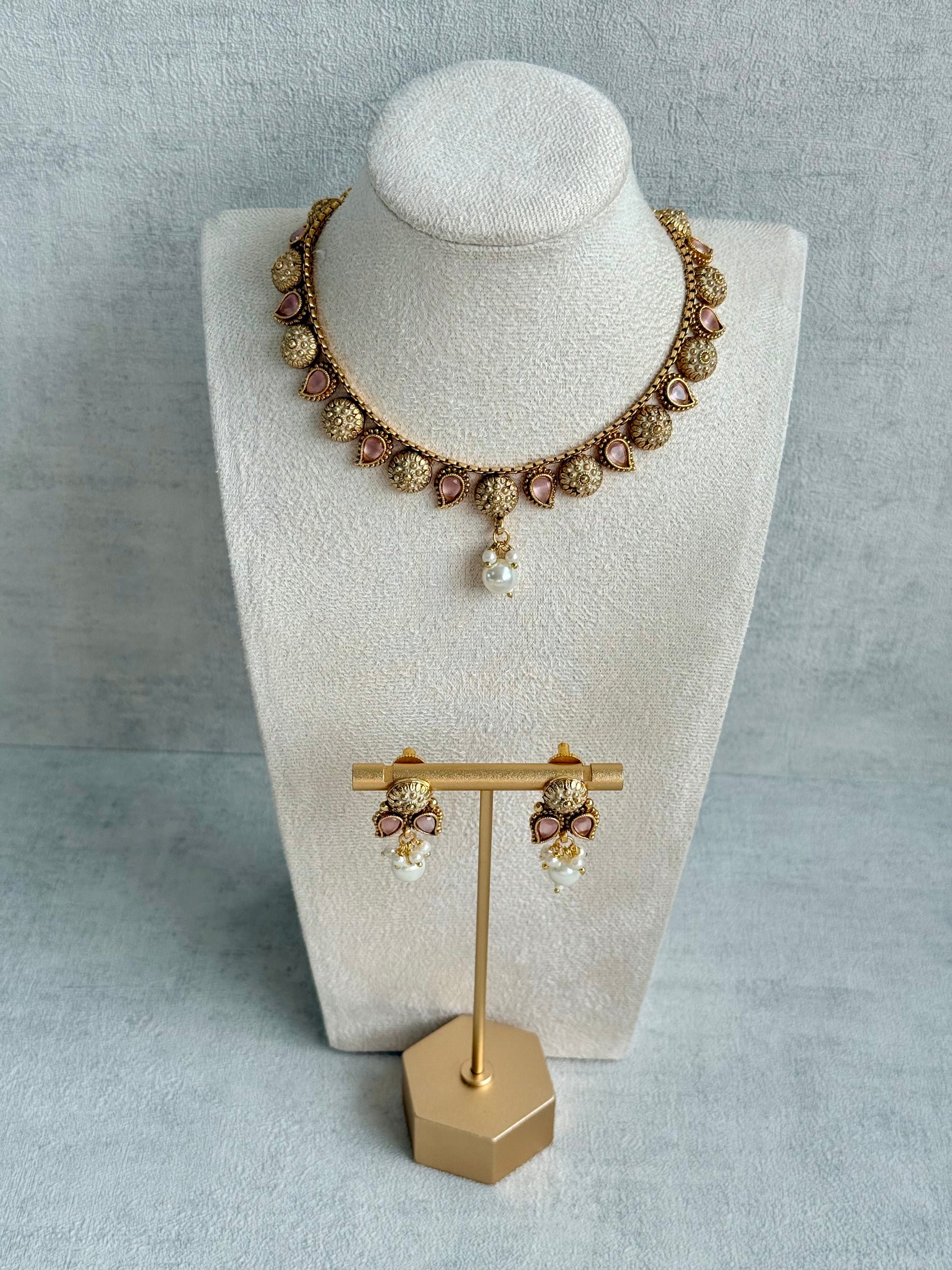 A central pearl drop adds a gentle statement, enhancing the overall softness of the piece. The matching earrings echo the same blush pink accents and intricate detailing.