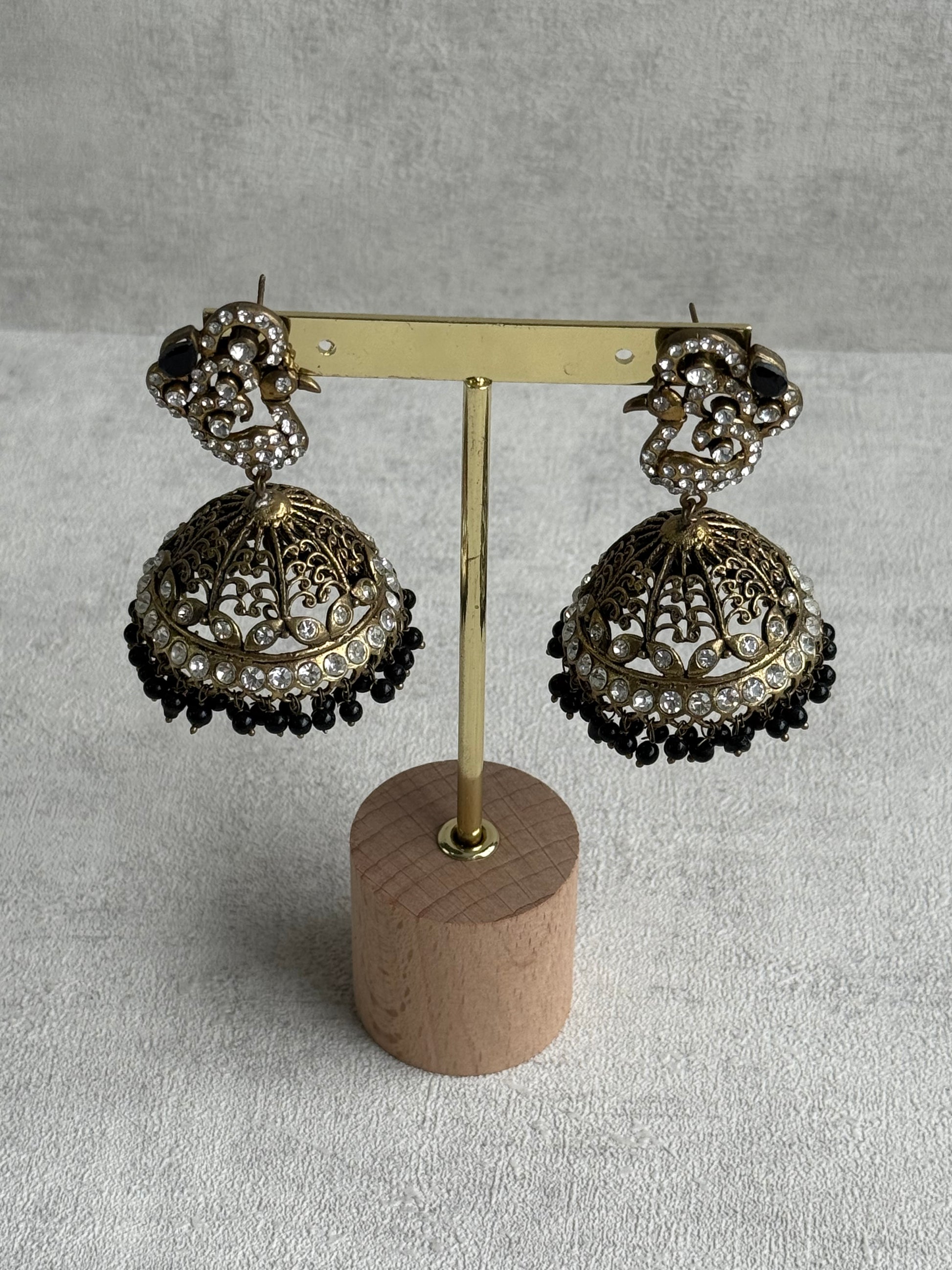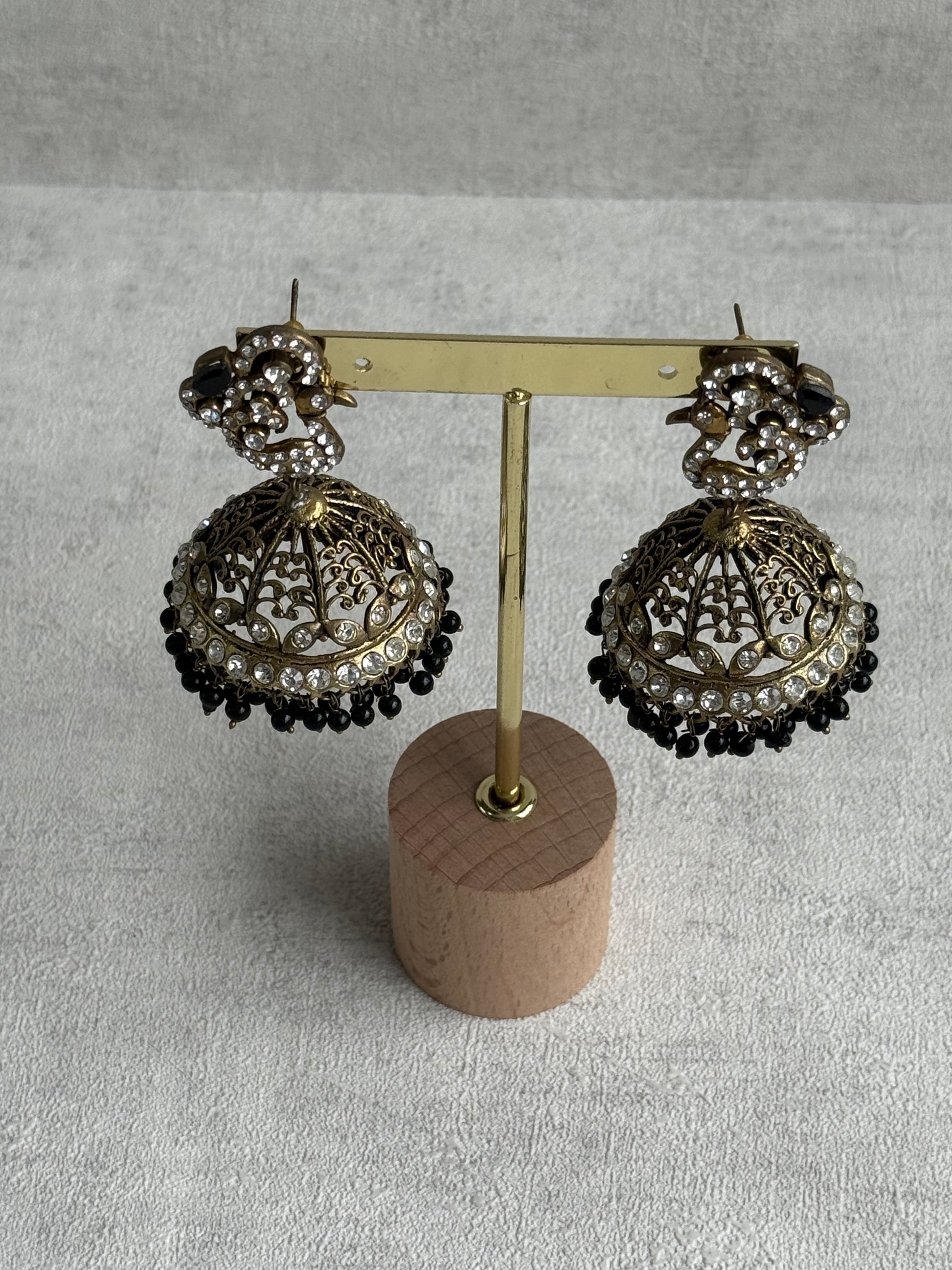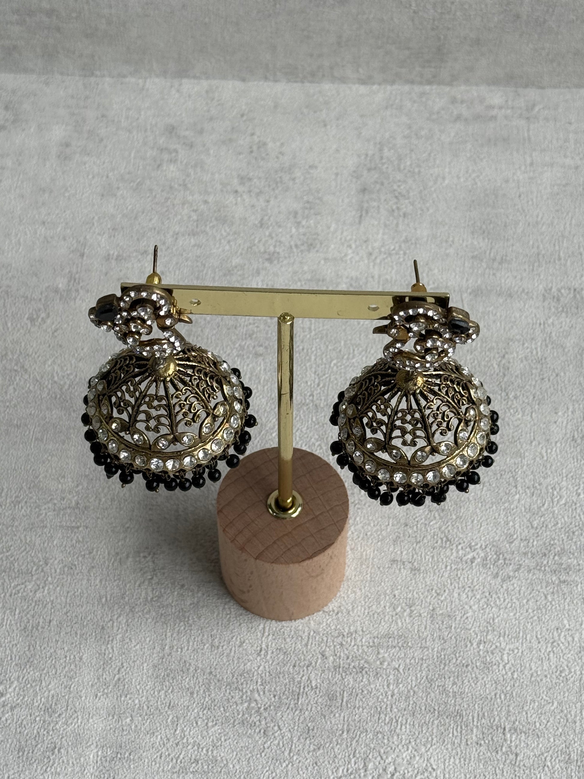 The dome-shaped jhumkis are embellished with intricate filigree work and framed by a halo of sparkling crystals. Along the edge, tiny black beads add a bold, elegant finish — evoking the sophistication of vintage heirlooms with a contemporary twist.