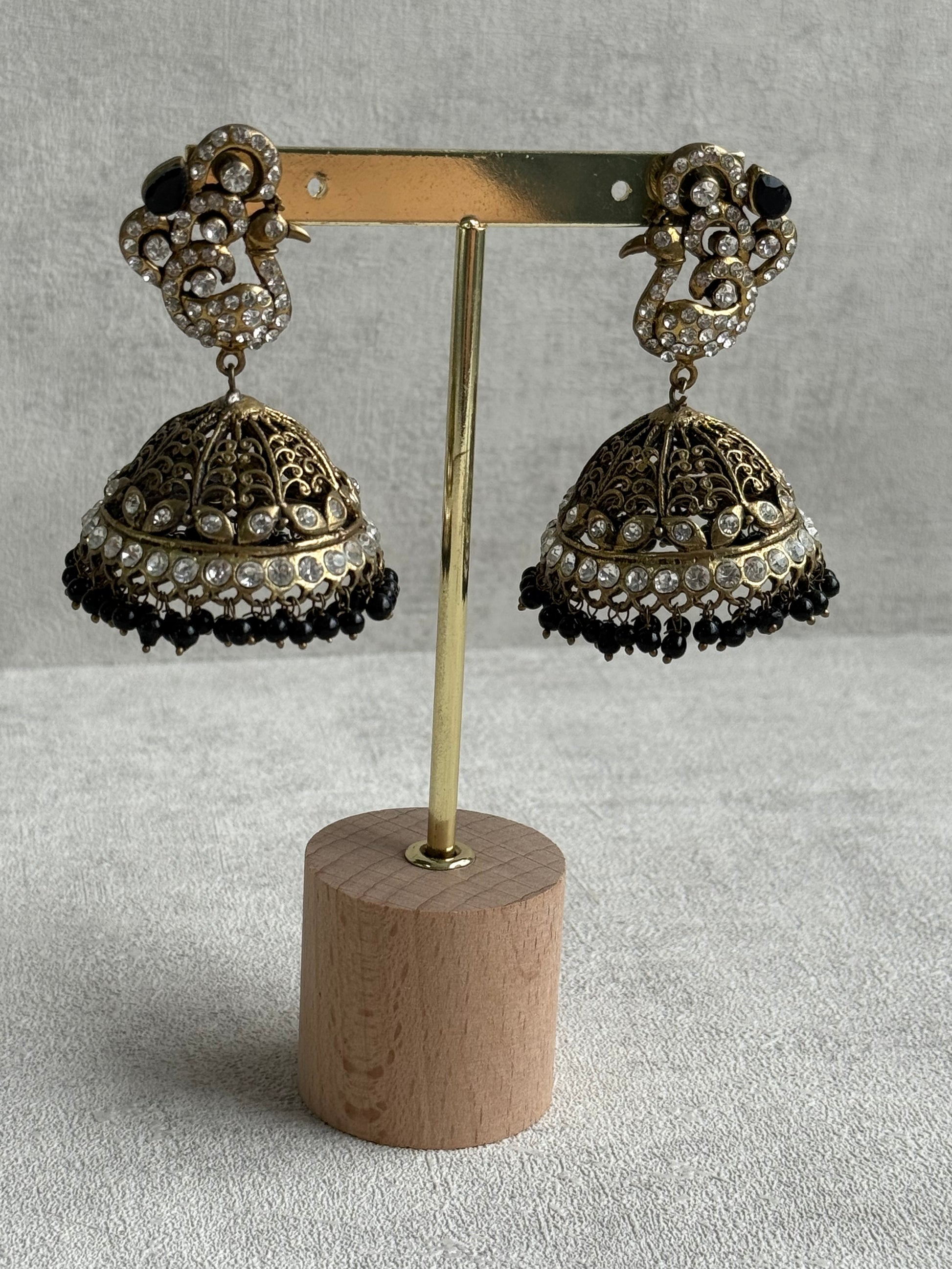 The Ayura Designs Mayurika Jhumkis are where regal artistry meets timeless allure. Crafted in an antique gold finish, these statement earrings feature a graceful peacock motif at the top — symbolising beauty, pride, and eternal grace. Each peacock is adorned with shimmering crystal stones and a deep onyx accent that adds a captivating contrast to the golden tones beneath.