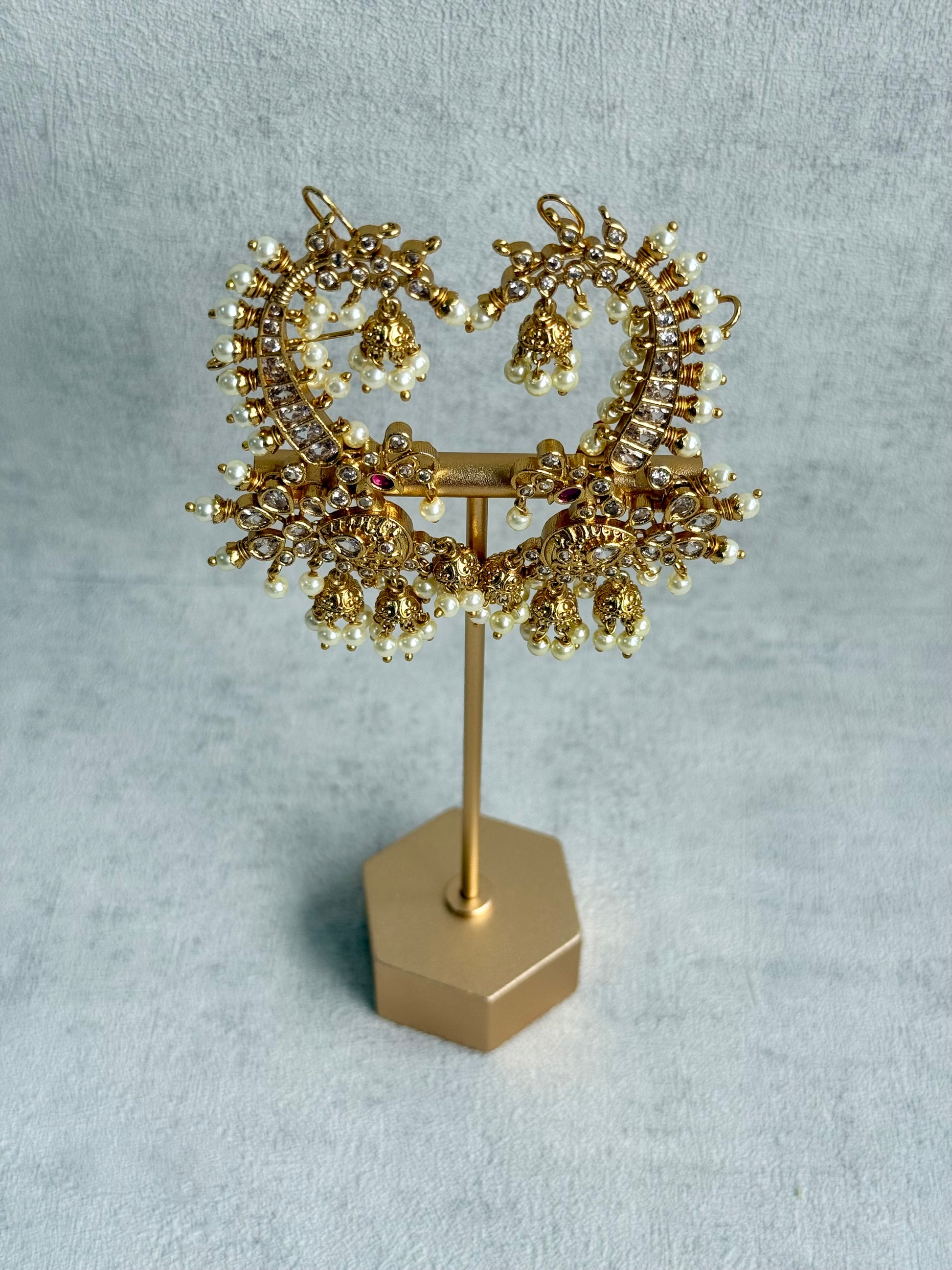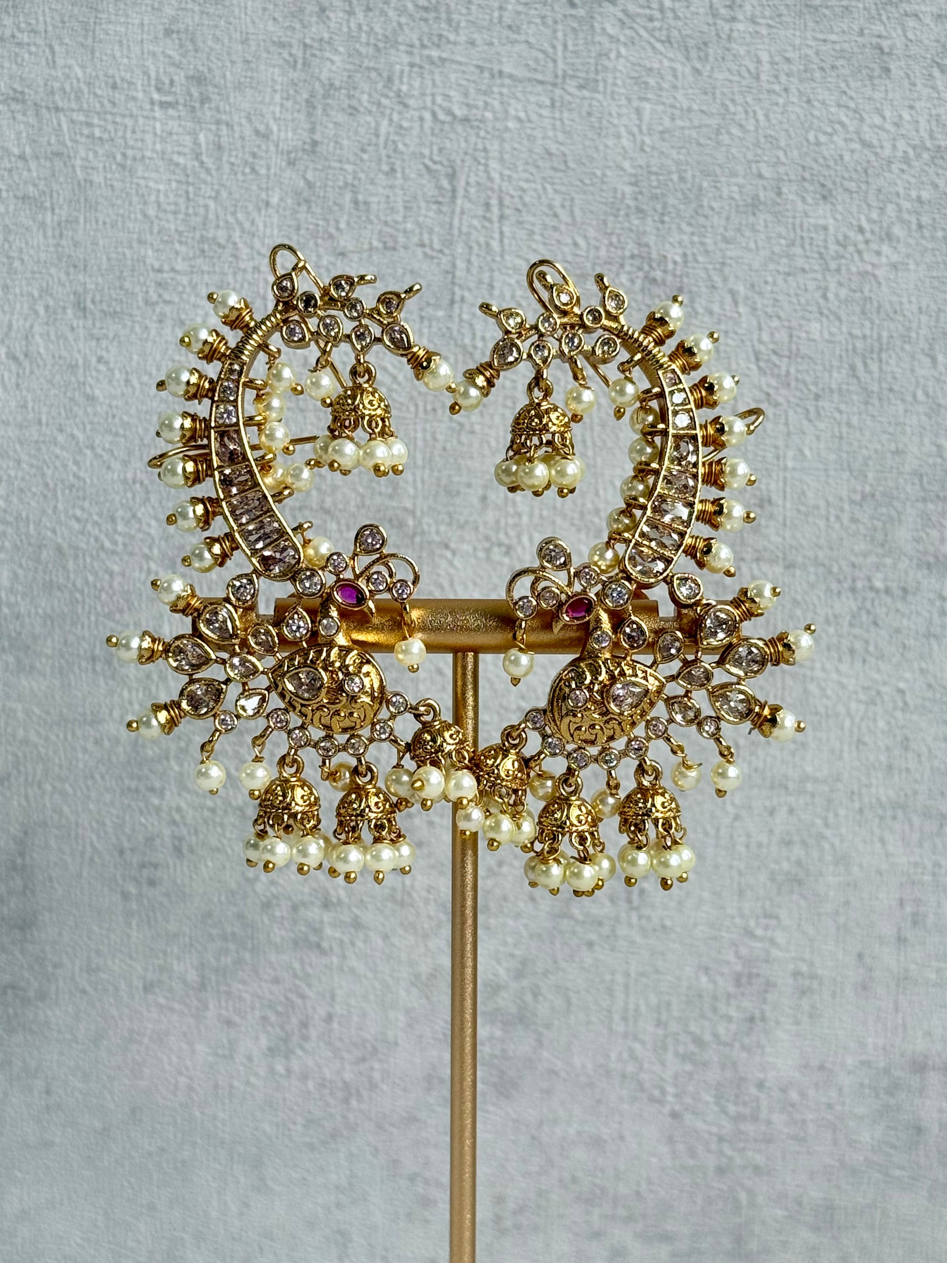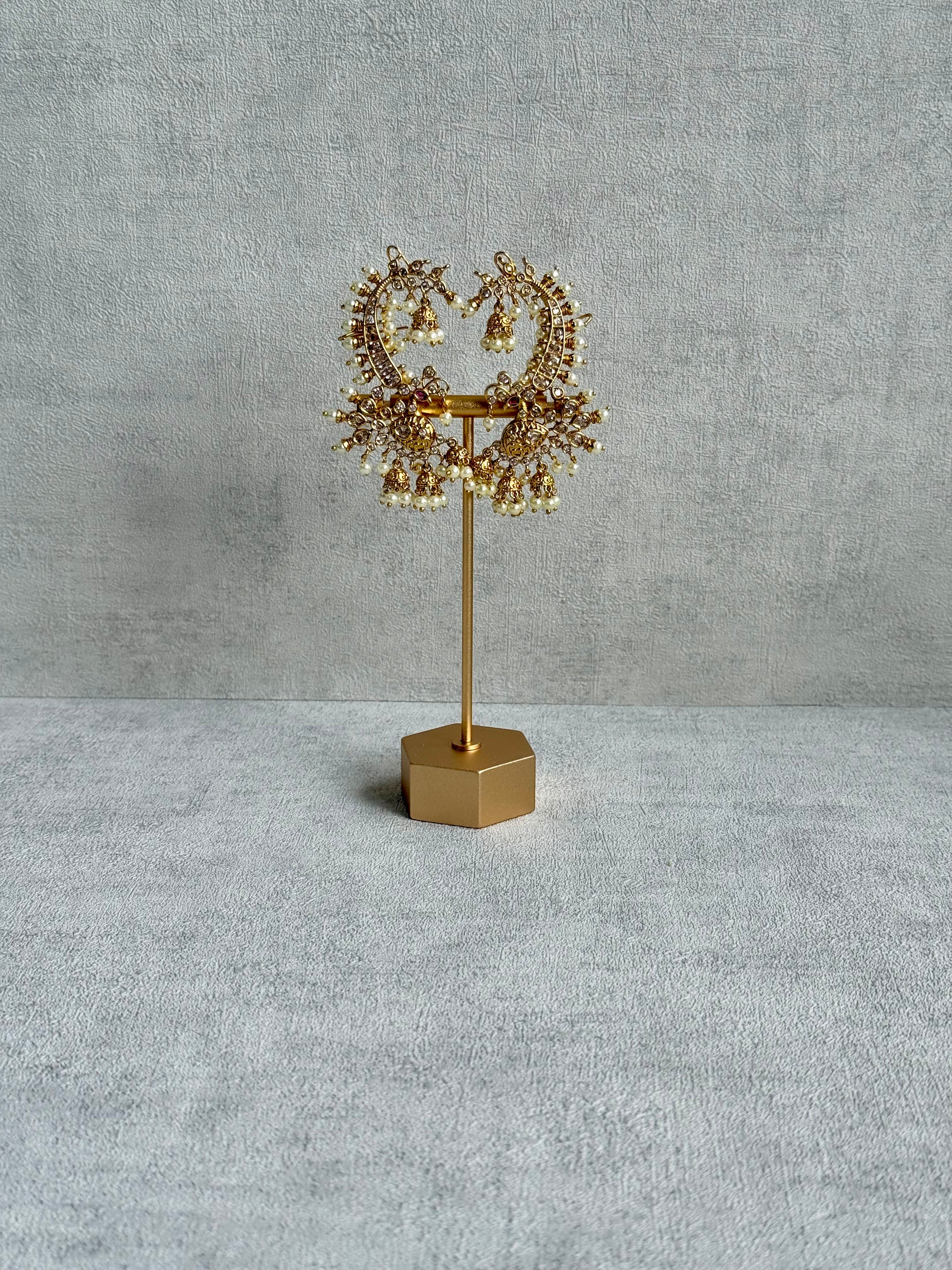 The look is completed with cascading pearl jhumka drops, bringing movement, softness, and traditional charm. Ideal for weddings, festive occasions, and statement styling, the Megha earrings are designed for those who appreciate bold heritage-inspired jewellery with fine detailing.