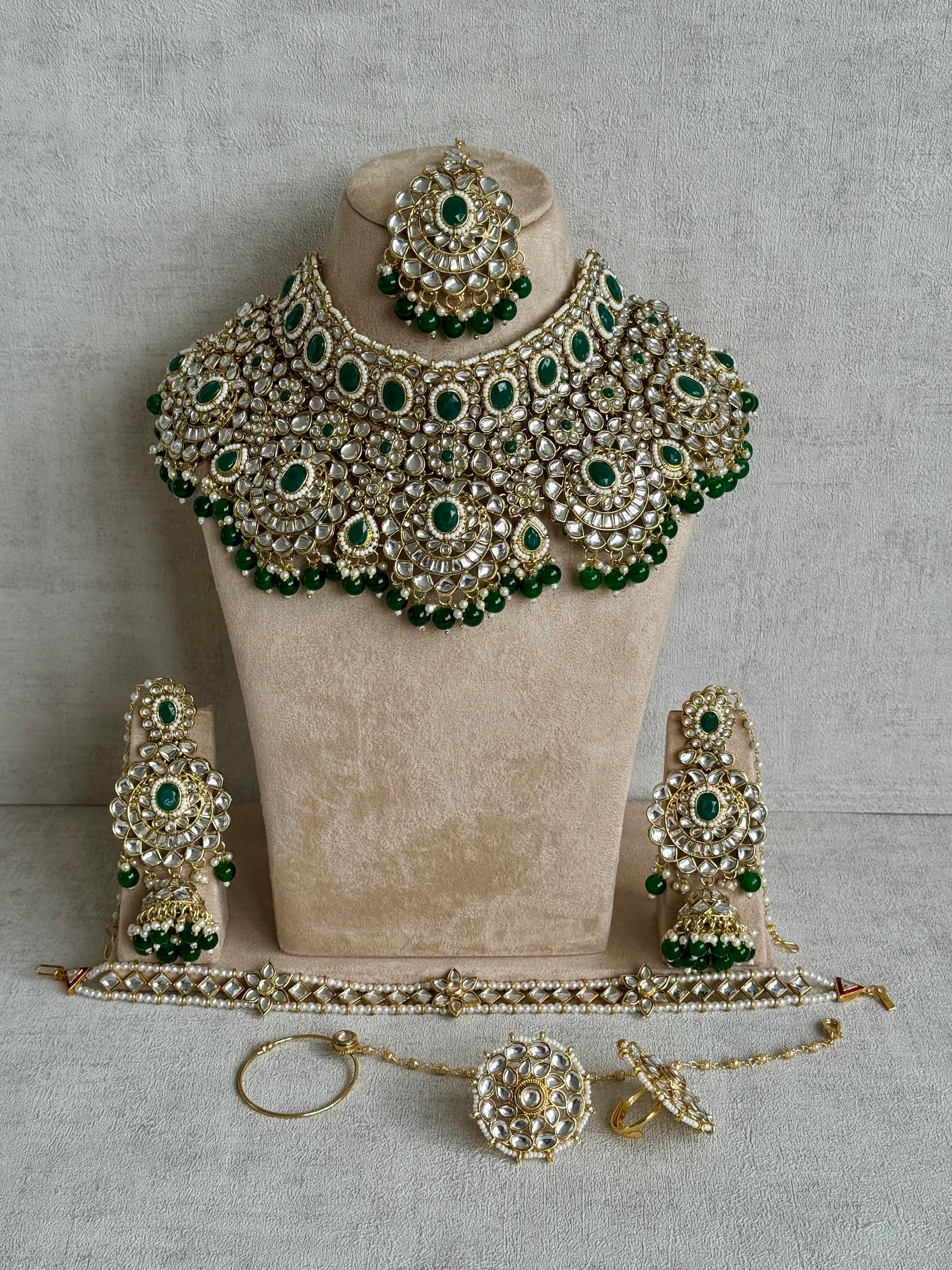 Each element is adorned with mirror-cut Polki stones framed by luminous ivory pearls and rich emerald green stone accents, all set in a classic antique gold finish. The necklace is an opulent choker-style masterpiece, with layers of floral Polki motifs surrounded by oval emerald centres and detailed pearl embellishments. Bold and symmetrical, it wraps the neckline like a coronet of Mughal elegance, finished with vibrant emerald green bead drops for added drama and depth.