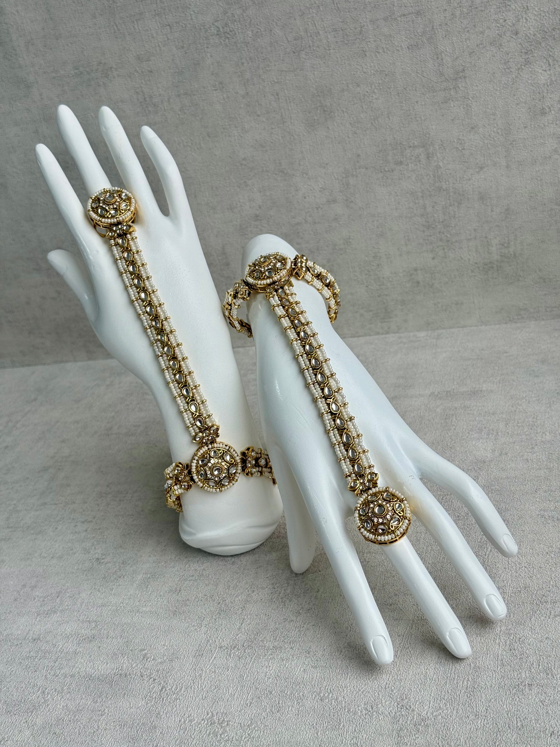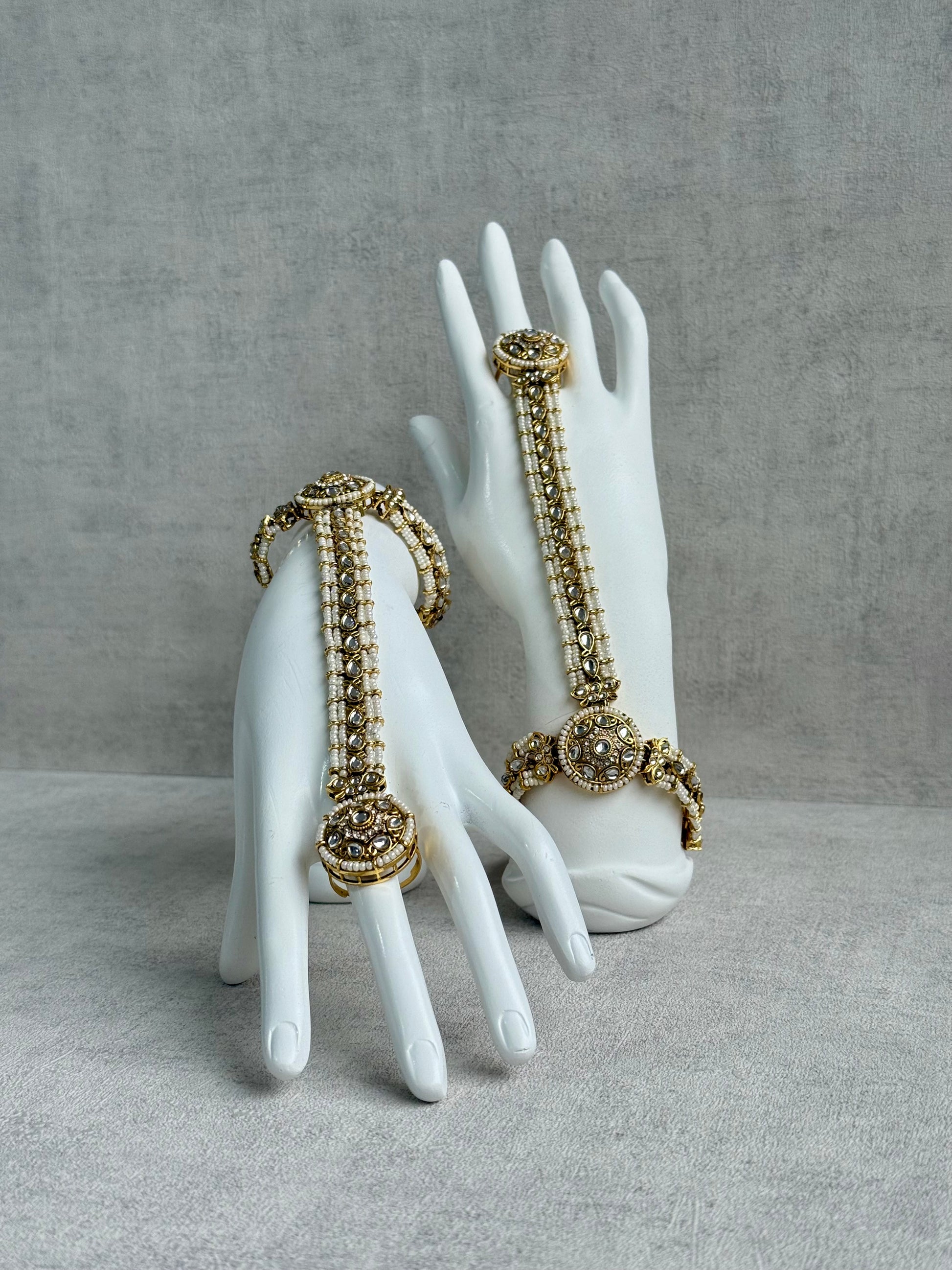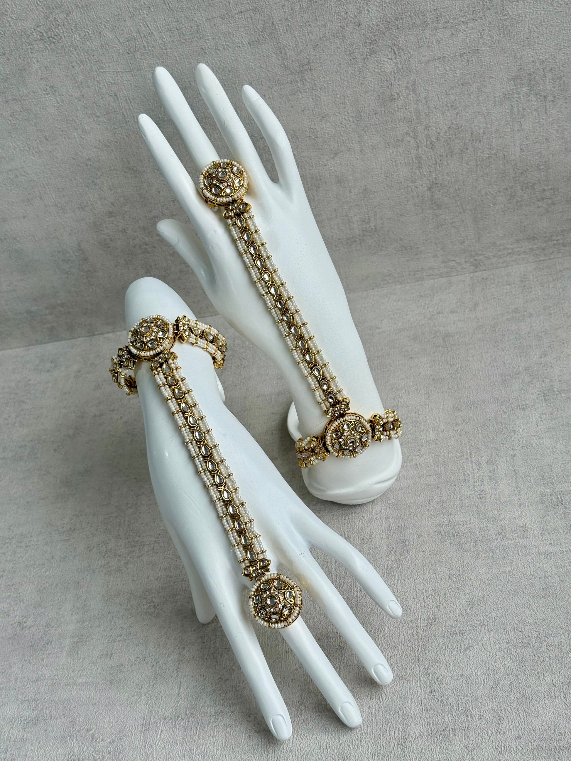 Featuring clear kundan-style stones set in an antique gold finish, the design flows seamlessly from the finger ring to the wrist, creating a graceful silhouette across the hand. Fine pearl accents line the structure, adding texture and a delicate glow without overpowering the design.
