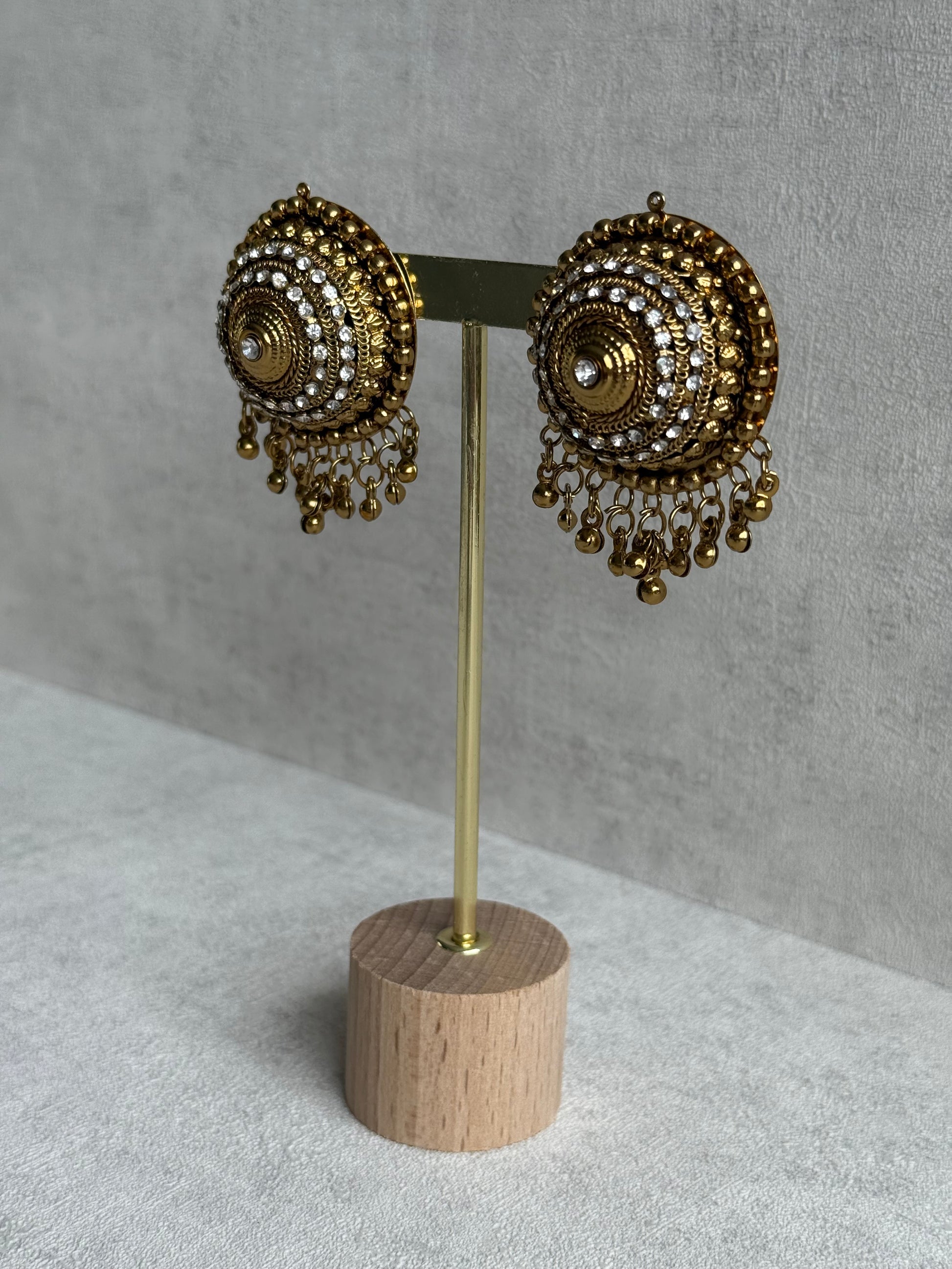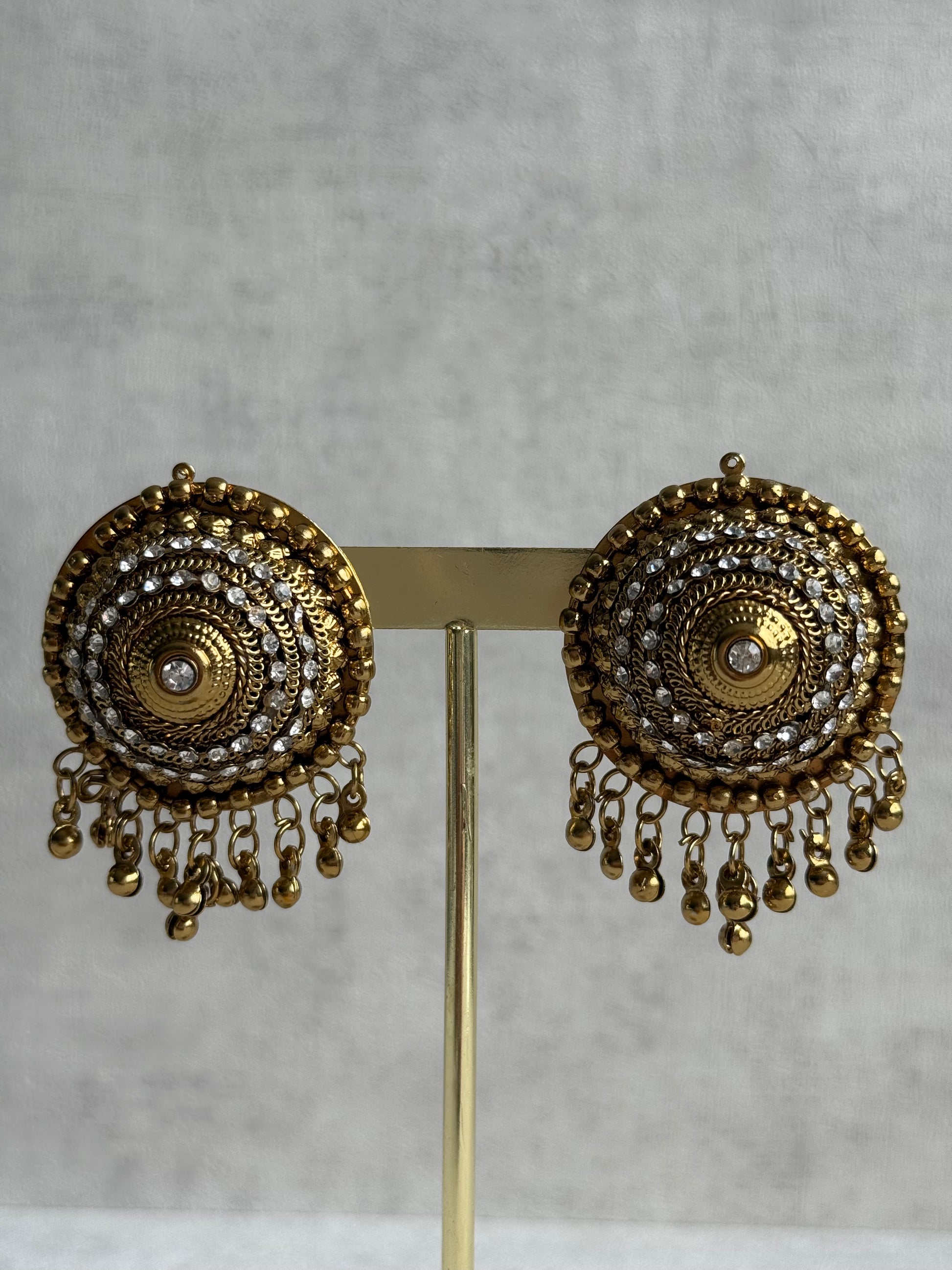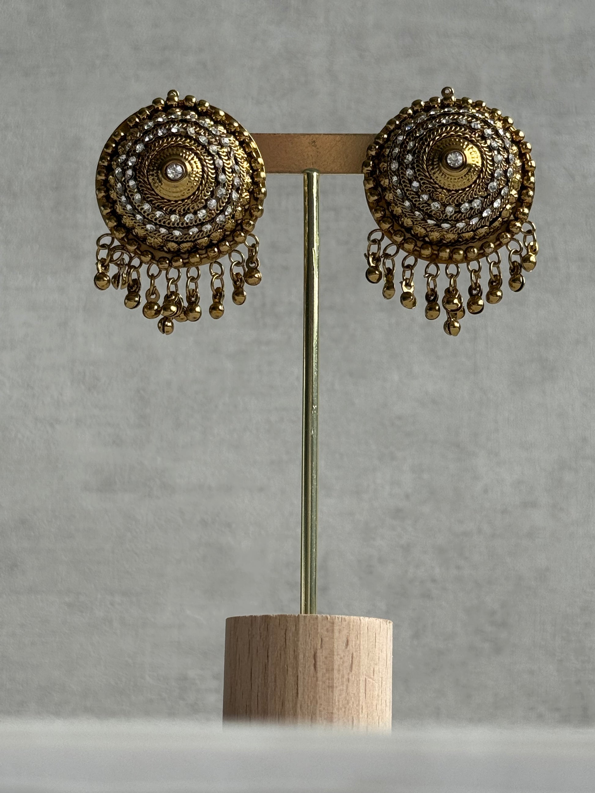 Ayura Designs Mitwa Earrings – Antique Gold Studs with Crystal Stones & Ghungroo Fringe