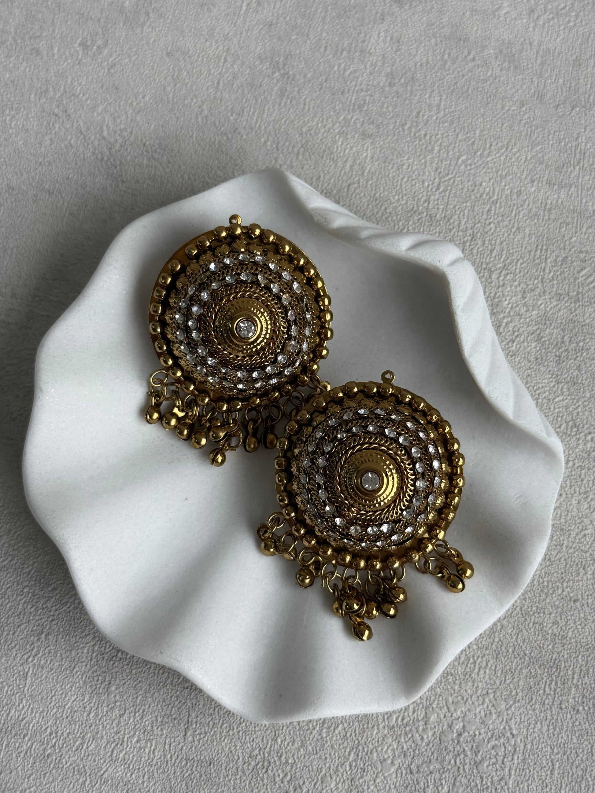 The Ayura Designs Mitwa Earrings radiate timeless allure with their antique gold finish and intricate circular design. Each stud is beautifully encrusted with shimmering crystal stones, layered in concentric rings that catch the light from every angle.
