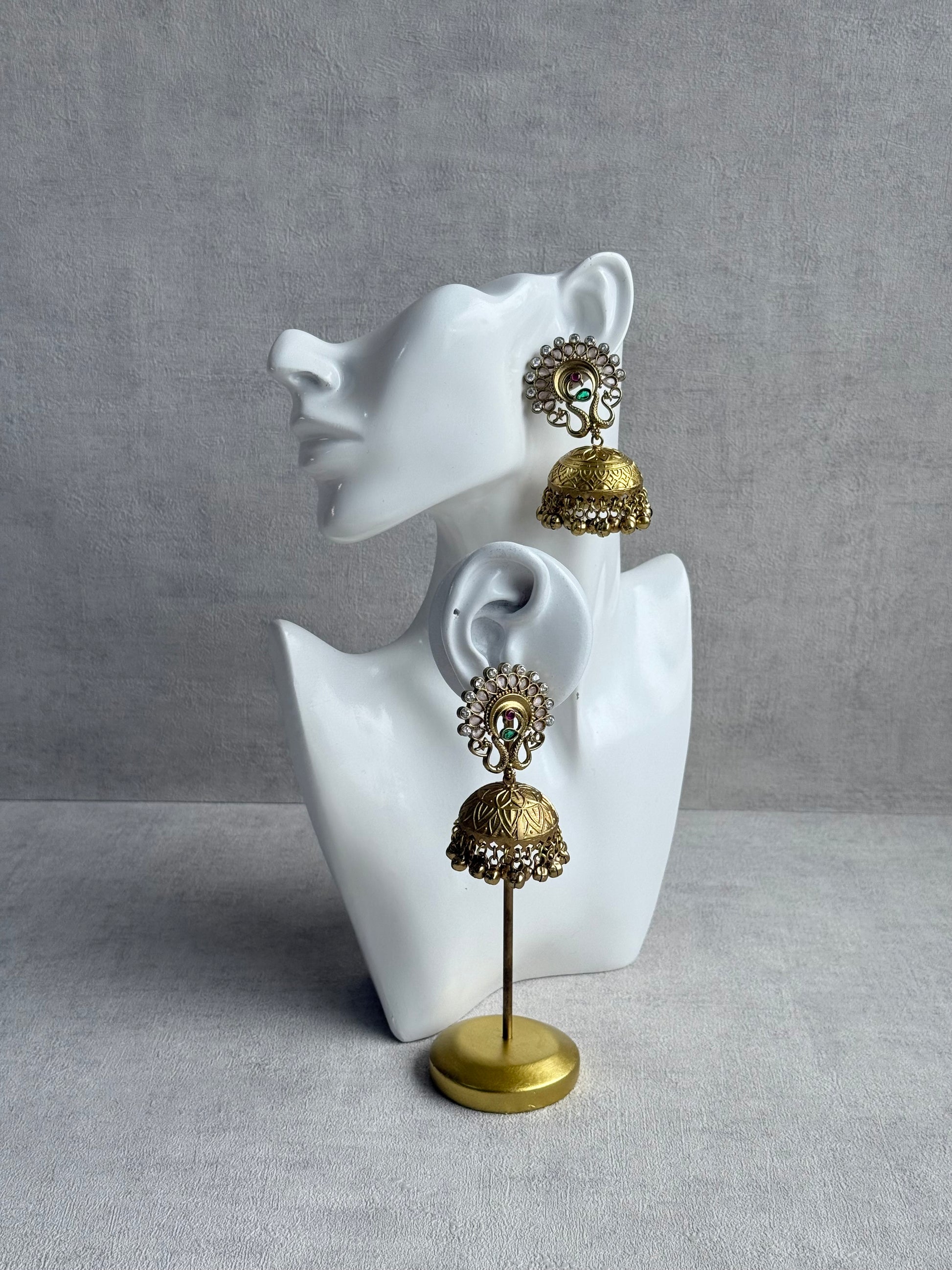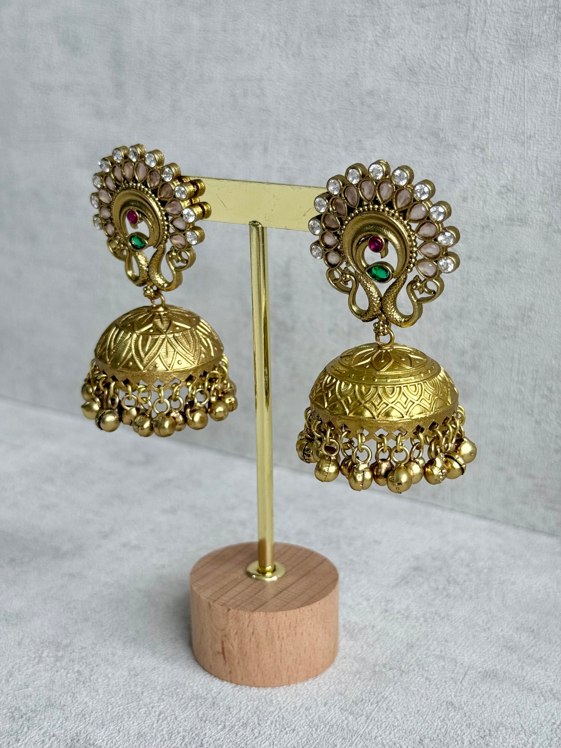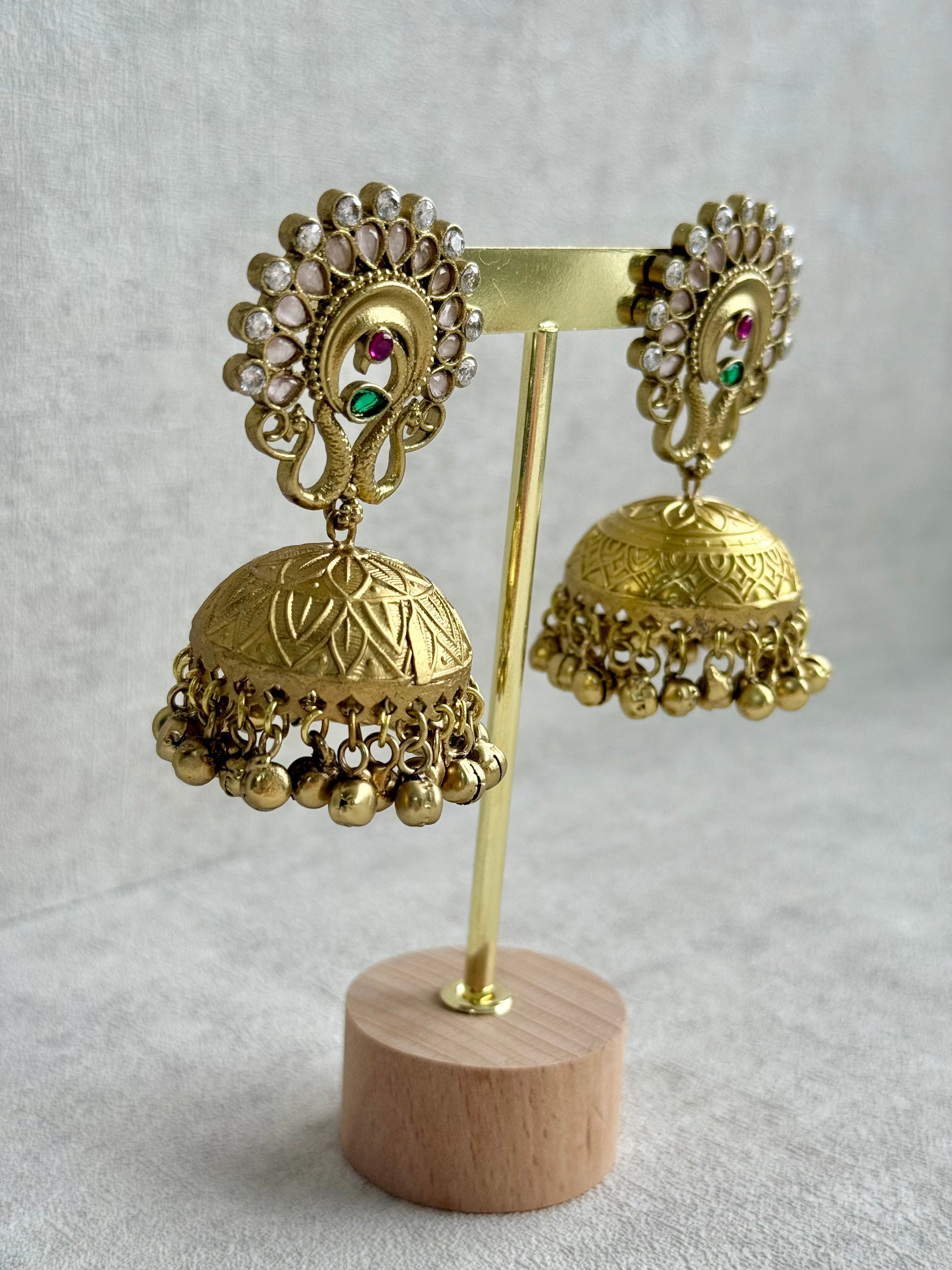 The Moraya Jhumkis are a striking blend of heritage craftsmanship and soft feminine tones. Designed in an antique gold finish, these statement earrings feature intricate peacock motifs adorned with blush pink accents and delicate crystal detailing, creating a beautifully balanced traditional look.