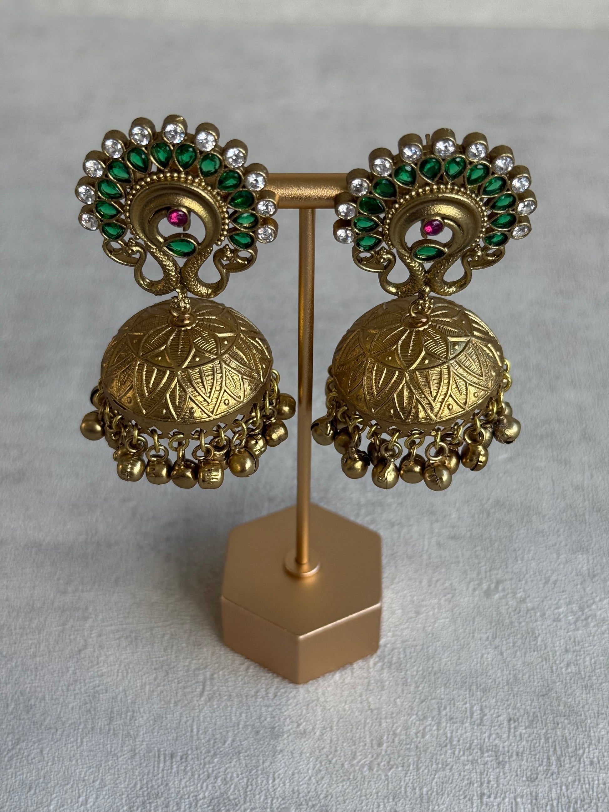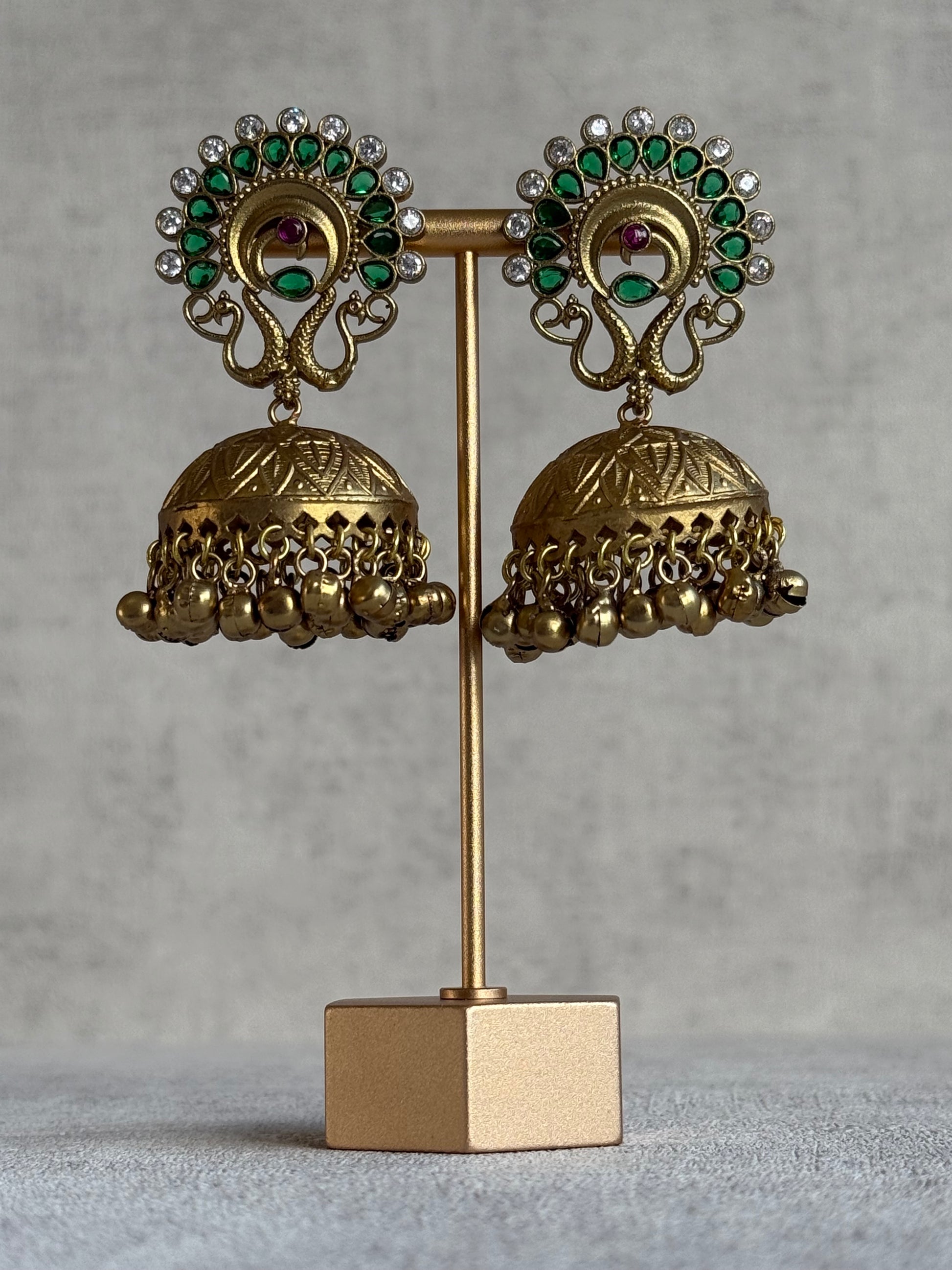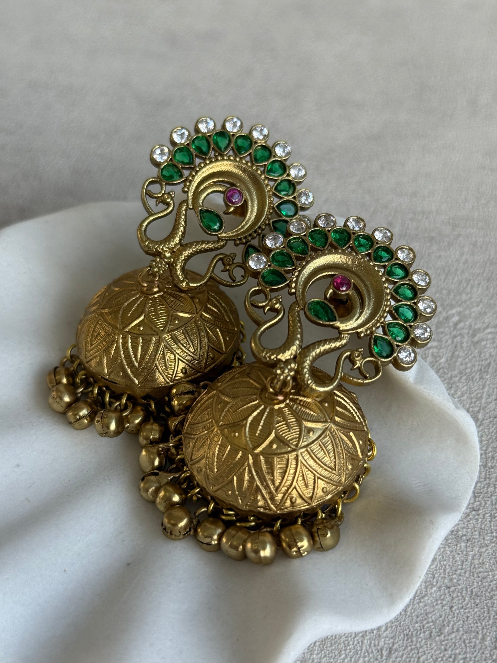 Ayura Designs Moraya Jhumkis – Emerald Green Peacock Motif with Antique Gold Detailing