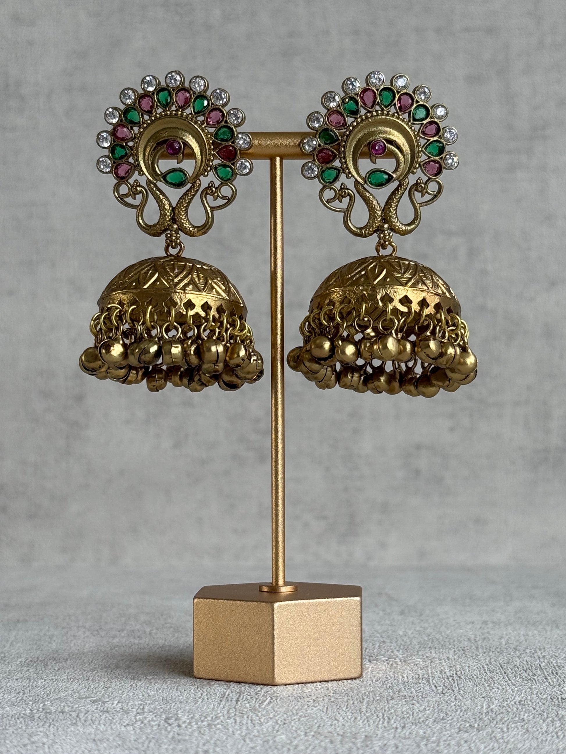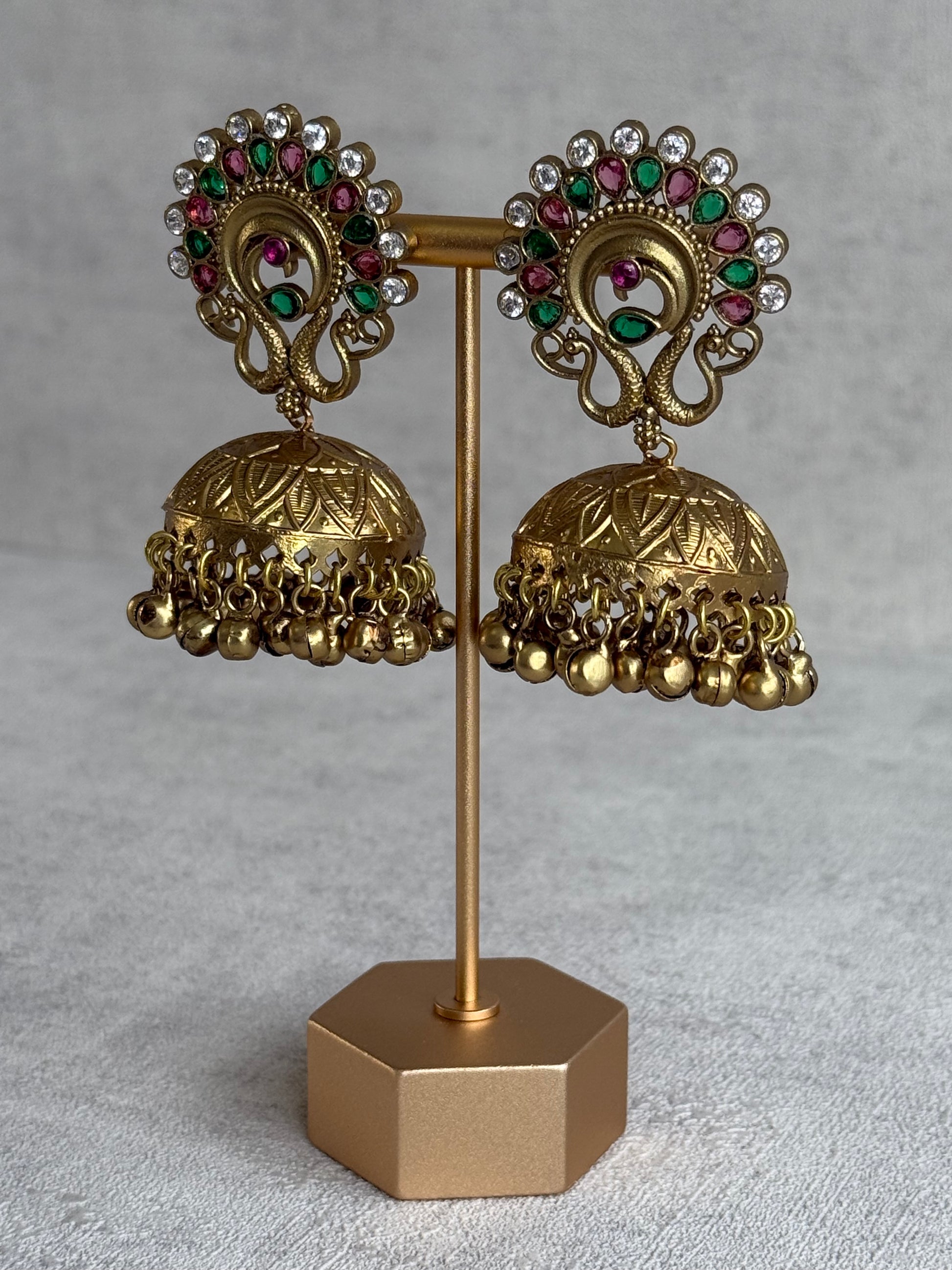 Each earring features a delicately carved peacock fan motif at the top, framed with antique gold detailing that enhances the rich colours. The dome is finished with tiny ghungroo accents, adding a gentle movement and traditional charm.