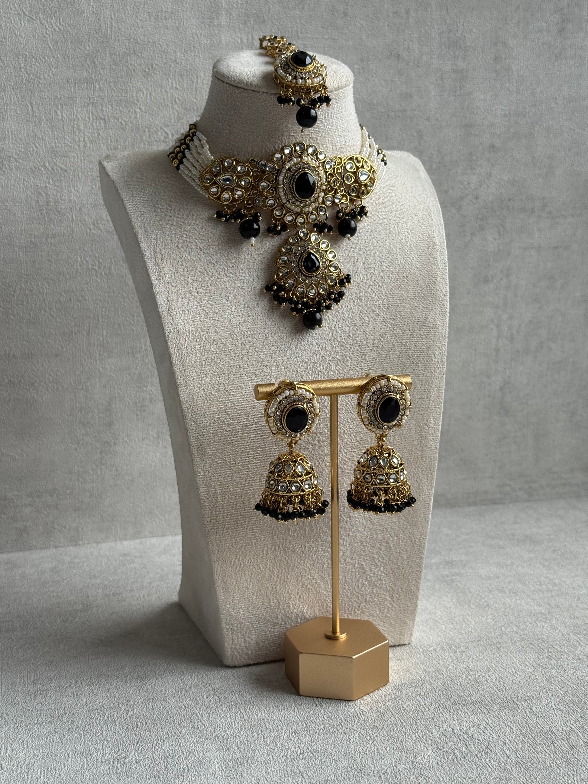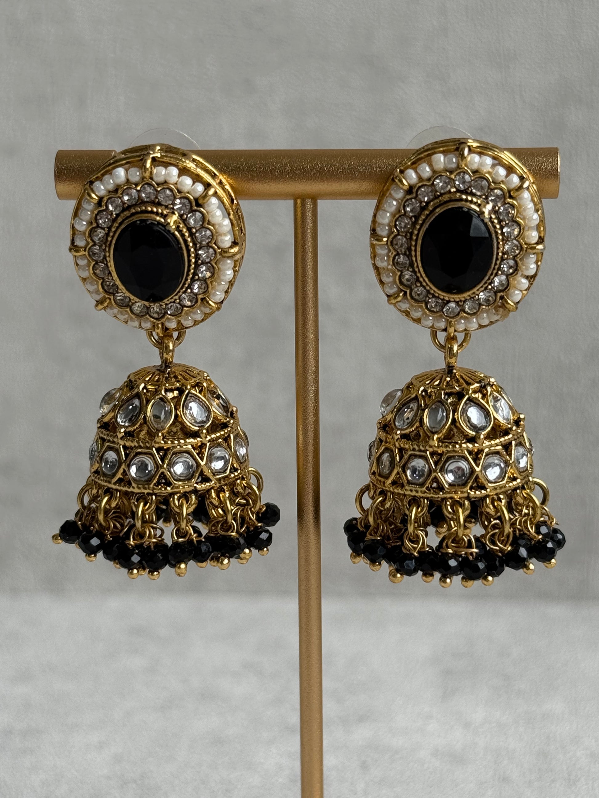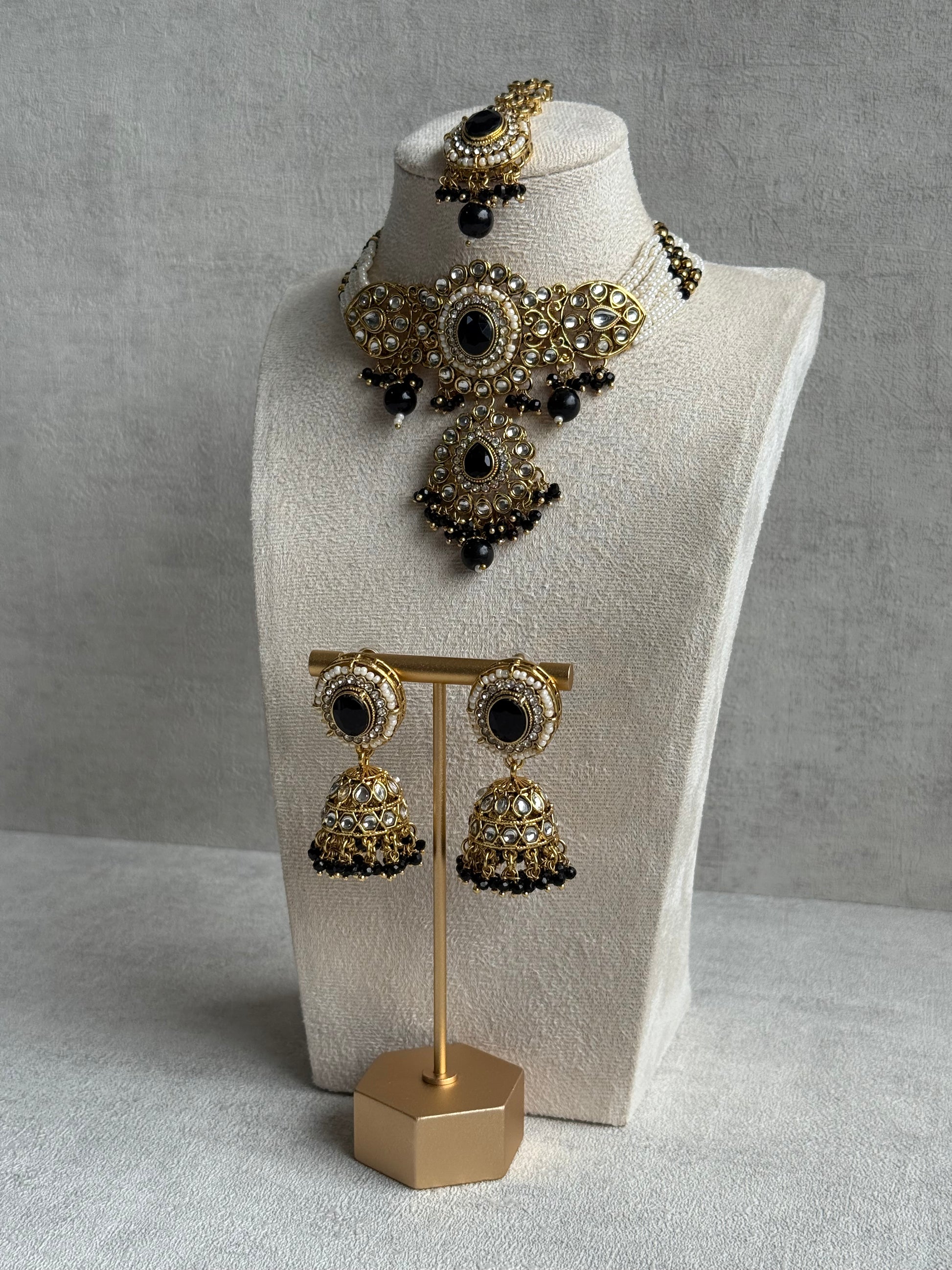 The matching jhumkis carry the same balance of opulence and edge — antique gold domes lined with reflective Kundan stones and finished with rows of black bead clusters that sway gracefully with movement. The tikka mirrors this harmony, with a bold centre stone surrounded by pearls and Kundan detailing, perfectly framing the face.