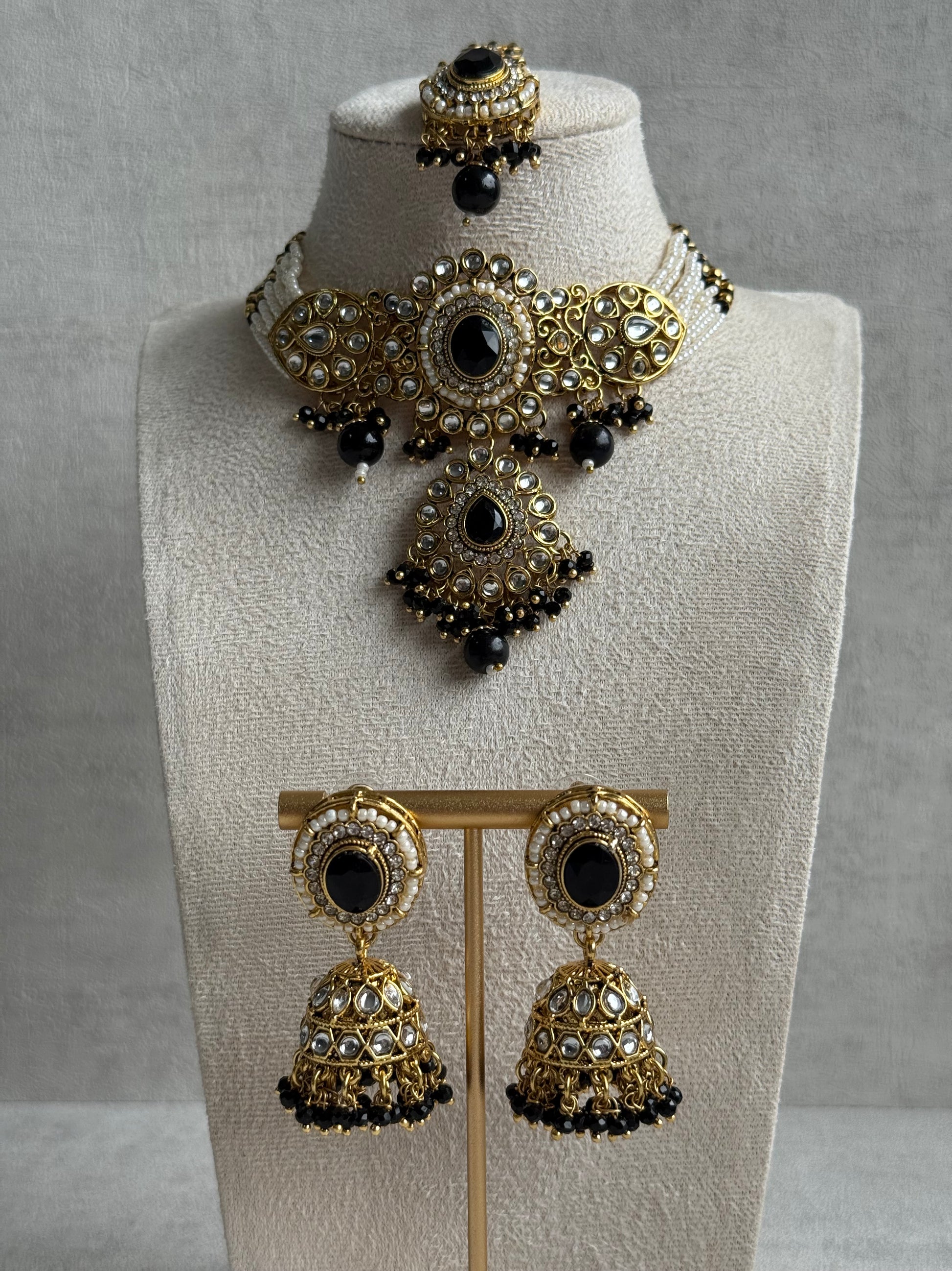 The Ayura Designs Muskaan Set in Black exudes timeless sophistication and bold elegance. Designed in a rich antique gold finish, this three-piece set — comprising a choker, jhumkis, and tikka — features lustrous Kundan stones, ivory pearl borders, and jet-black beads that add a touch of contemporary drama to traditional artistry. It’s the perfect fusion of heritage craftsmanship and modern glamour.