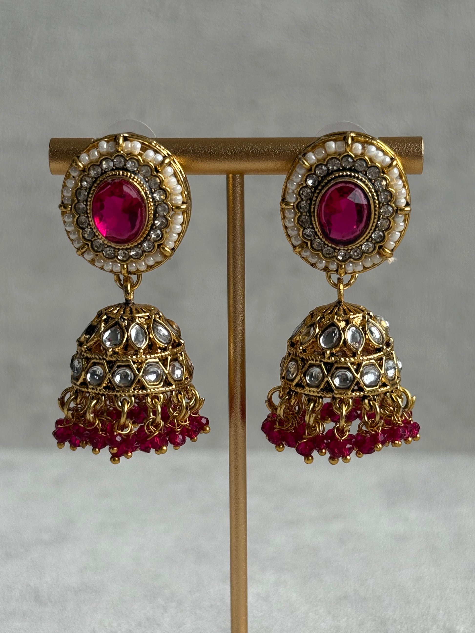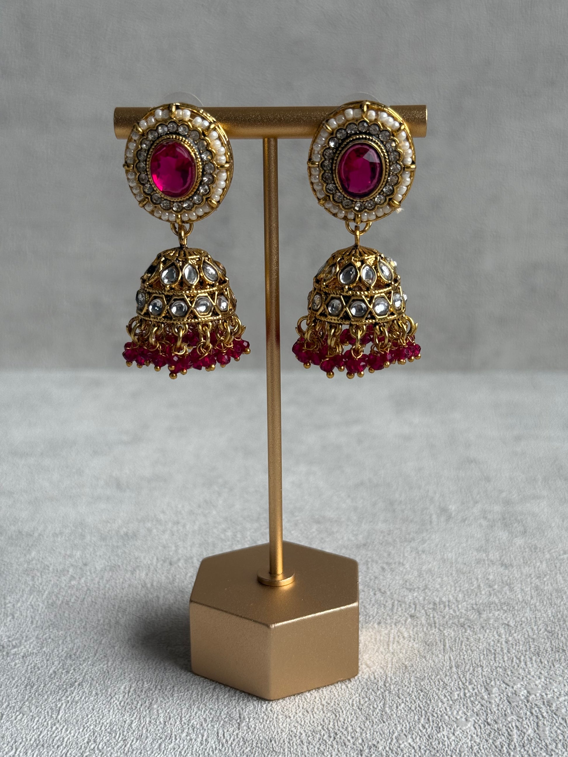 The jhumkis echo the same artistry, with domed Kundan patterns and a fringe of pearls and fuchsia beads that sway delicately with movement. The tikka completes the set with its statement centrepiece, reflecting sophistication and grace while beautifully illuminating the face.