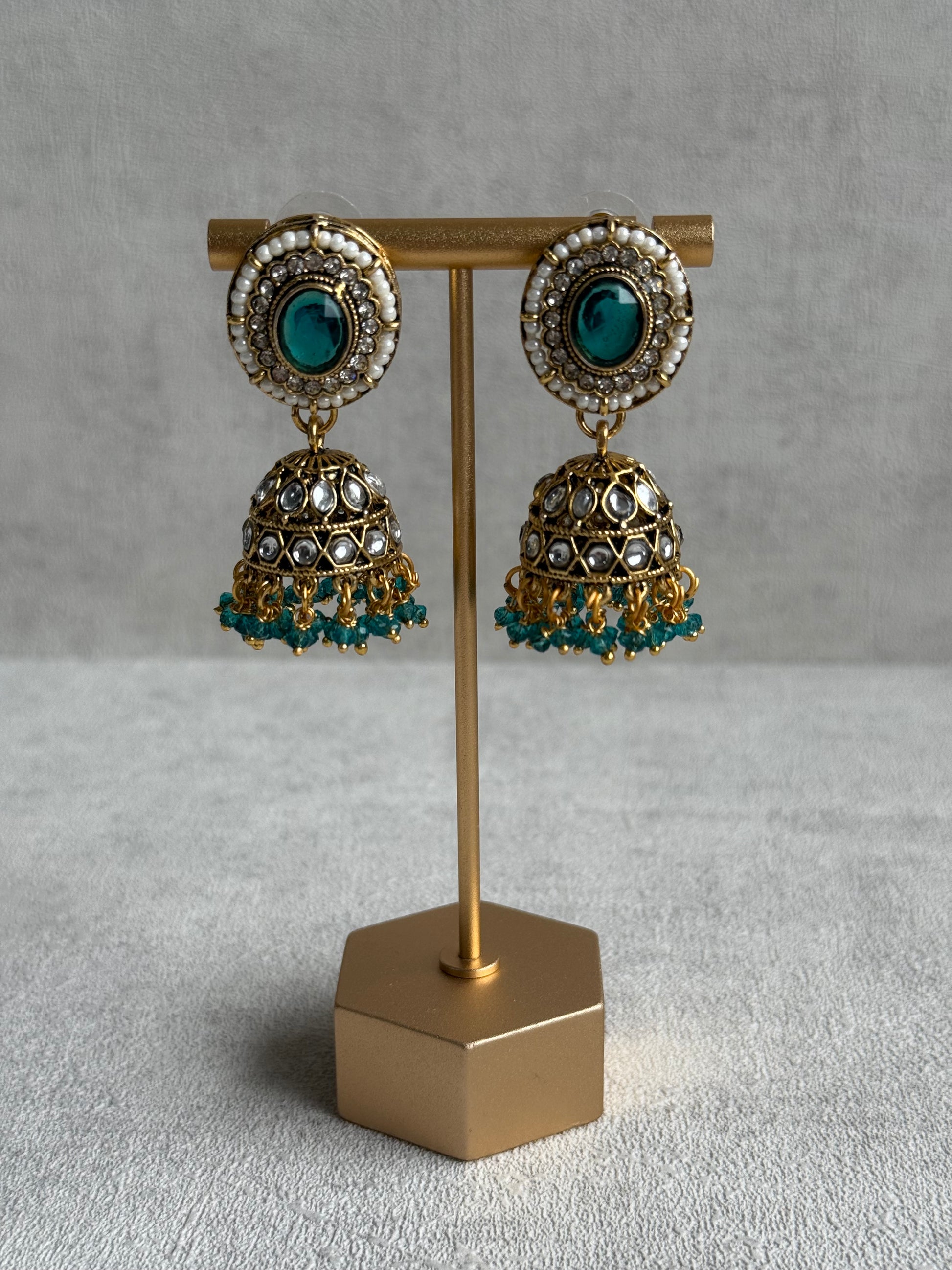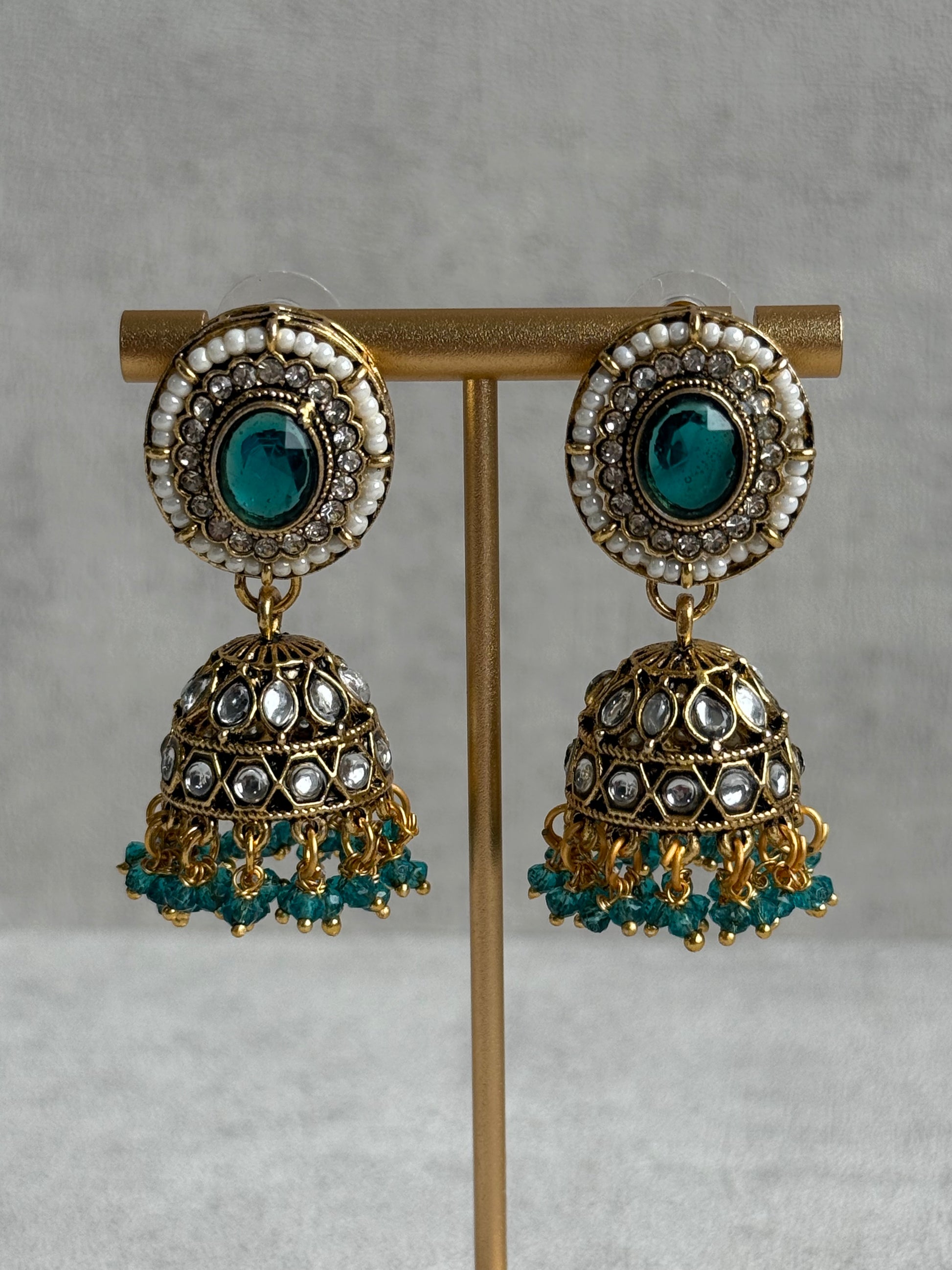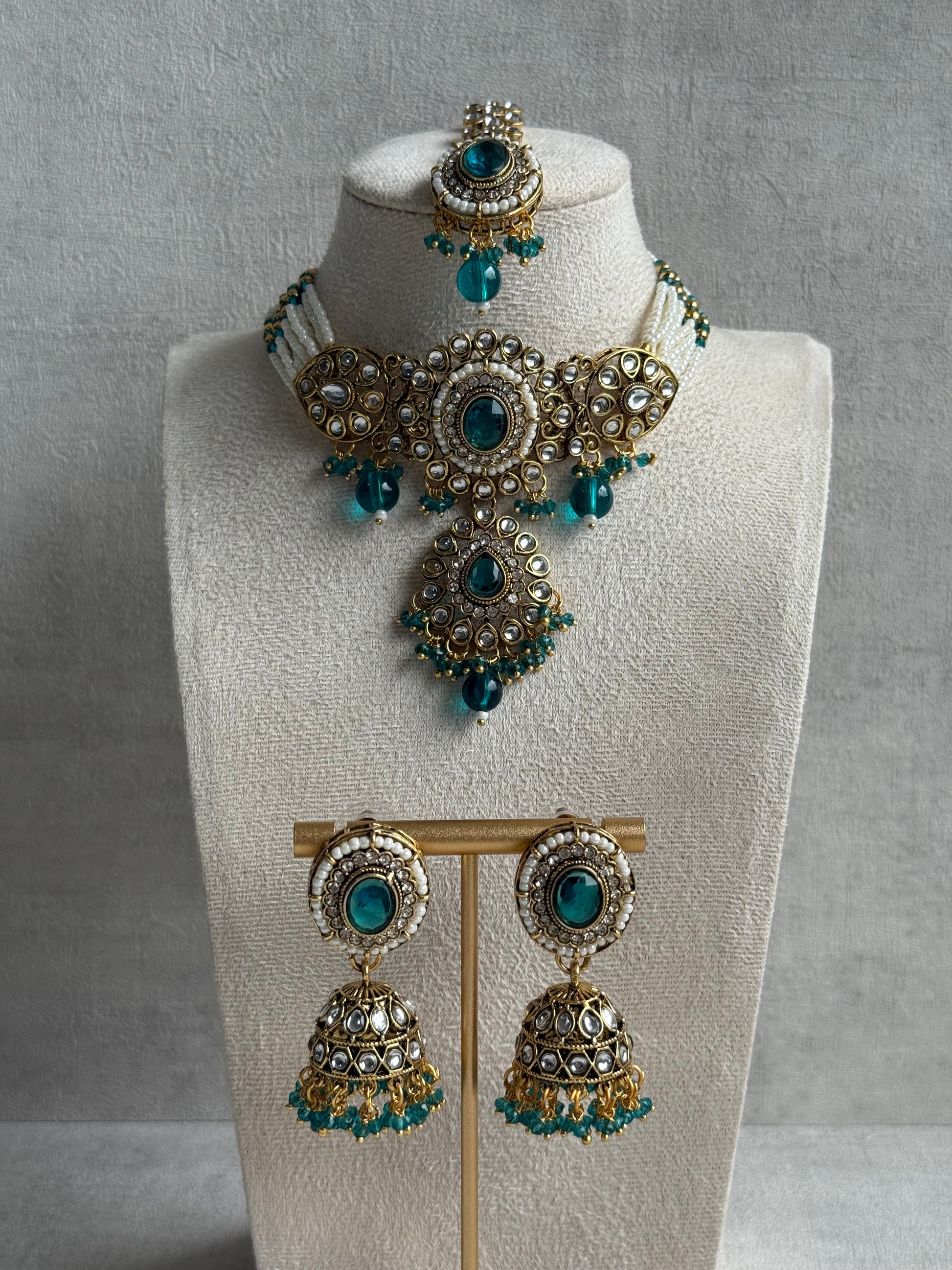 Complementing jhumkis mirror the same artistry, with Kundan-studded domes crowned by pearl borders and a cascade of blue-green bead tassels that sway gracefully with movement. The coordinated tikka completes the look with its ornate detailing, bringing balance and elegance to the ensemble.