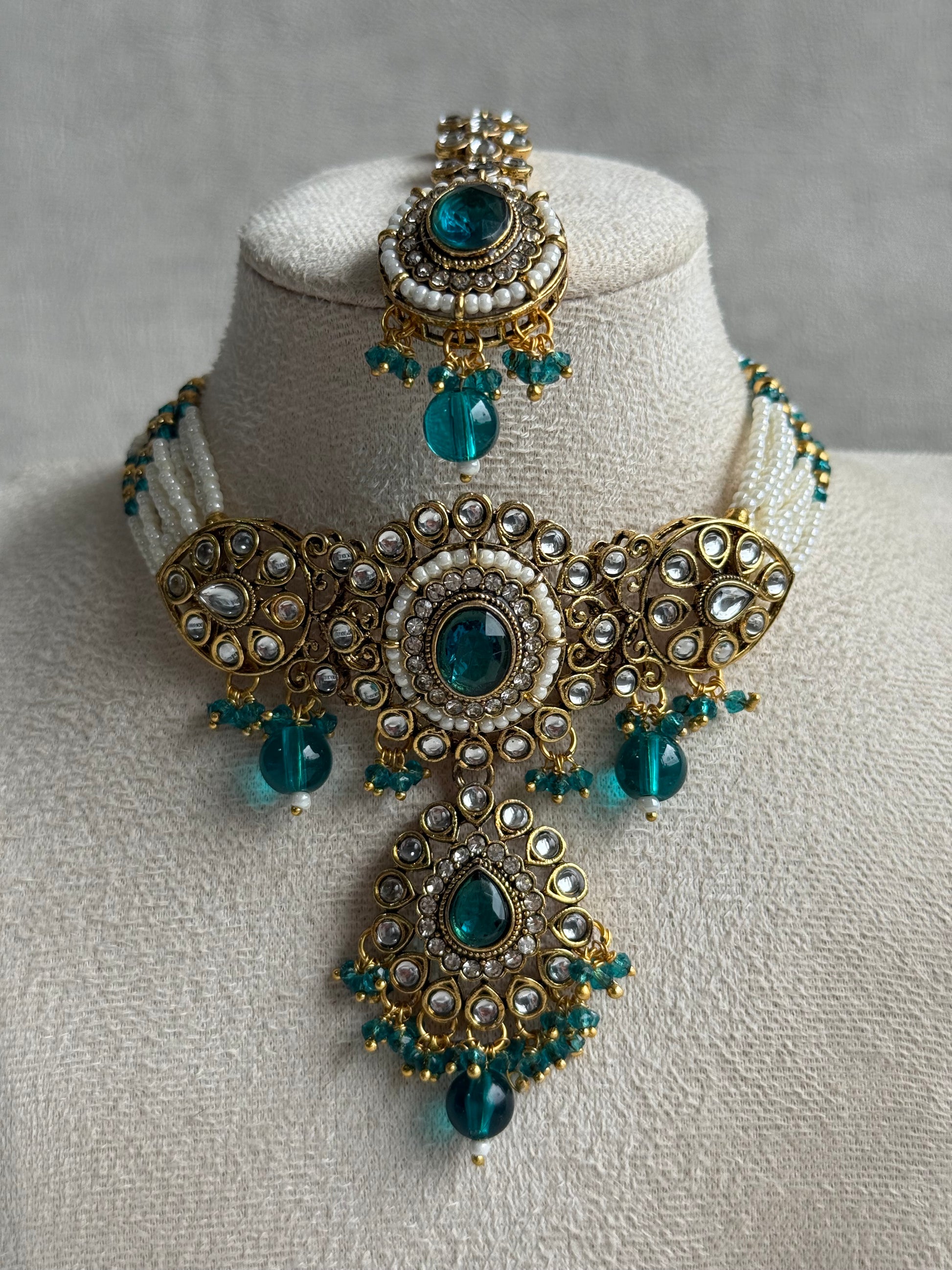 The choker features intricate circular and teardrop motifs framed in ivory pearls, radiating warmth and refinement. Suspended along its edge, the peacock blue beads introduce a jewel-like vibrance — shifting between deep blue and emerald undertones to create a truly regal finish.