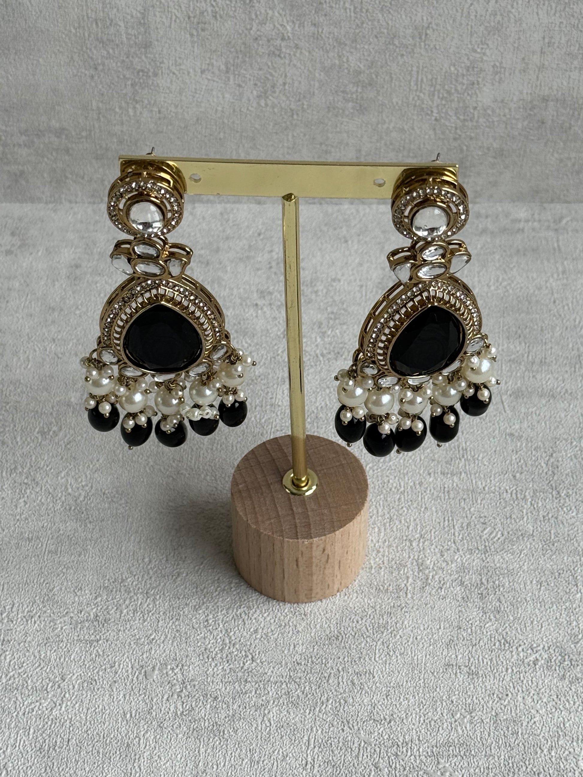 Each earring is finished with cascading black beads and ivory pearls, adding movement and texture that elevate their timeless appeal. The contrast between the deep jet tones and luminous pearls creates a bold yet balanced aesthetic.