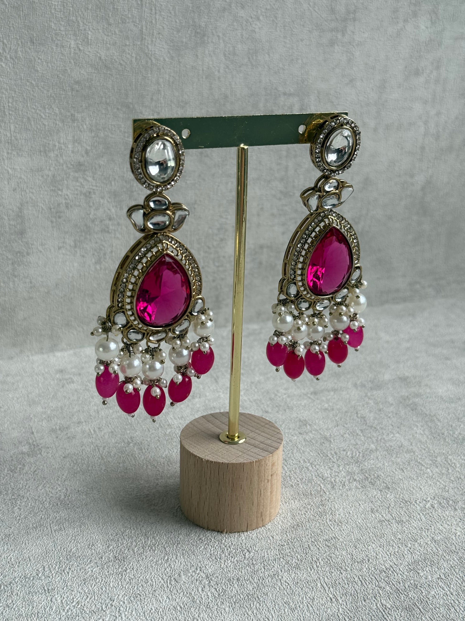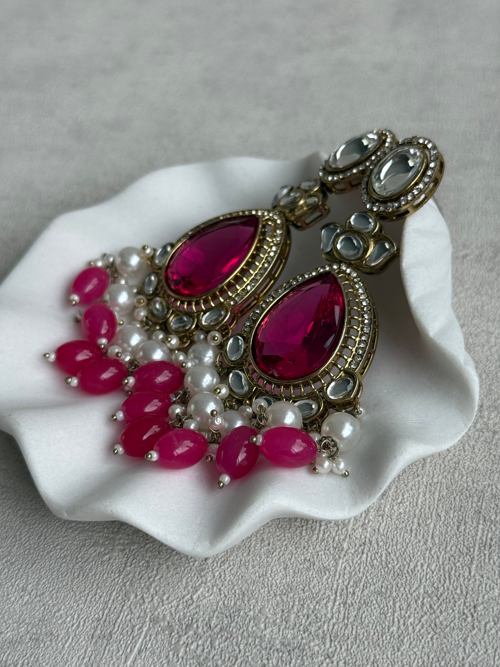 The Ayura Designs Nageen Earrings in hot pink are a radiant celebration of colour and craftsmanship. Bold teardrop stones shimmer with a vibrant pink hue, set within intricate antique gold frames adorned with mirror-cut detailing.