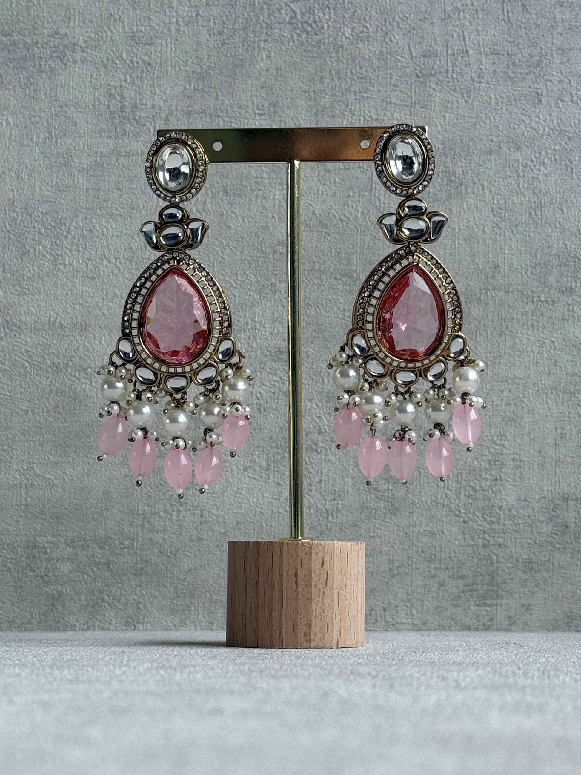 The Ayura Designs Nageen Earrings blend soft rose pink tones with a timeless antique gold finish. Featuring teardrop-cut stones framed with mirror-cut accents, each earring captures a graceful balance of colour and sparkle — perfect for adding a feminine glow to any look.