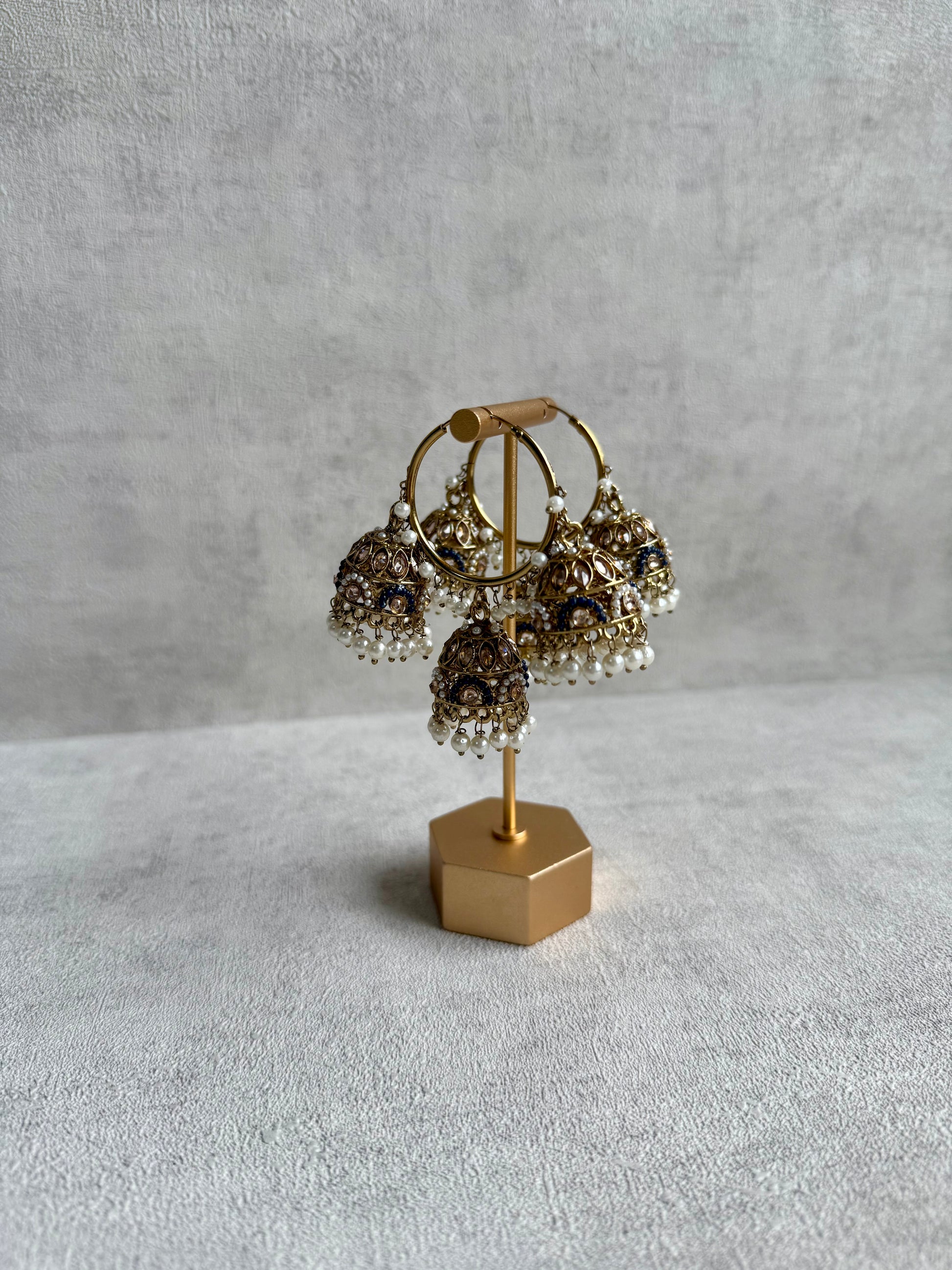 The Ayura Designs Nakhra Balis in Blue are a timeless twist on classic jhumka-inspired elegance. Crafted in a tiered triple-dome silhouette, each layer is studded with luminous mirror-cut stones and finished with soft pearl clusters that gently sway with movement. The rich blue hue adds depth and sophistication, making these earrings a standout for both day and night wear.