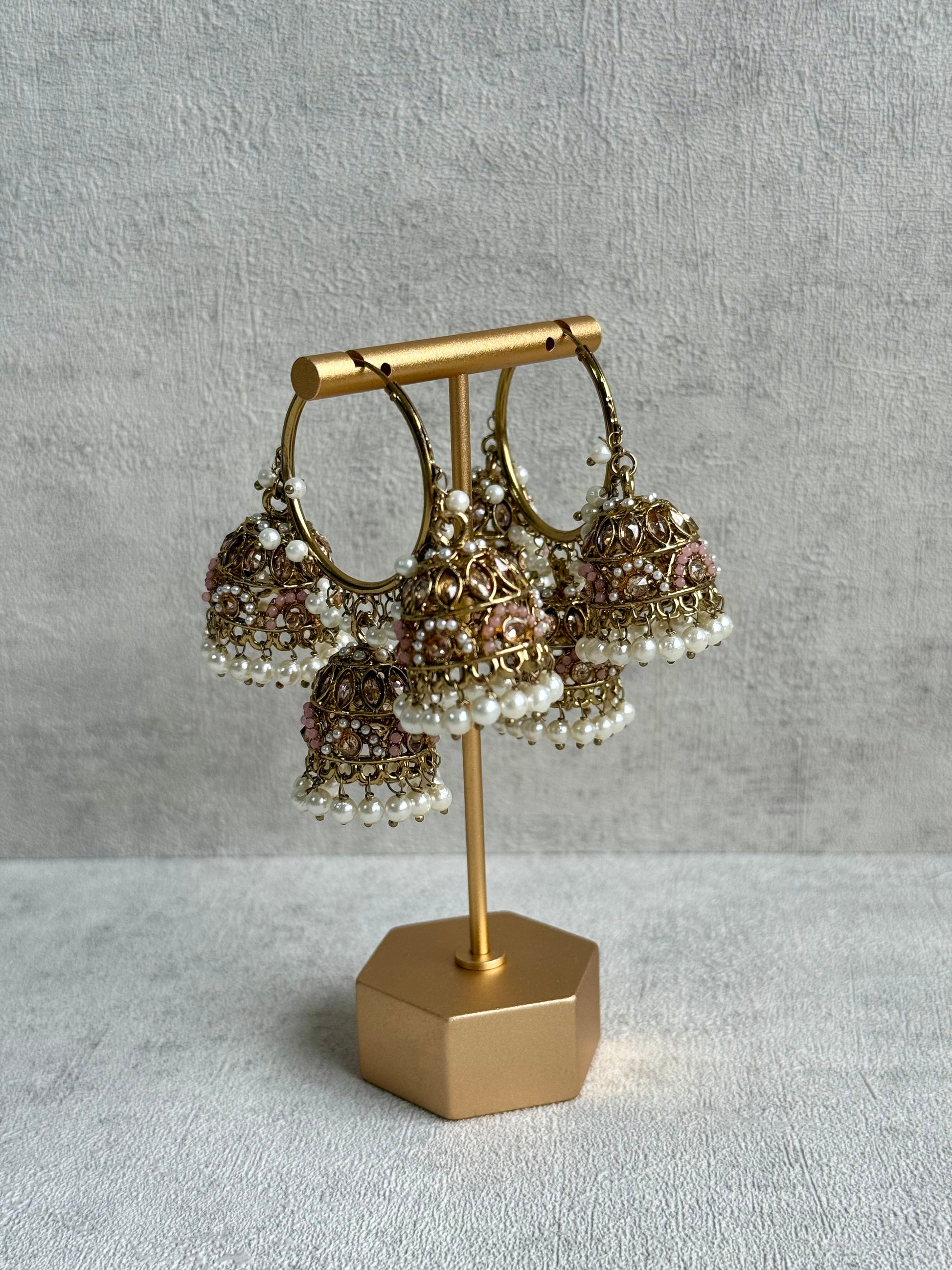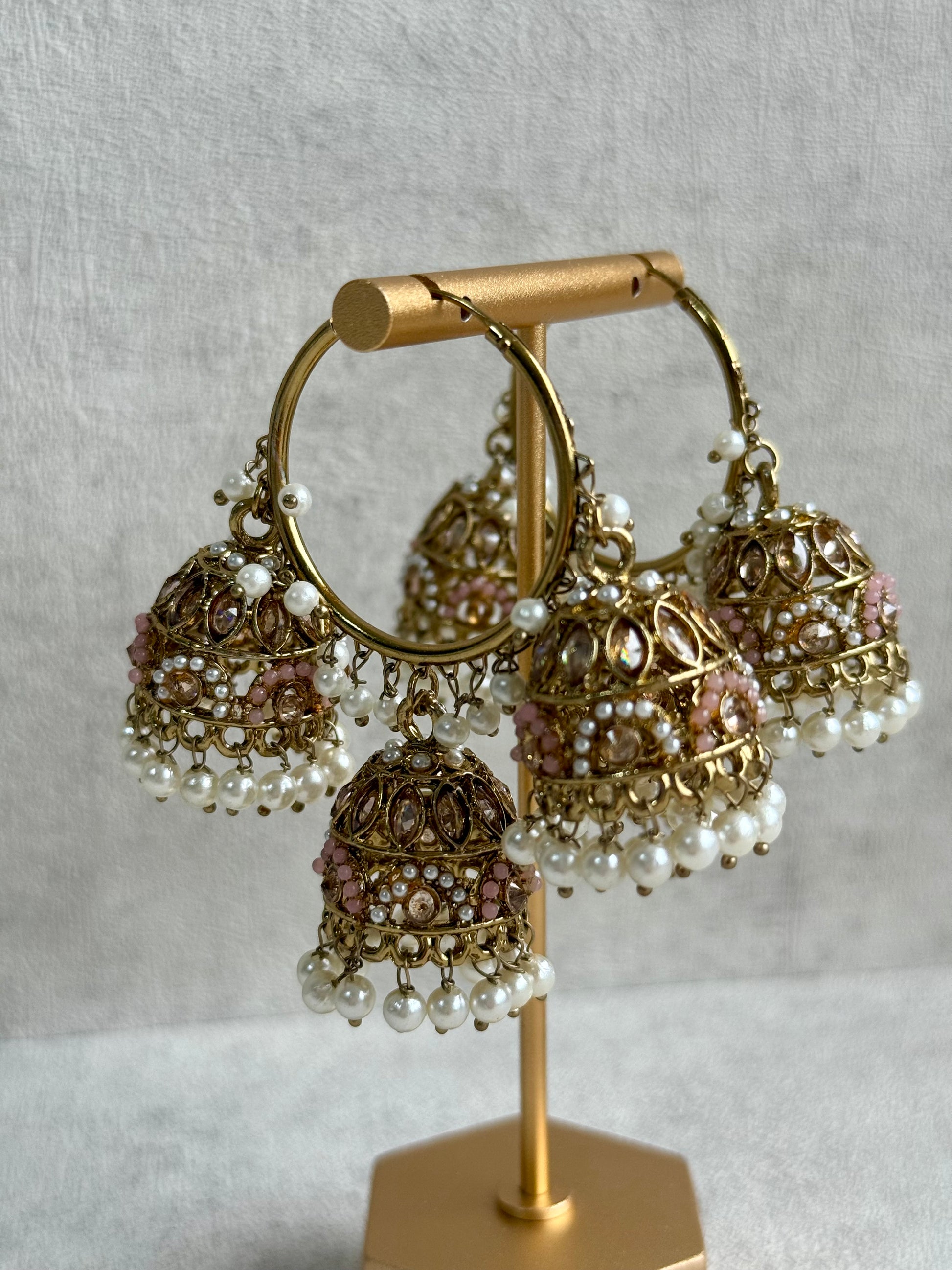 The Ayura Designs Nakhra Balis – Blush Pink Stones with Antique Gold & Pearl Triple Jhumkis are a dreamy take on festive glamour, designed for those who love their sparkle with a soft, romantic touch. Each earring features three dainty jhumkis dangling from a golden hoop, encrusted with kundan-style champagne stones, soft blush pink enamelled accents, and lustrous pearls — a colour combination that feels delicate, elegant, and endlessly versatile.