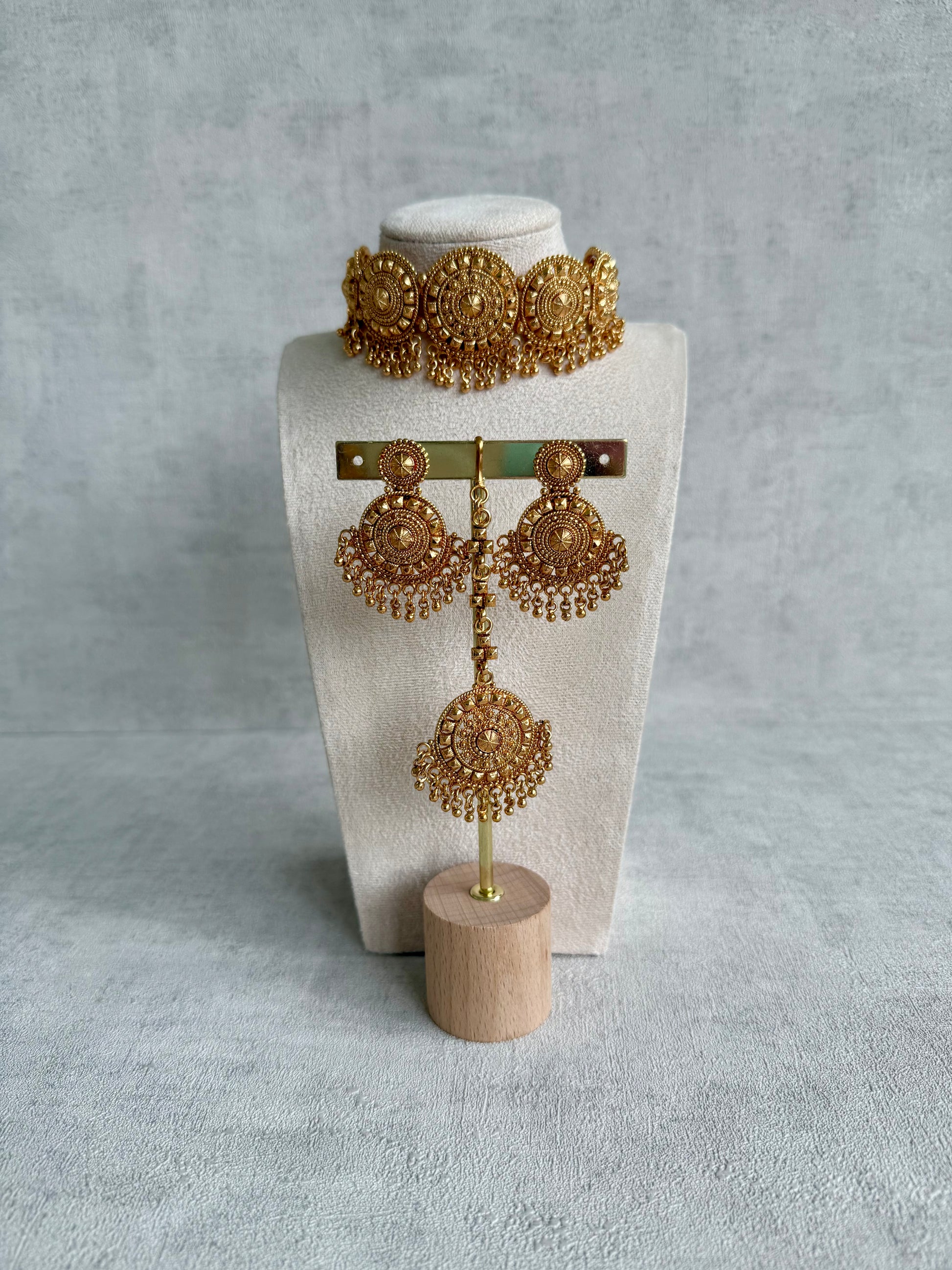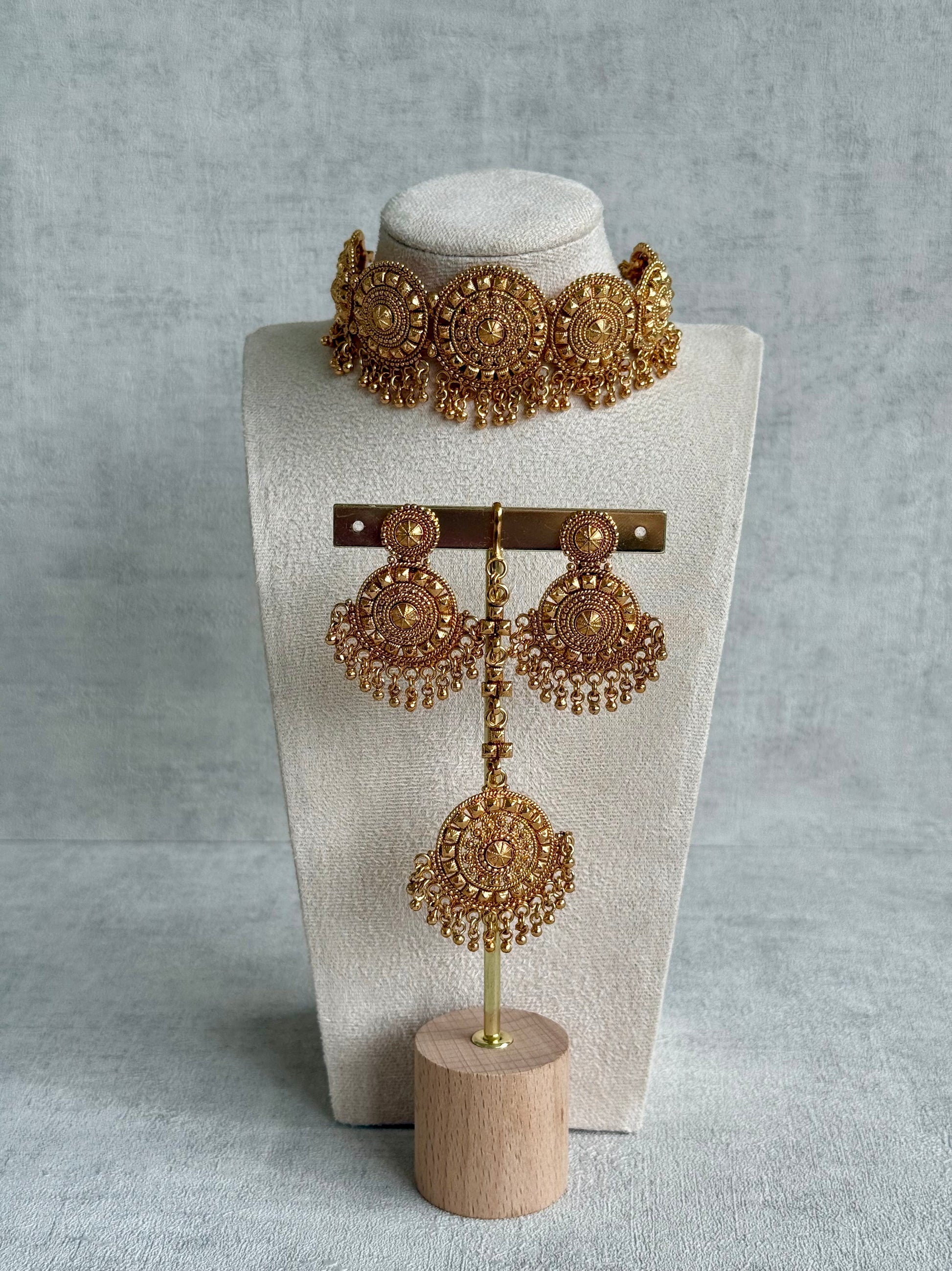 The Nawab Set by Ayura Designs is a bold tribute to regal heritage, crafted entirely in an antique gold finish. Featuring a symmetrical arrangement of intricate medallions, the choker sits high on the neck, with delicate ghungroos that sway with every movement. Matching circular jhumkis and an oversized tikka complete the statement look.