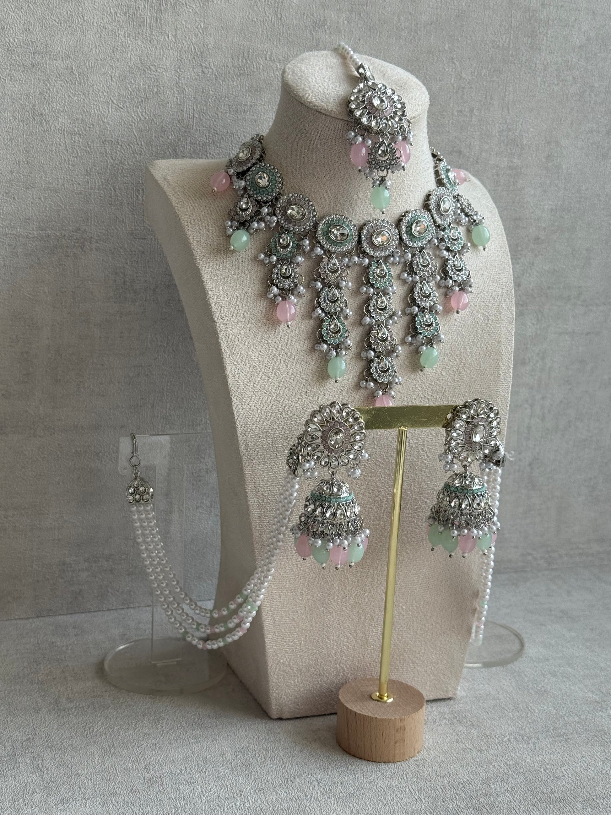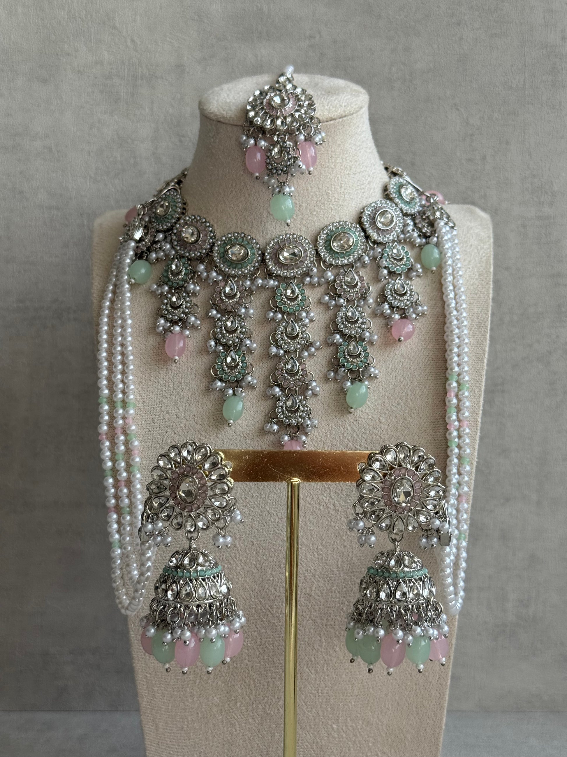 The necklace is a statement of regal craftsmanship, featuring cascading tiers of mirror-cut motifs framed by mint green enamel and edged with luminous pearls. Soft blush and mint bead drops add a gentle pop of colour, balancing delicacy with drama. The structured yet fluid silhouette gives the piece a majestic fall against the neckline — perfect for brides and special occasions that call for understated grandeur.