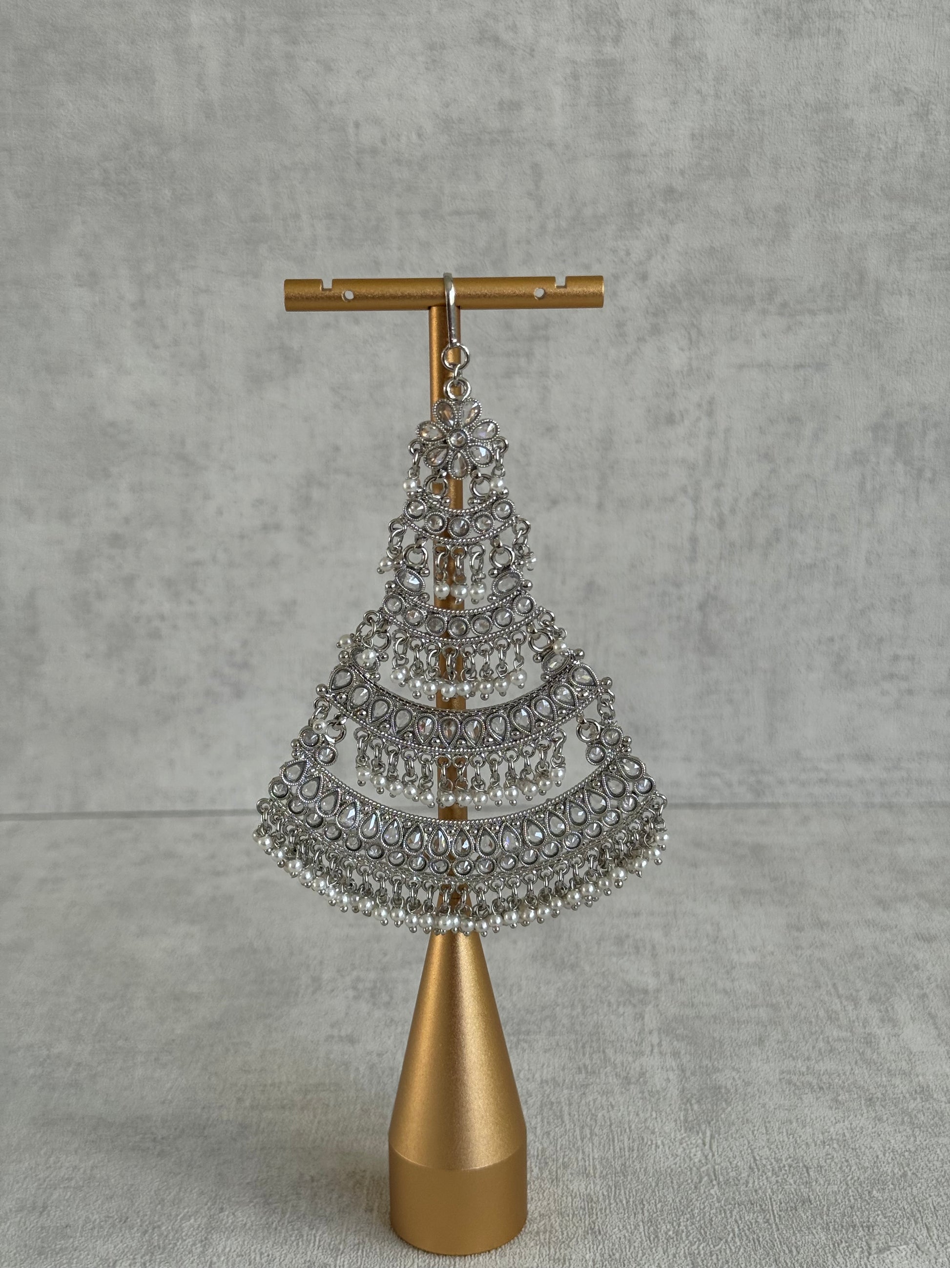 Introducing the Ayura Designs Nia Jhoomar Passa, a breathtaking blend of regal heritage and contemporary elegance. Crafted in a striking antique silver finish, this statement hair accessory features mirror-cut stones arranged in elegant teardrop and floral motifs. Each panel cascades gracefully down in fan-like tiers, adding structure and movement to the piece — perfect for a traditional bridal look with a modern edge.
