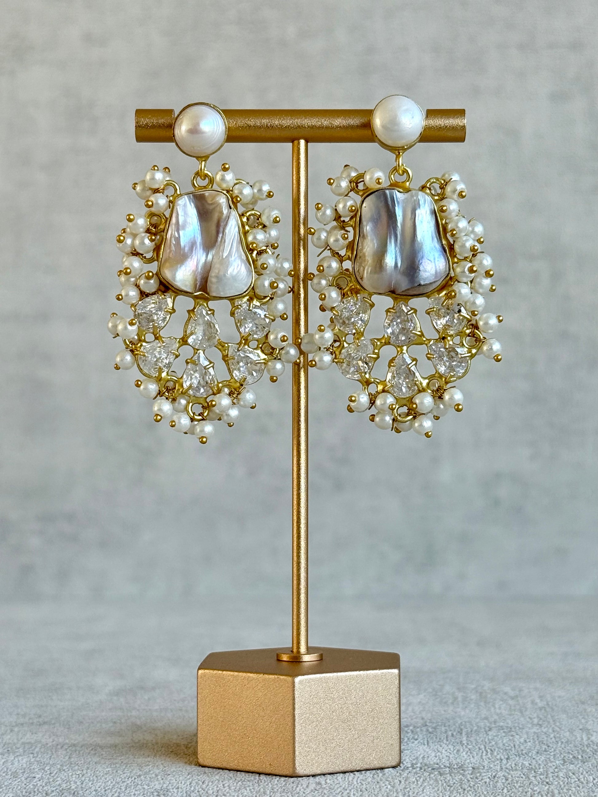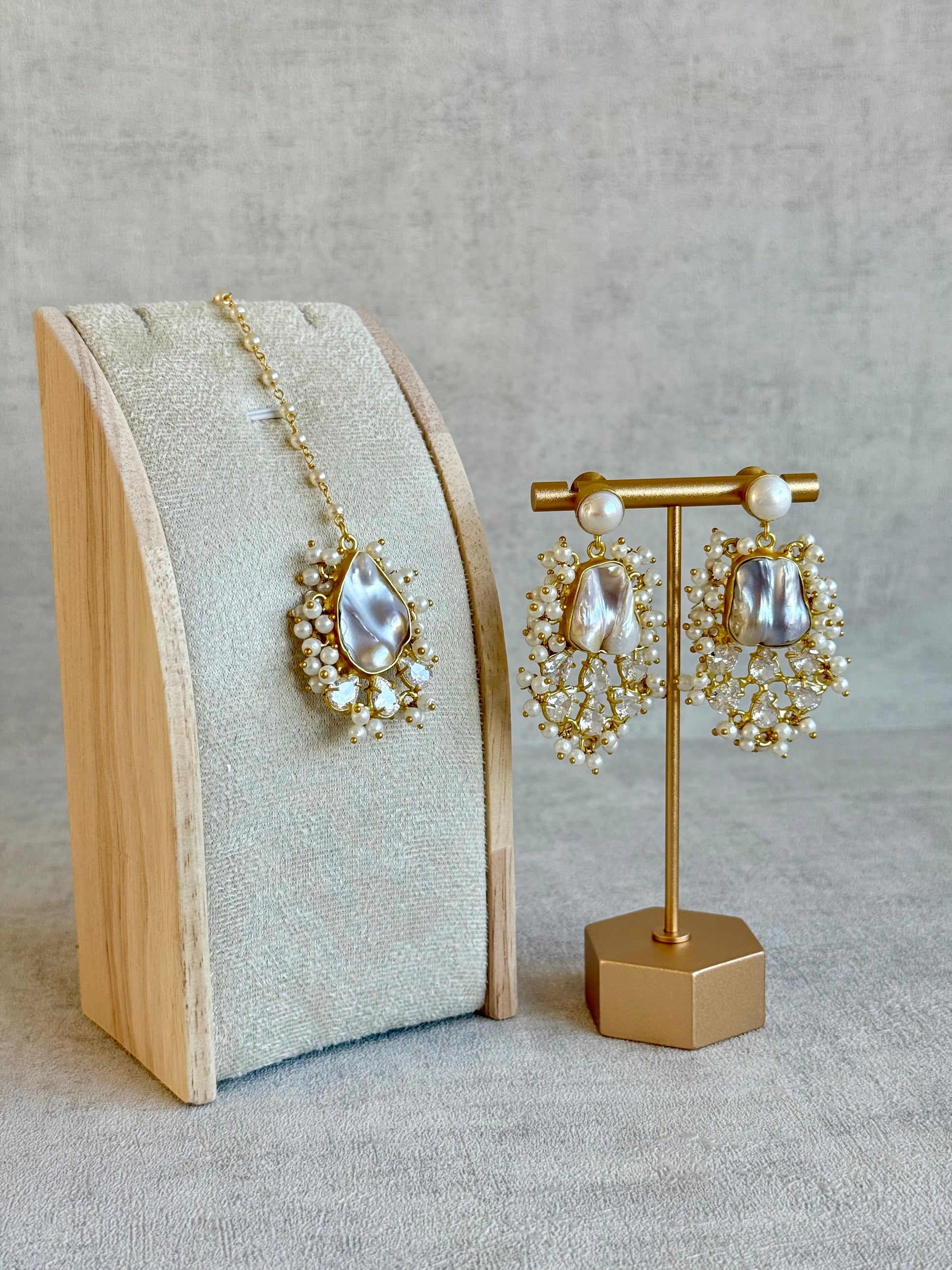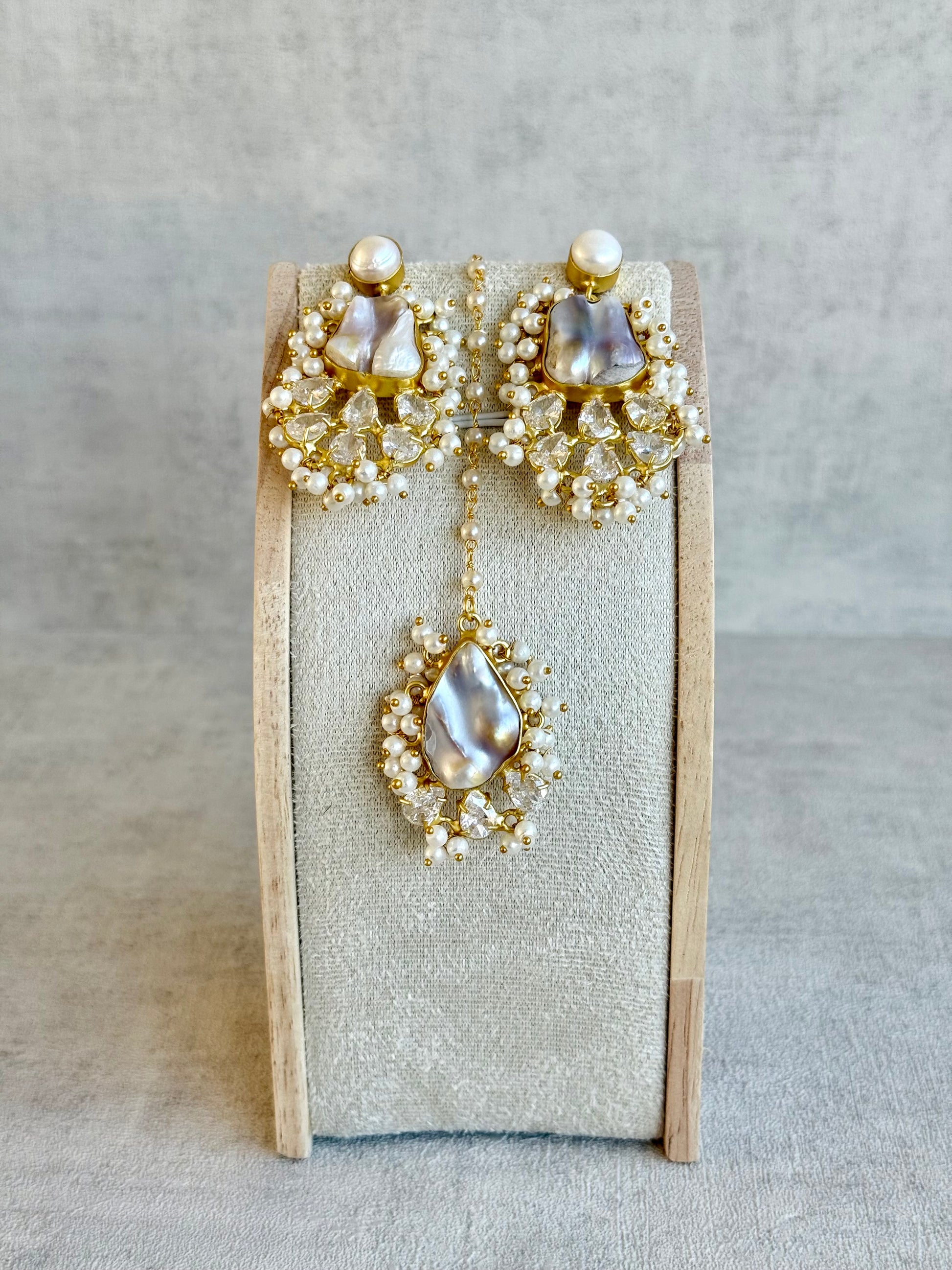 The earrings feature the same sculptural baroque centre framed with airy crystal detailing, creating a gentle sparkle that feels refined rather than overpowering. The matching tikka completes the set seamlessly, offering perfect symmetry and elegance.