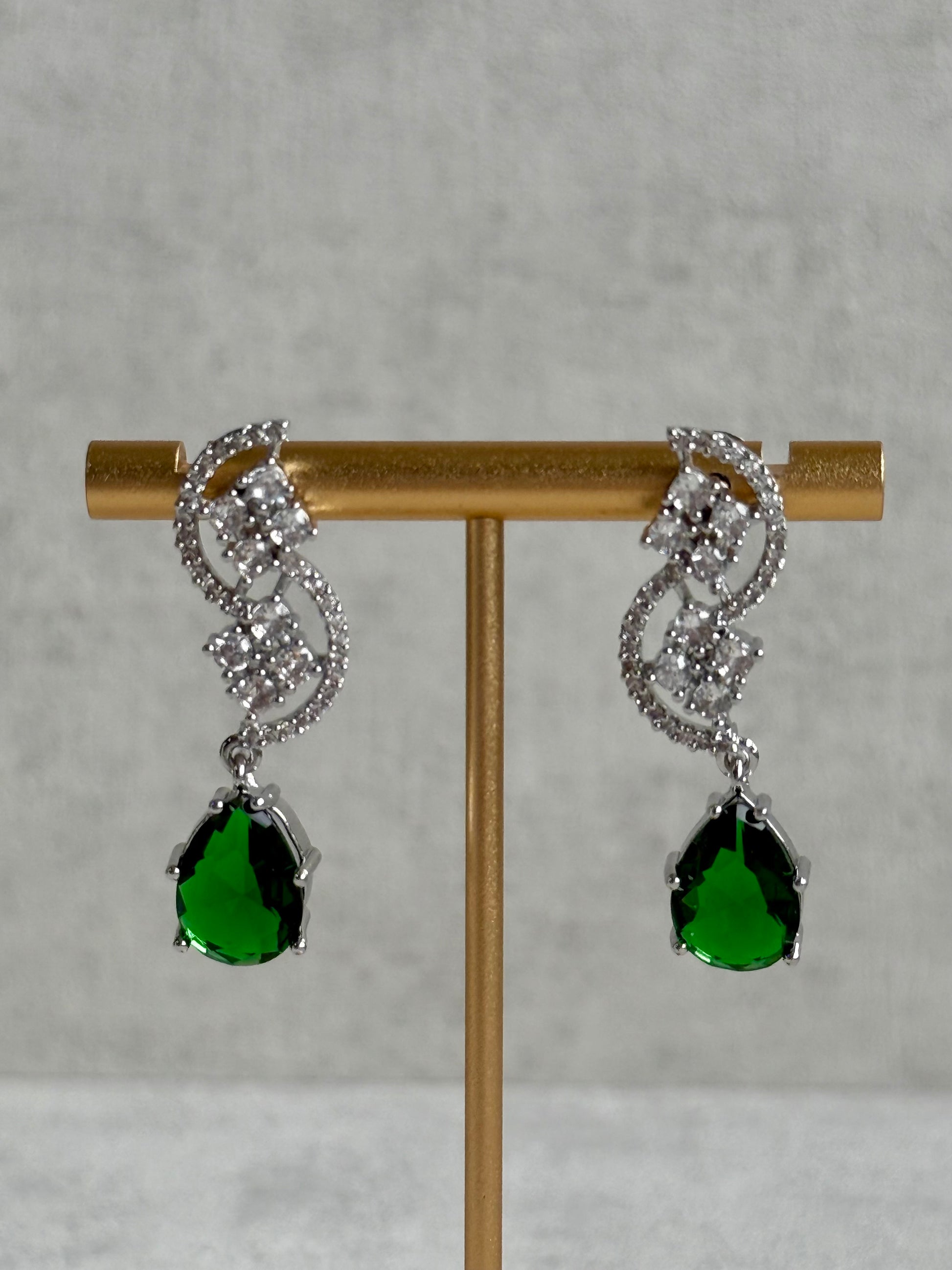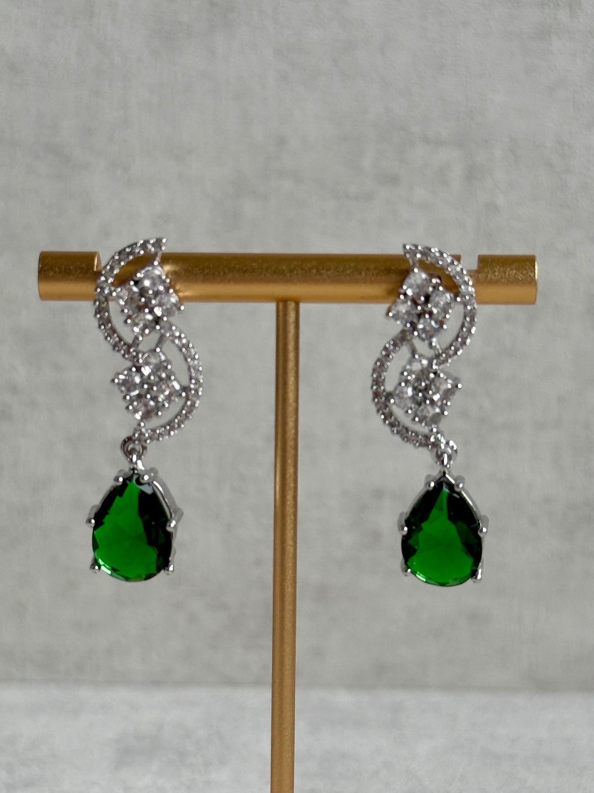 The coordinating earrings are equally striking — delicate yet dramatic. Designed with crystal-encrusted swirls and finished with a single emerald green drop, they add effortless symmetry and balance to the full look. Lightweight yet impactful, they move beautifully and frame the face with soft sparkle.