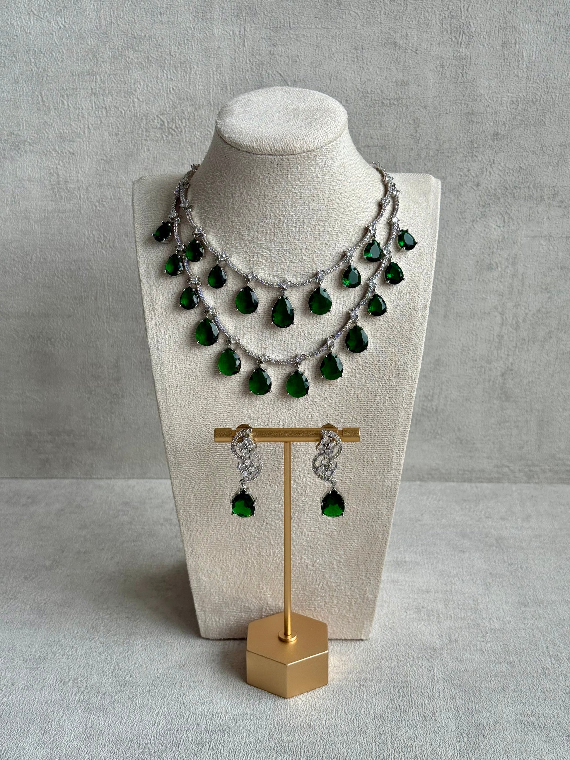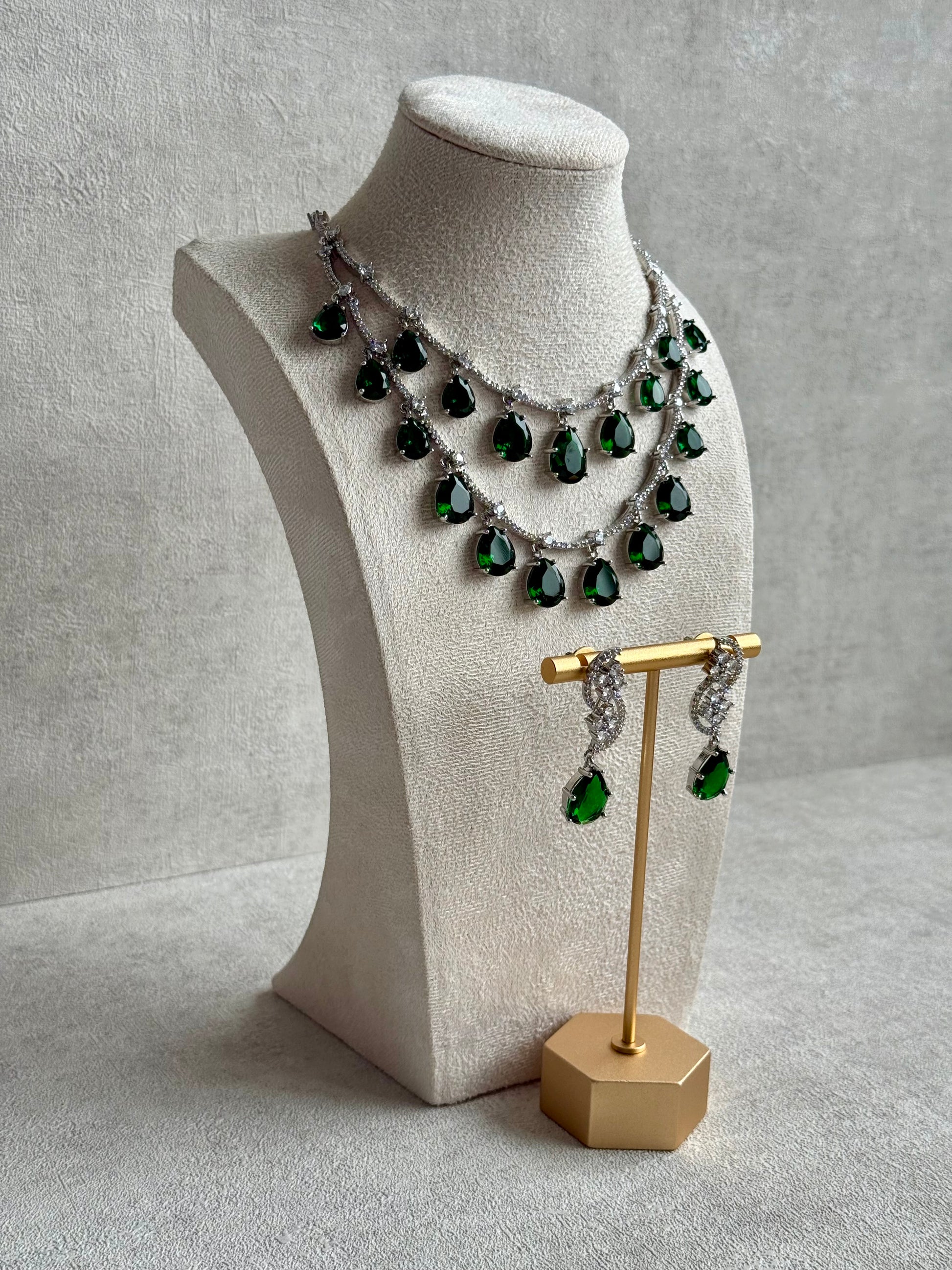 The Ayura Designs Nida Set with Necklace & Earrings – Emerald Green Stones, Diamond-Cut Accents & Silver Finish brings together timeless design and rich jewel tones in a look that’s both regal and refined. This statement necklace features three cascading rows of pear-cut emerald green stones, each one glimmering beneath intricate silver-toned detailing that catches the light with every movement.