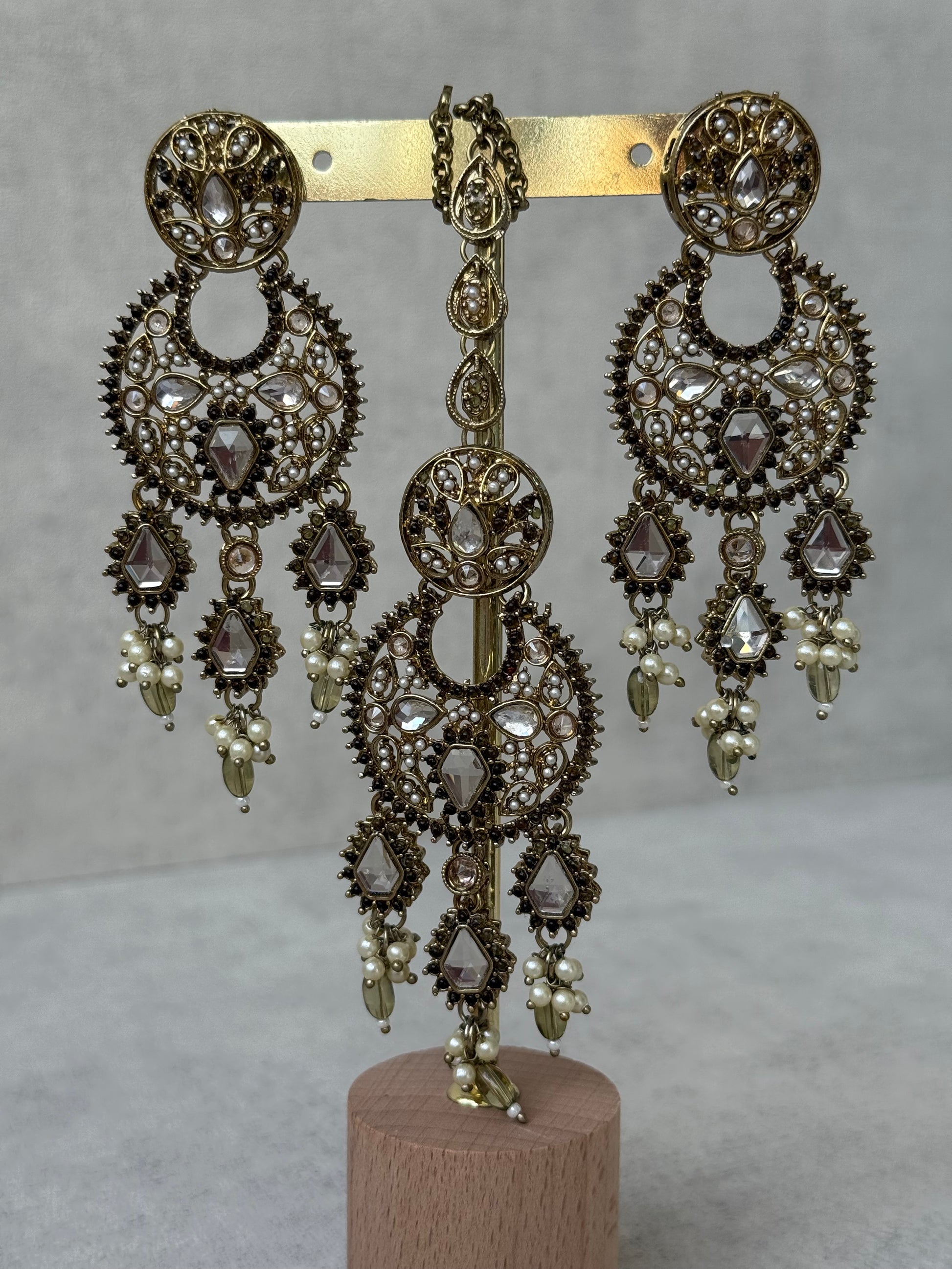 Unveiling timeless grandeur — the Ayura Designs Nimra Set is a poetic blend of regal heritage and refined craftsmanship. Featuring an intricately detailed choker with layered mirror-cut Polki stones, this set shimmers with effortless elegance. The antique gold finish evokes the richness of heirloom jewellery, making it perfect for traditional festivities and modern-day soirées alike.