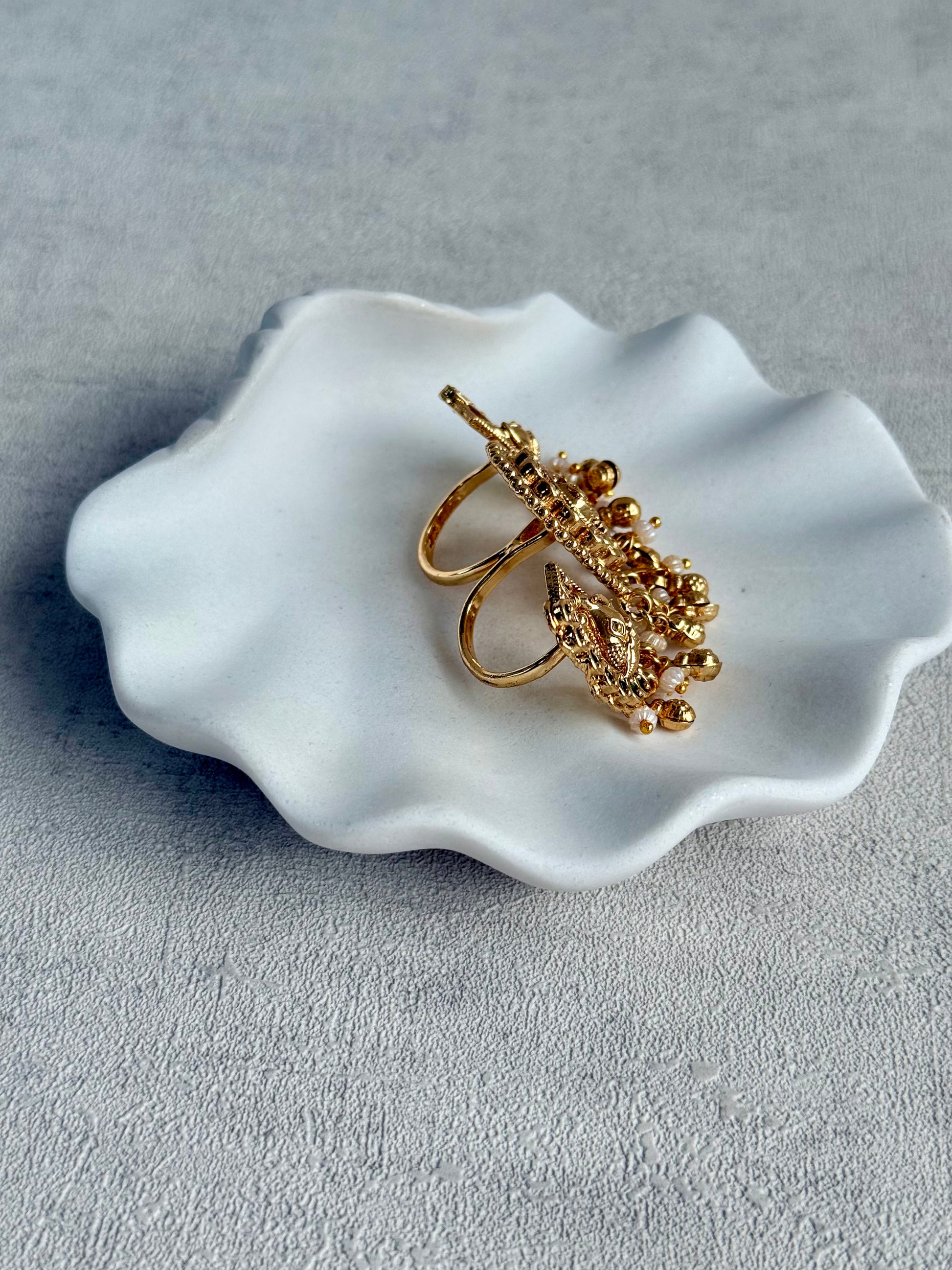 Delicate pearl drops and ghungroo charms cascade from the base, creating soft movement and a subtle festive chime. The layered textures, detailed metalwork, and hanging elements give the ring a luxurious, ceremonial feel.