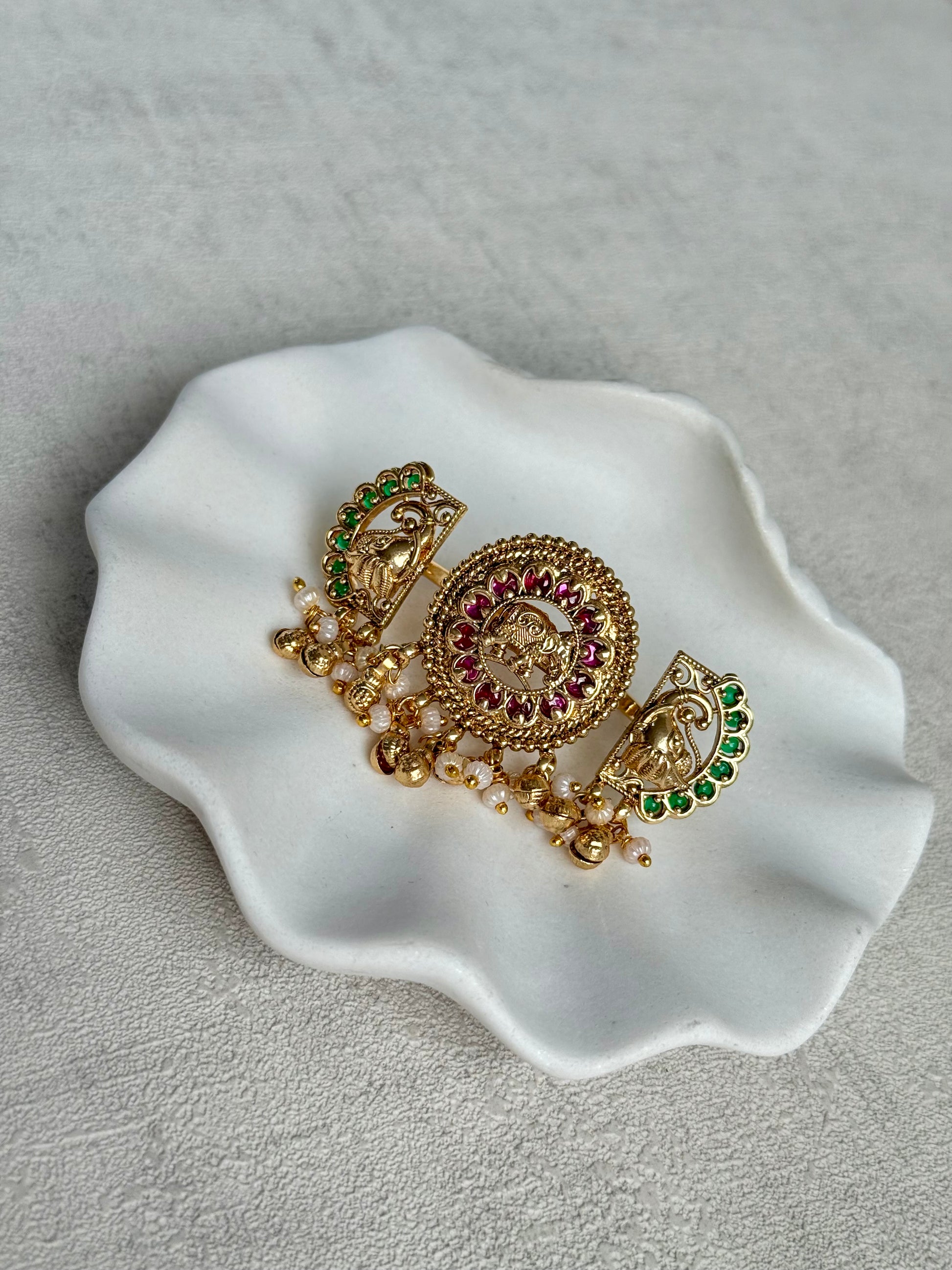 At the heart of the design are intricately sculpted elephant motifs, symbolising strength and prosperity. These are framed with ornate detailing and highlighted by rich Rani pink stones, complemented beautifully by emerald green accents that add depth and contrast.