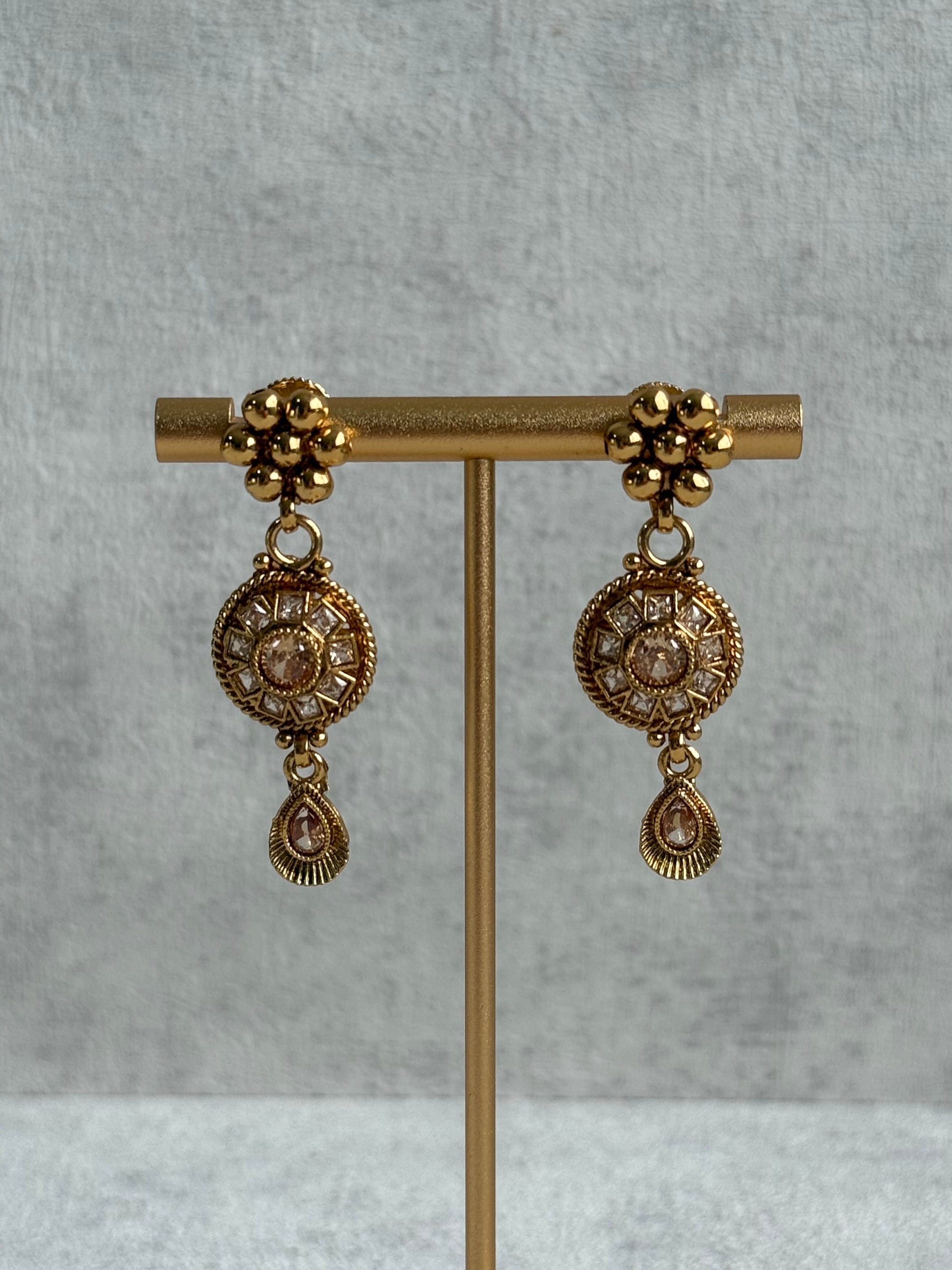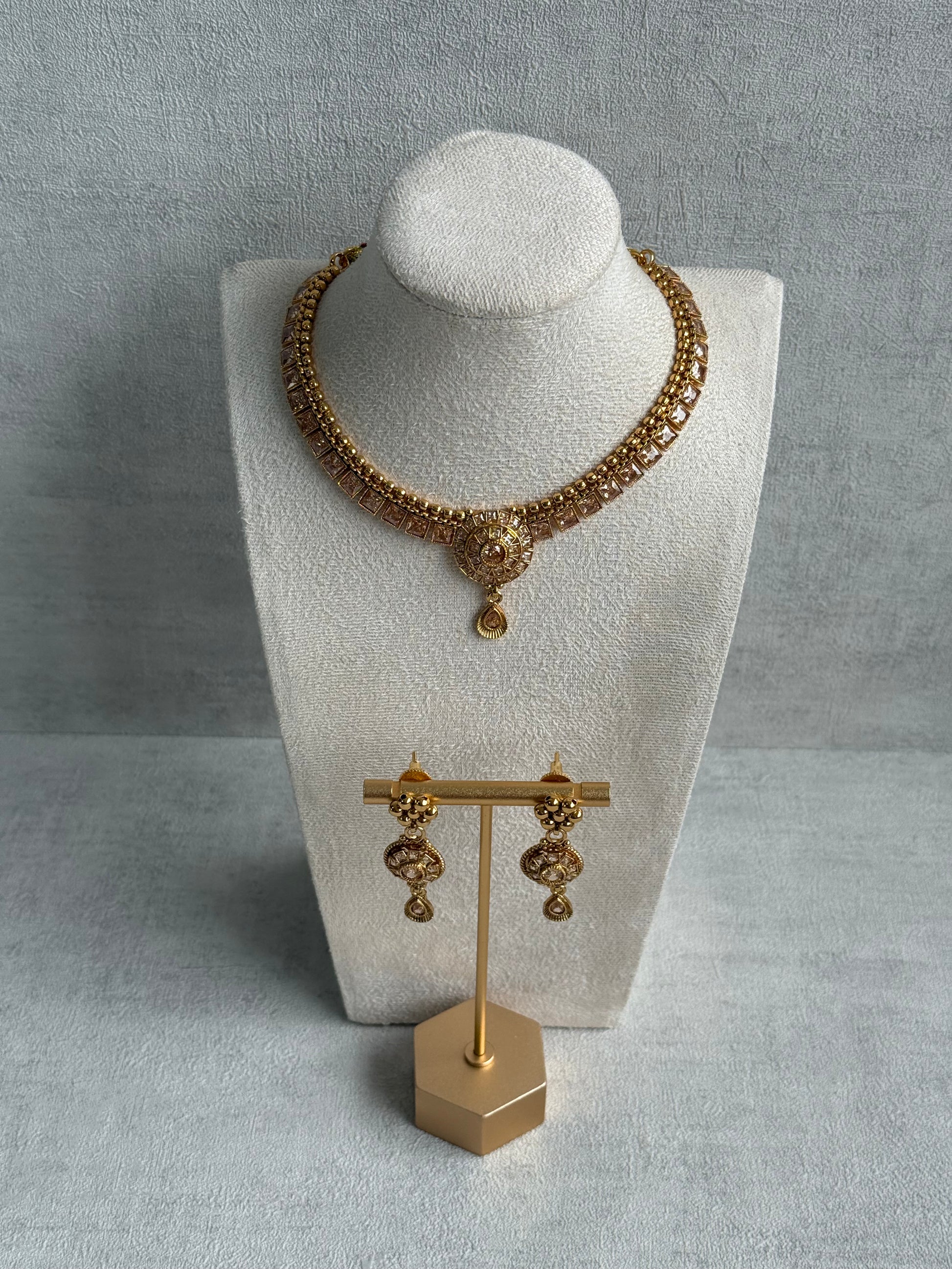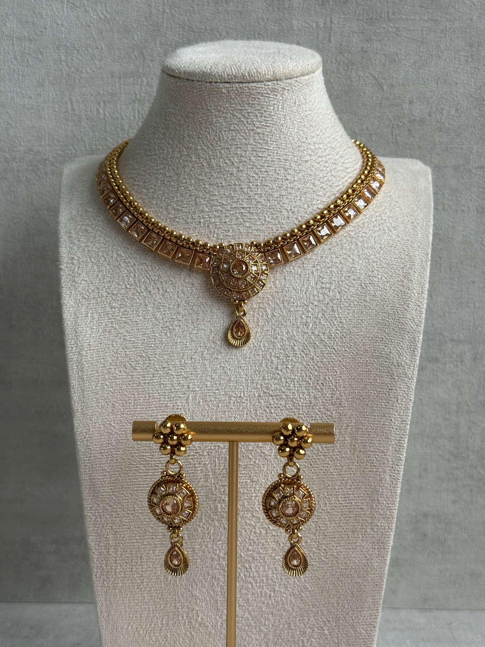 The Ayura Designs Nithya Set embodies timeless sophistication through its warm gold tones and champagne crystal stones. Designed with precision and grace, each square-cut crystal is bordered in antique gold, forming a refined silhouette that sits beautifully along the neckline. The matching earrings echo the same circular motif with delicate teardrop accents, completing the look with classic refinement.
