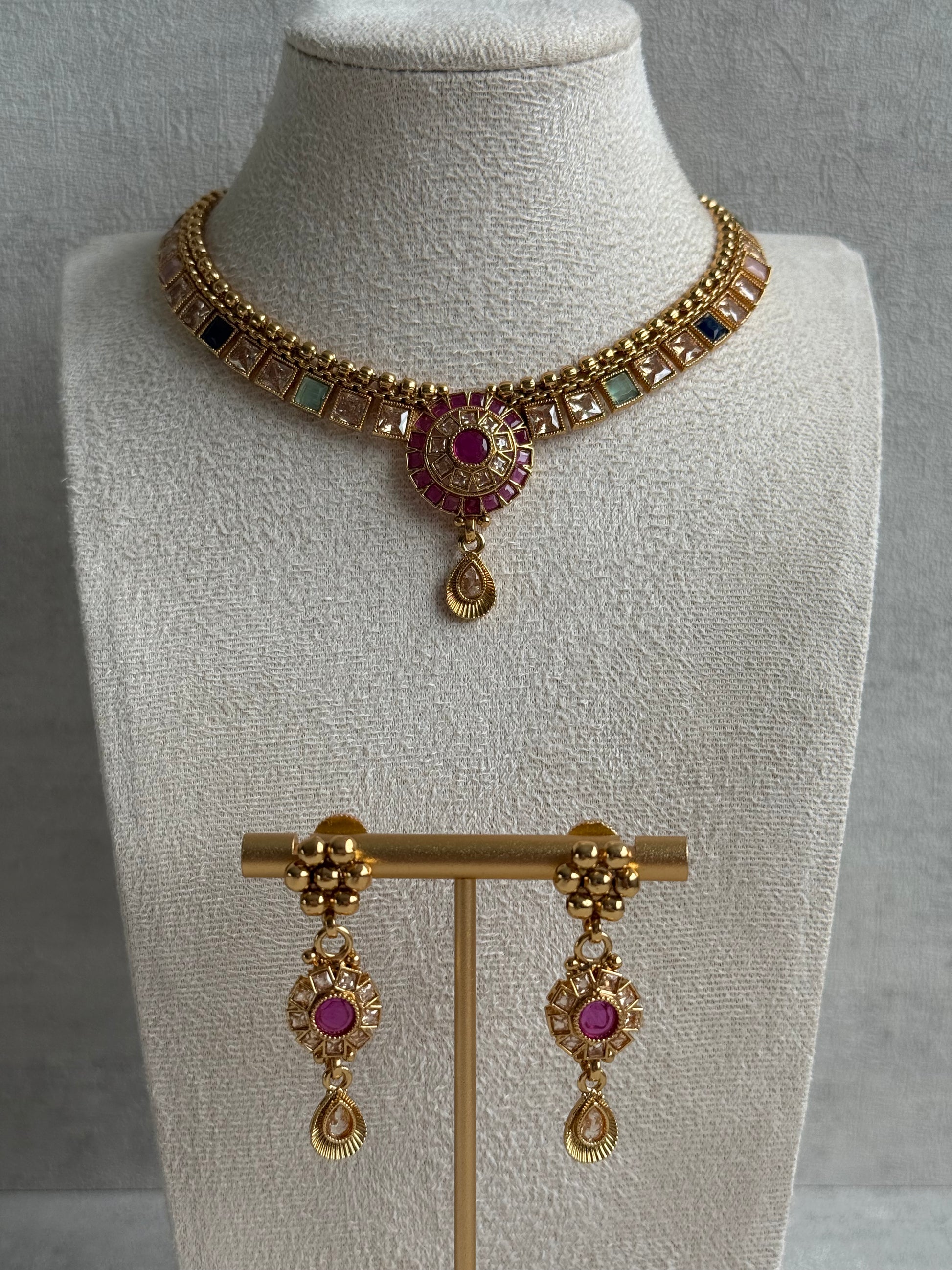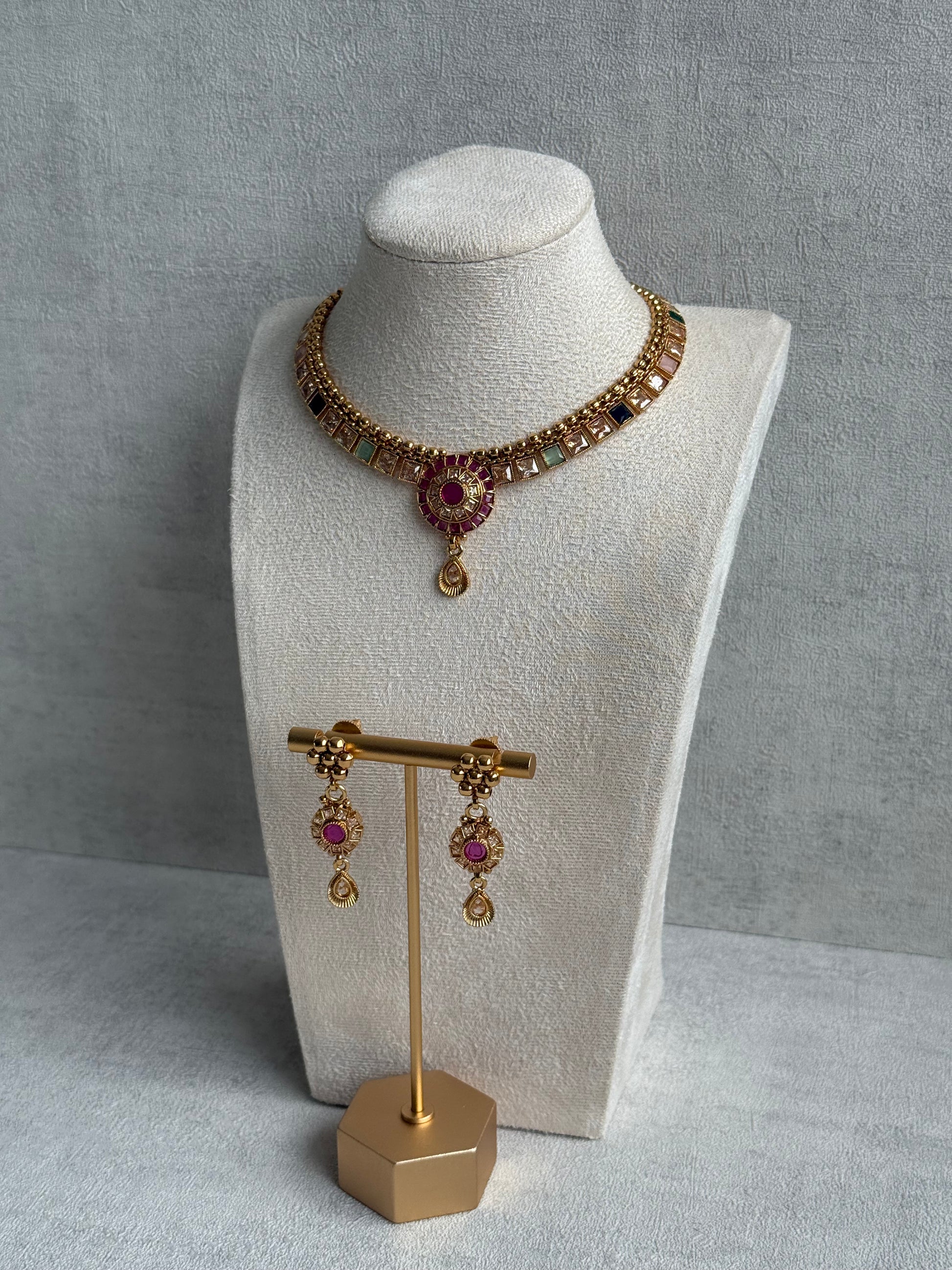 The necklace and earrings are beautifully balanced, their radiant jewel tones brought together through gold detailing that enhances every hue. The gentle teardrop pendant adds a graceful movement, while the ruby-accented earrings create a cohesive and polished finish.