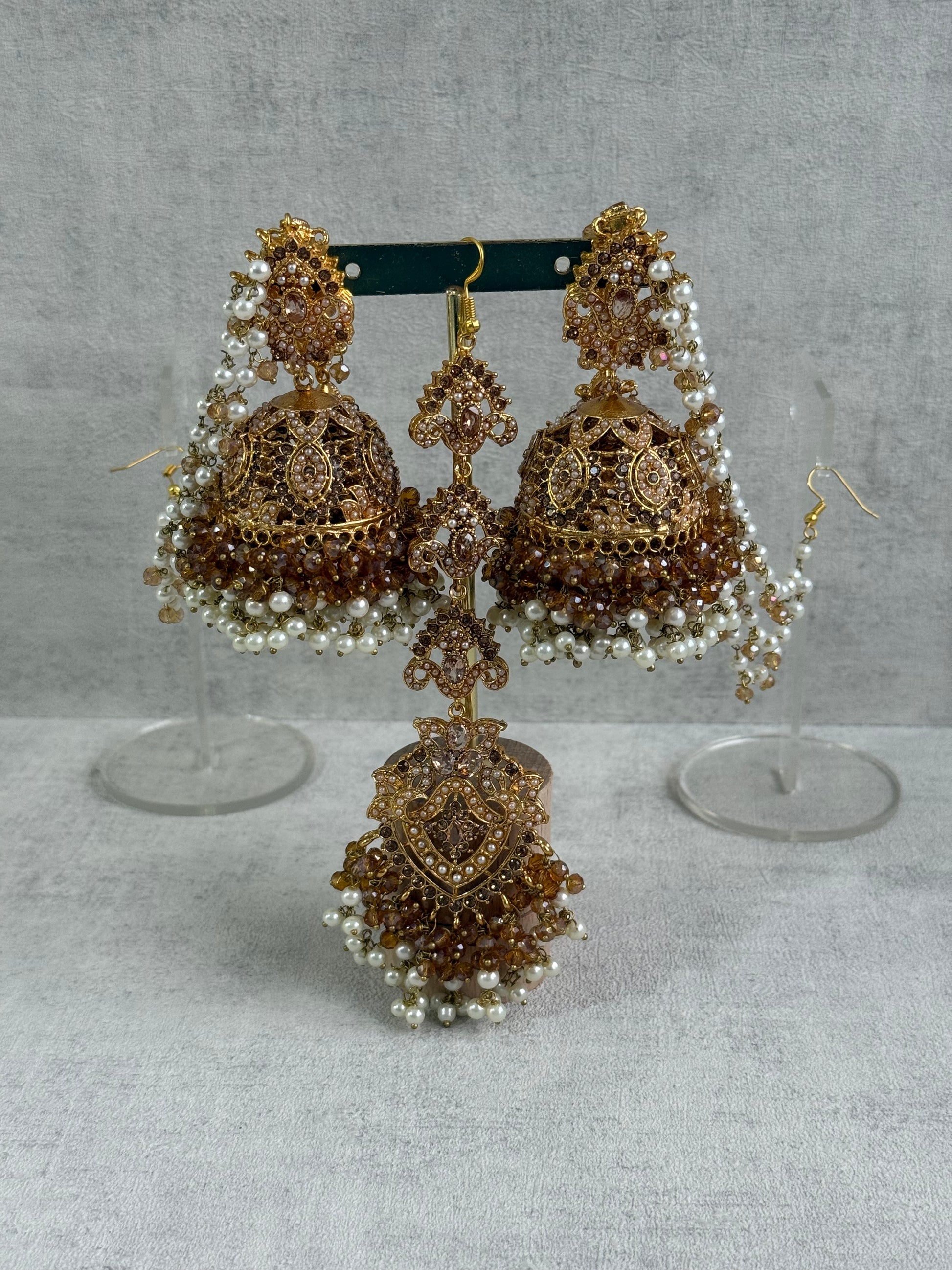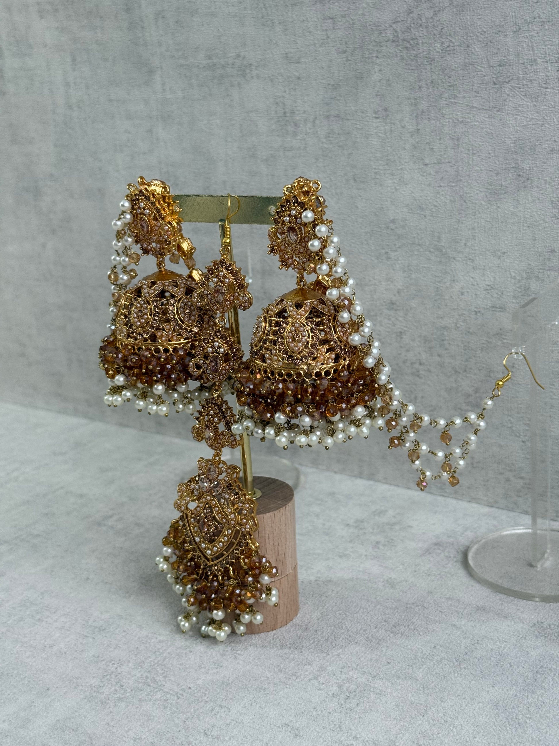 The jhumkis are equally grand, detailed with sahare chains that frame the face elegantly. Their domed silhouette is encrusted with sparkling stones and finished with pearl frills, giving a beautiful balance of structure and softness. The matching tikka mirrors the same intricate design, completing the set with a cohesive and royal touch.