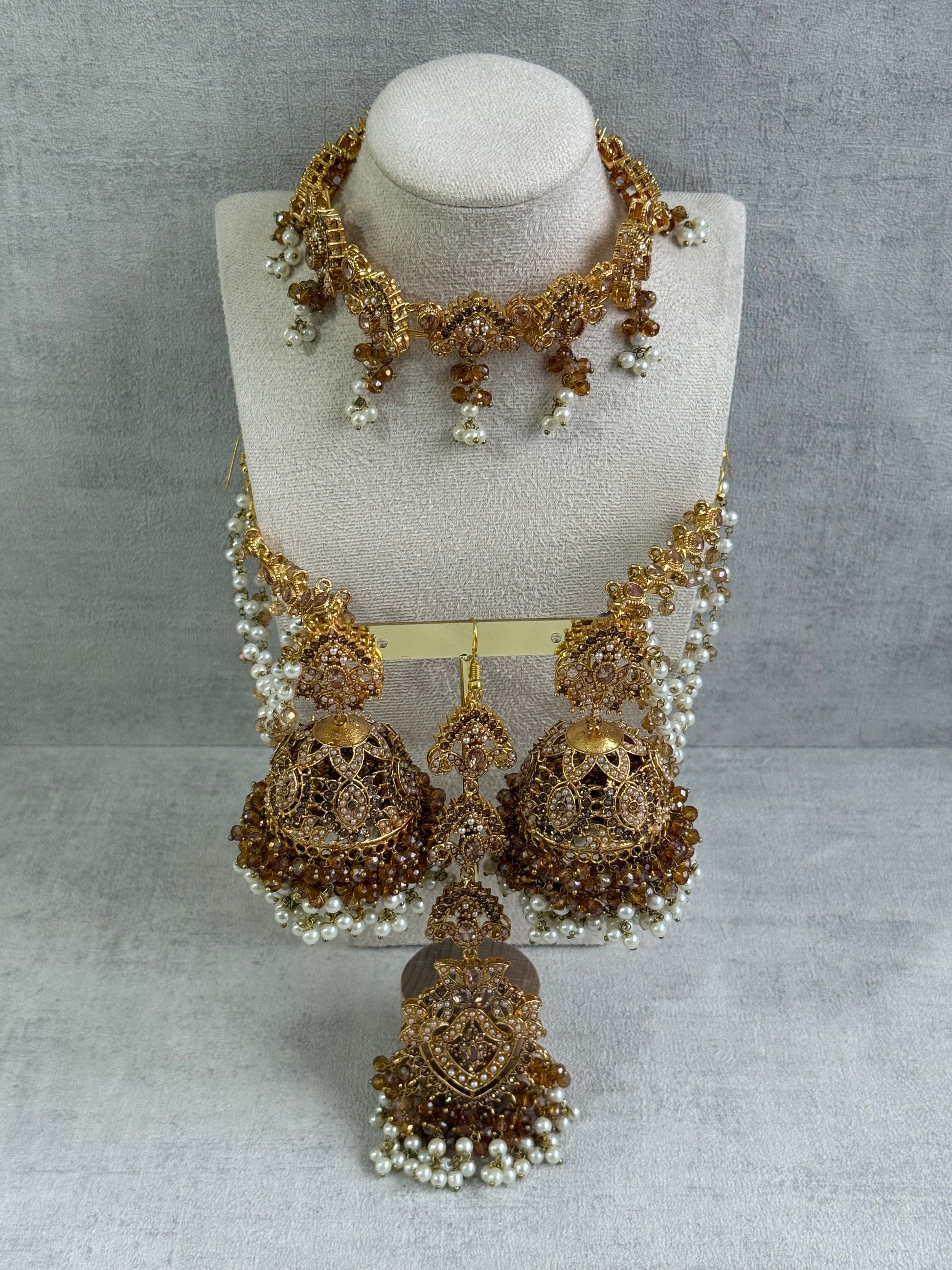The choker features ornate filigree patterns encrusted with champagne-toned crystals and tiny pearls, forming a symmetrical design that sits gracefully against the neckline. Cascading crystal and pearl clusters add fluidity and movement, creating a luxurious layered look that glimmers with every turn.