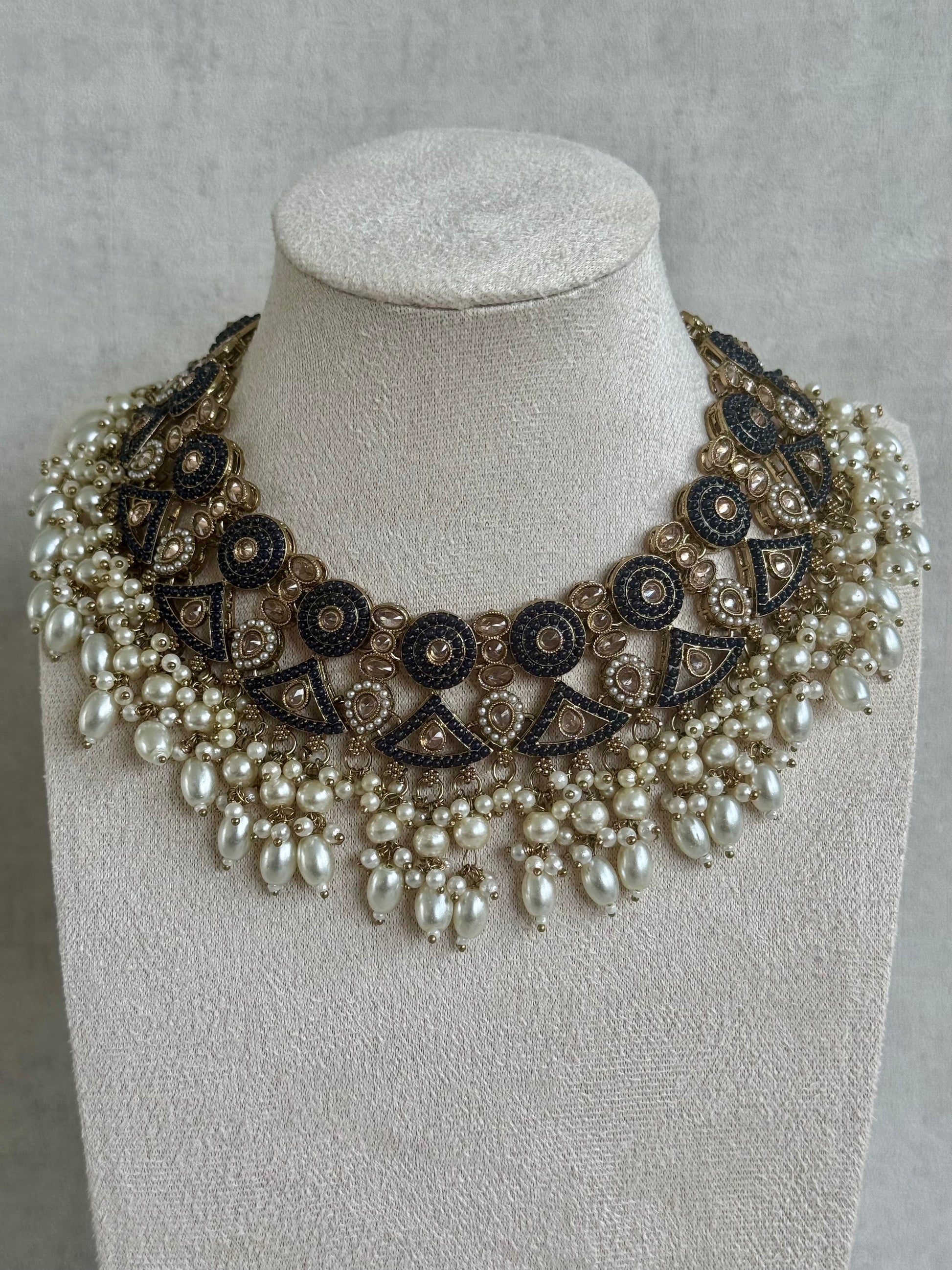The Noorza necklace is designed with intricate circular and floral motifs, highlighted by delicate polki stones and graceful pearl drops. Its structured, elegant form sits beautifully on the neckline, creating an effortlessly luxurious silhouette perfect for traditional weddings, receptions, and festive celebrations.