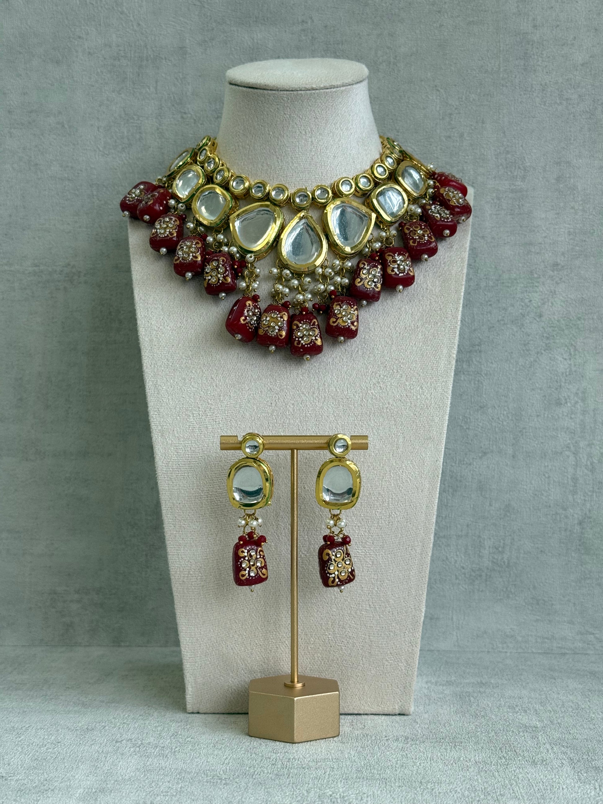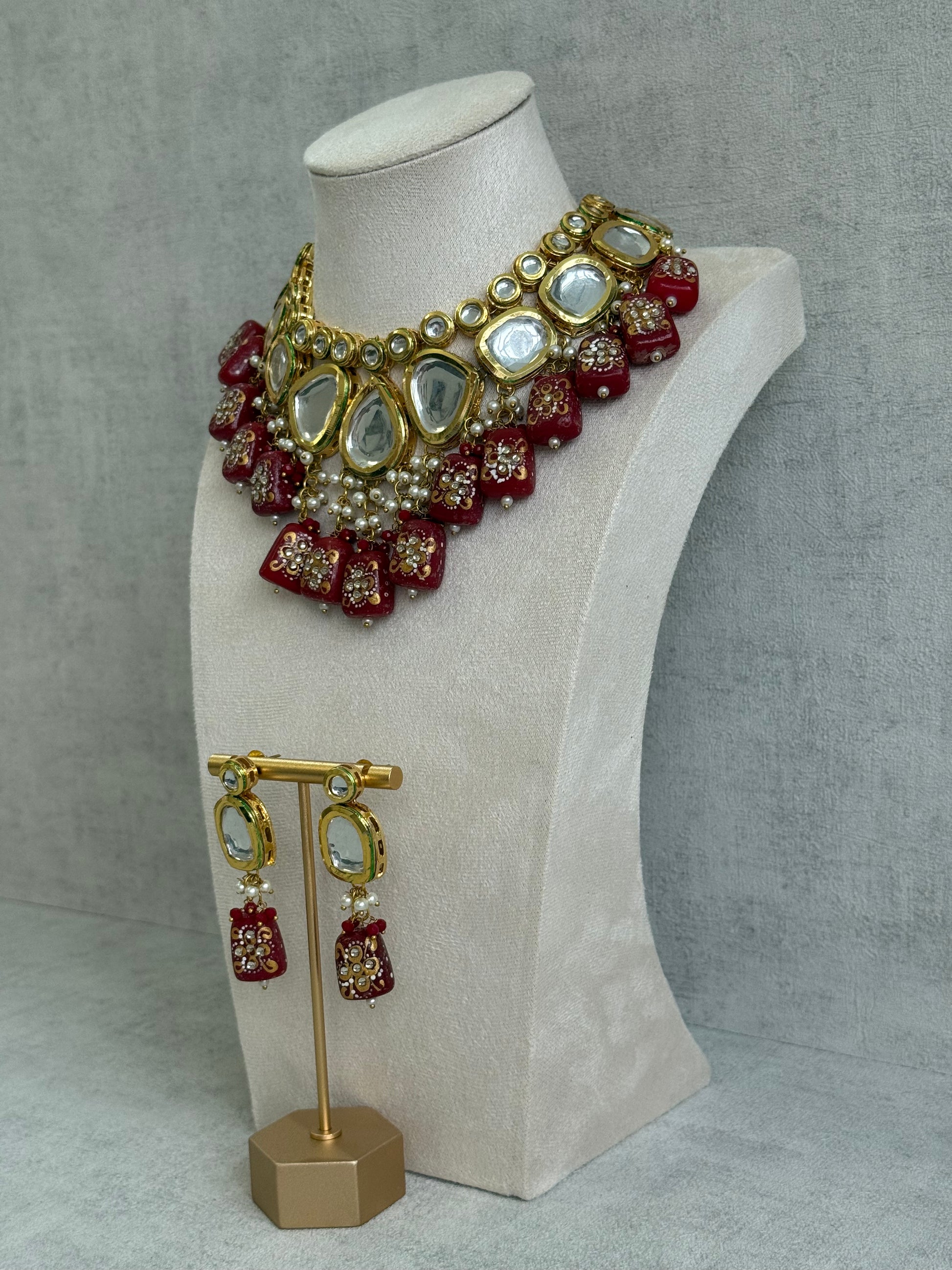 The Omika Set in ruby red is a bold, traditional design centred around classic kundan stonework in an antique gold finish. The structured choker-style necklace showcases oval and pear-shaped kundan stones, creating a rich, regal presence along the neckline.