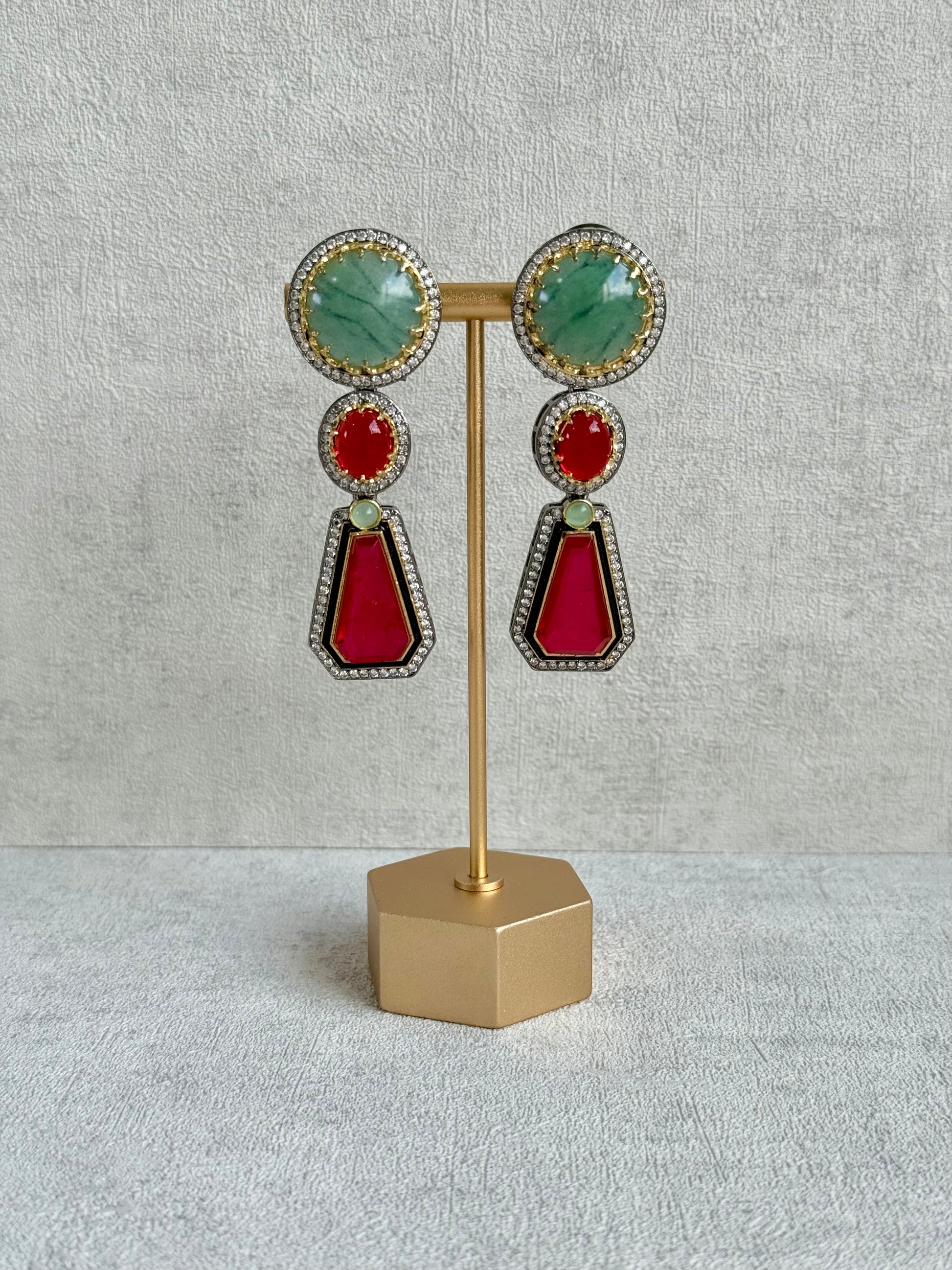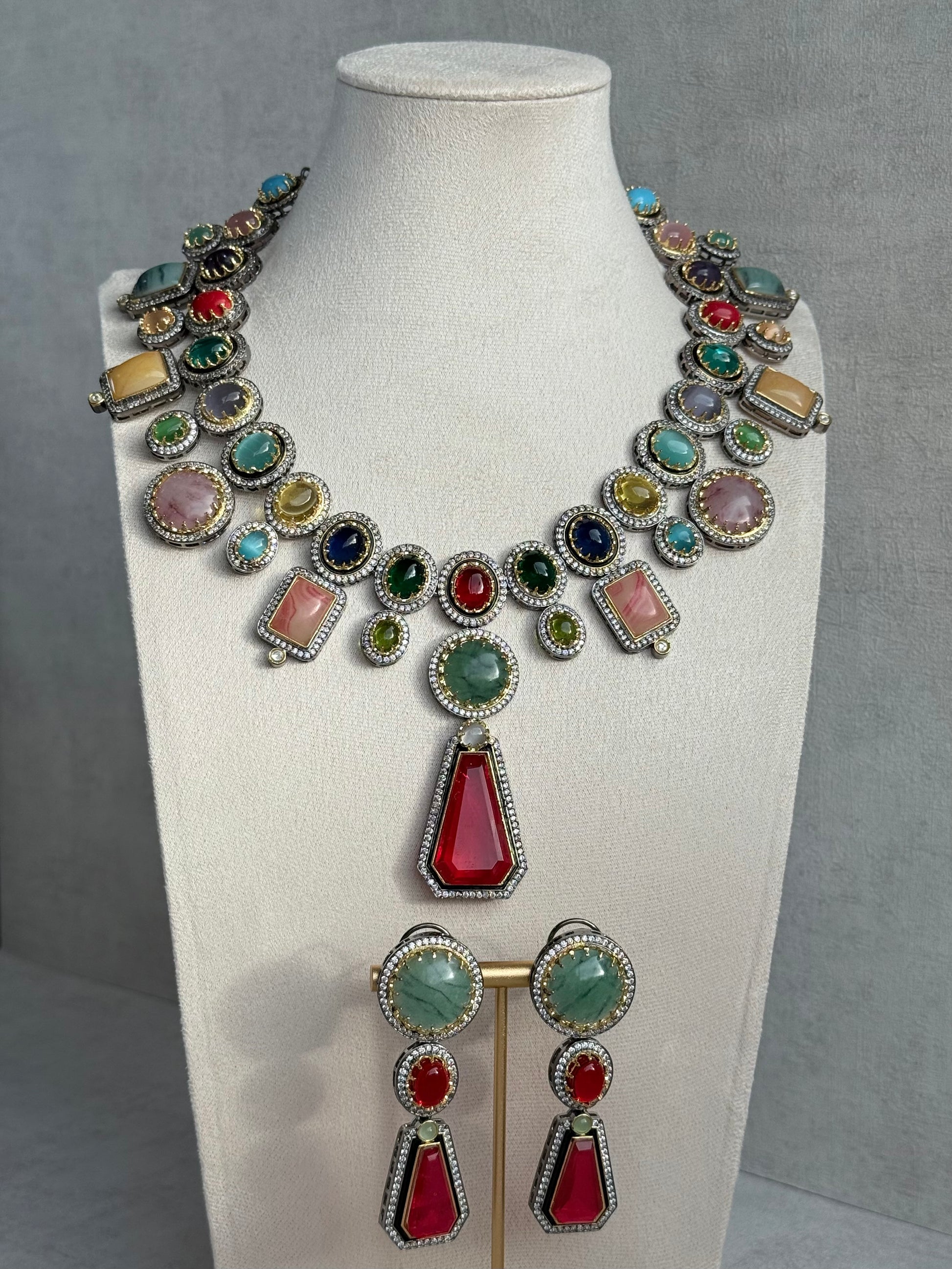 Each stone is individually framed with crystal borders and set in an antique silver finish, creating depth, contrast, and a beautifully balanced palette. The central pendant anchors the necklace with a bold, elongated drop, drawing the eye and adding graceful movement to the piece.