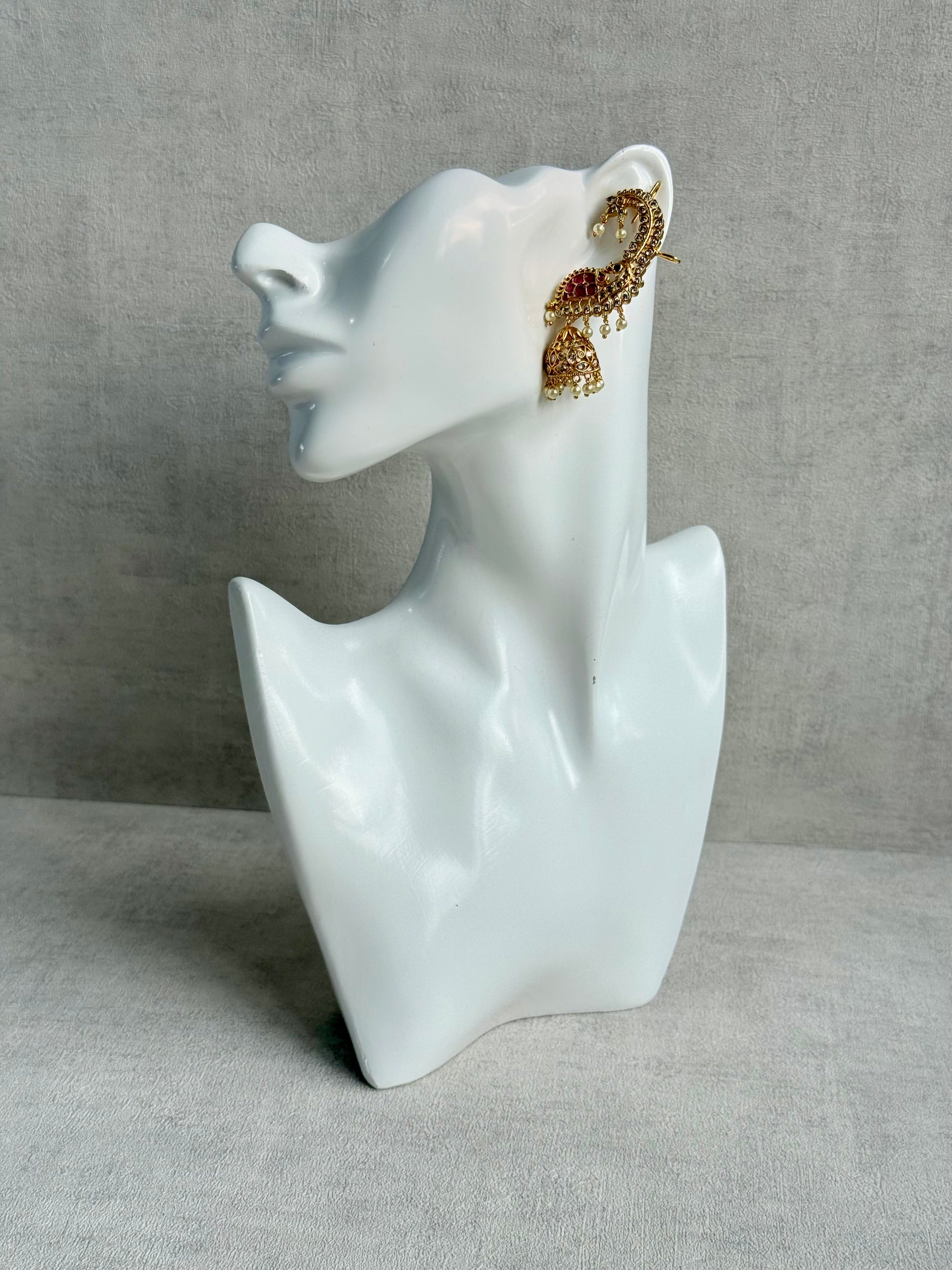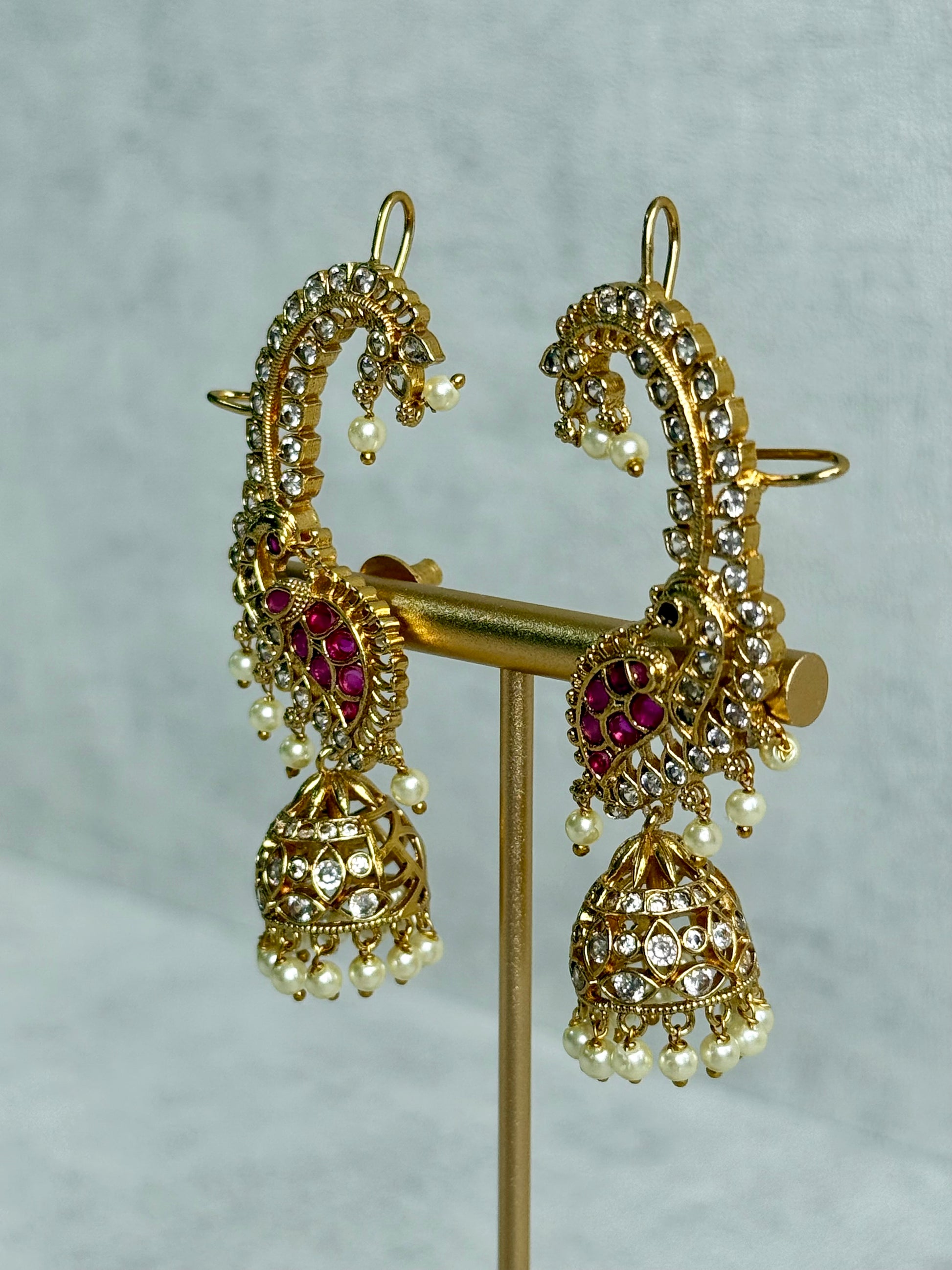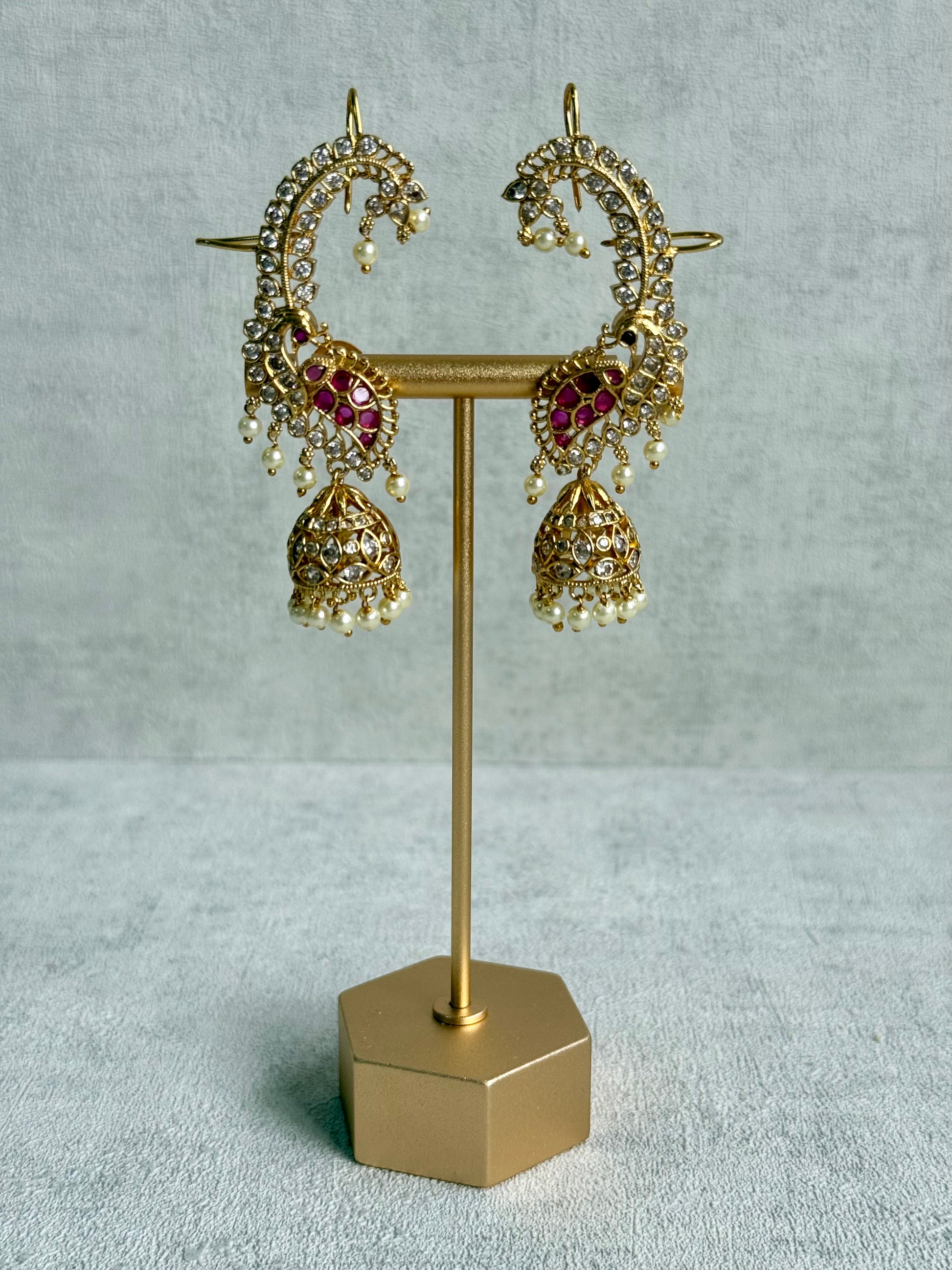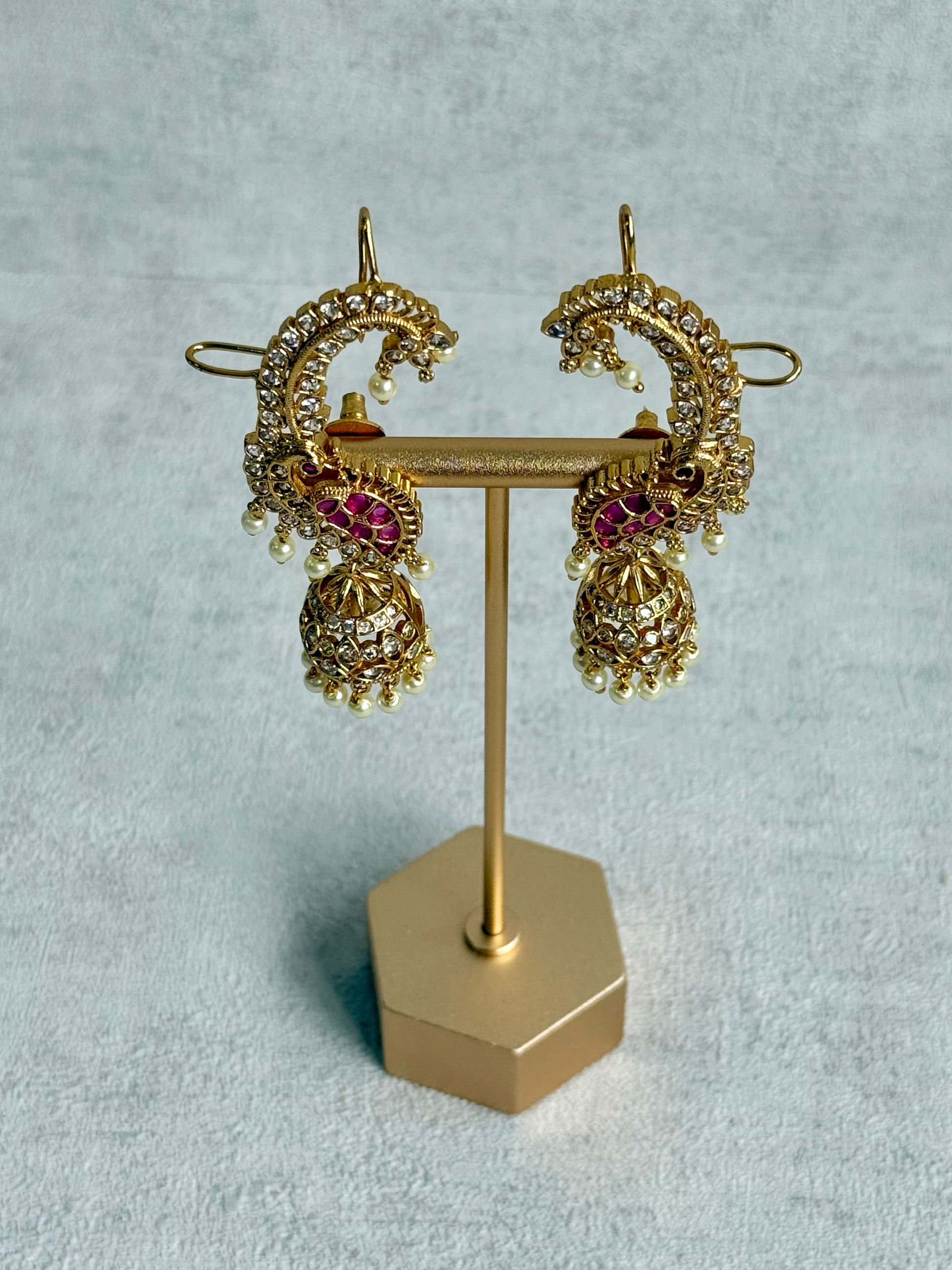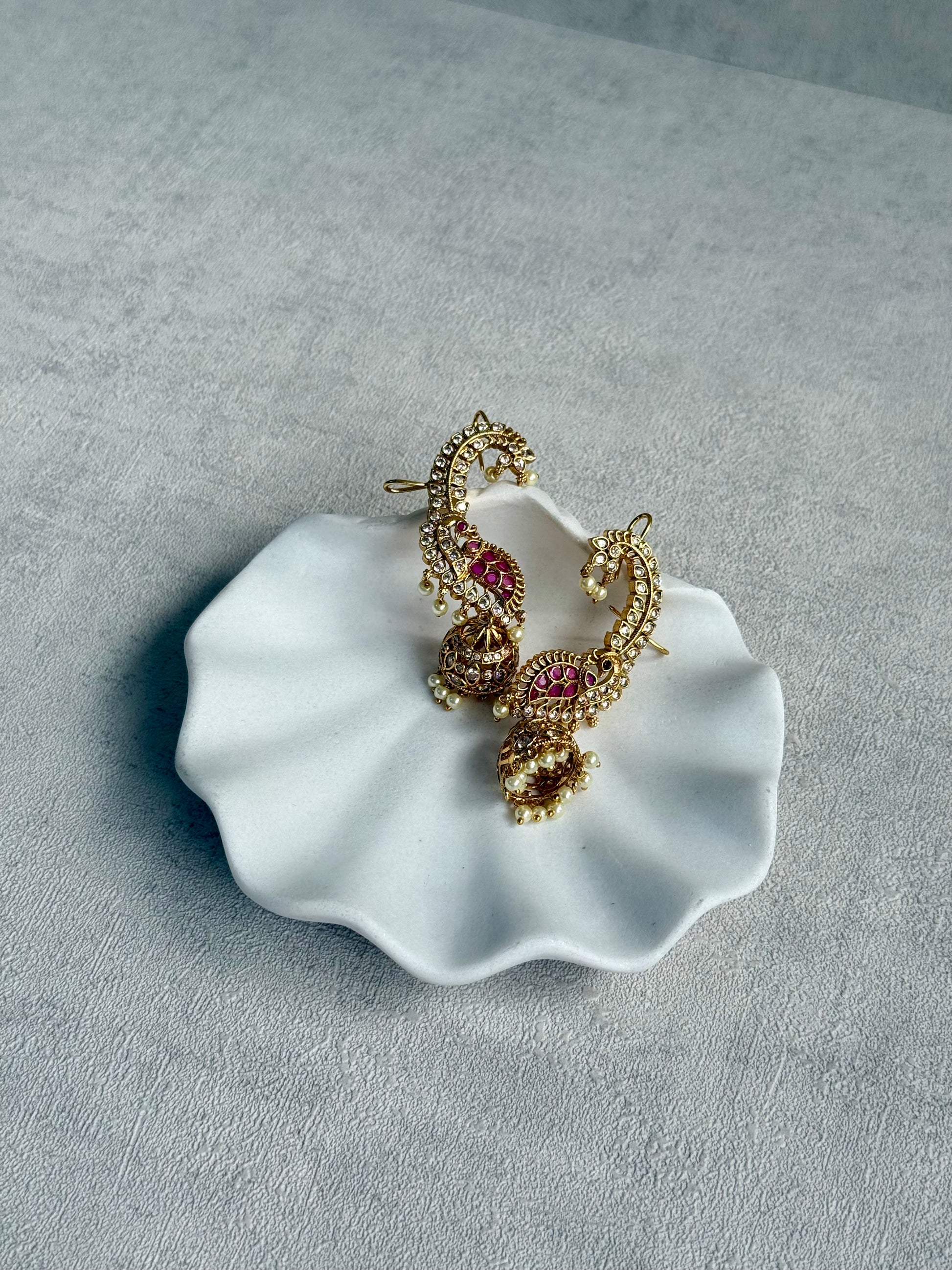 Ayura Designs Padma Earrings – Gold Half Ear Cuffs with Peacock Motif, Pink Stone Accents, Kundan Crystals & Pearl Jhumka Drops