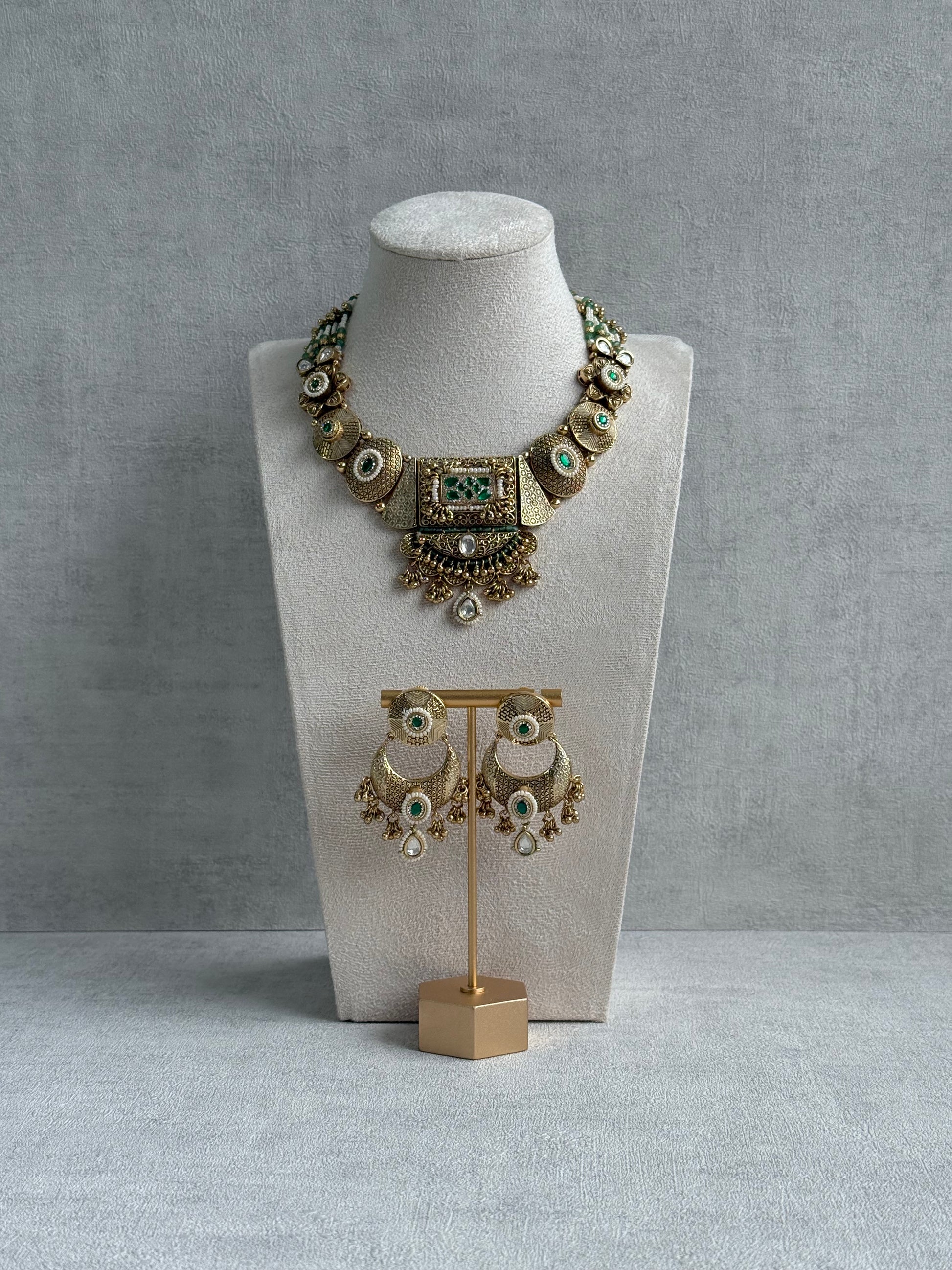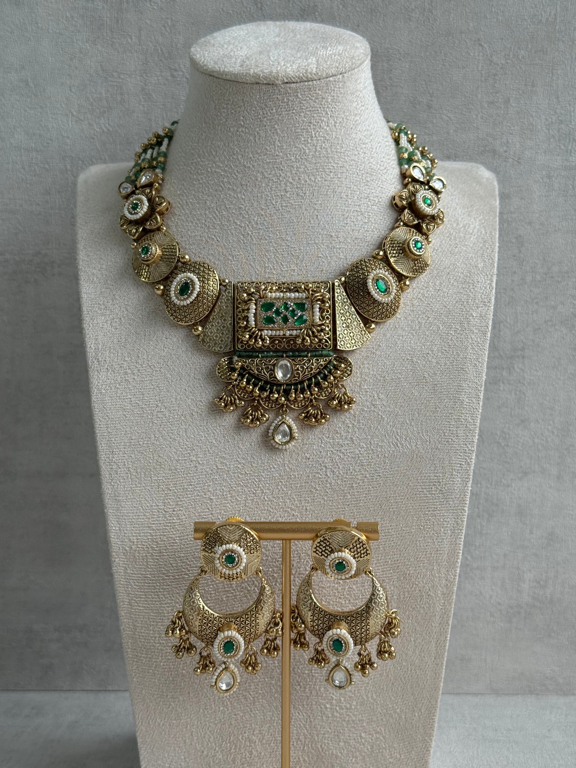 The Ayura Designs Purvi Set – Necklace & Earrings with Antique Gold Filigree, Emerald & Pearl Detailing radiates old-world luxury with a touch of modern grace. Designed in an antique gold finish, it features intricate texturing, miniature pearls, and deep green accents that bring timeless beauty to life.