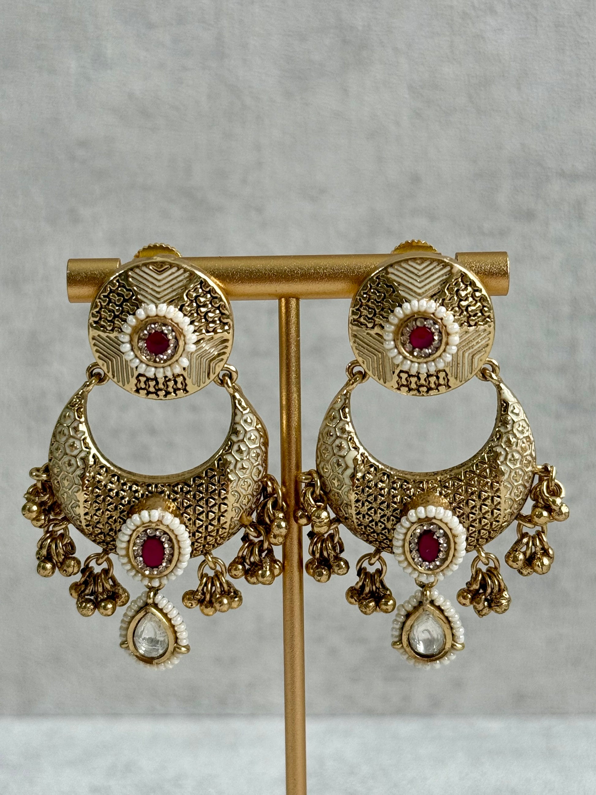 The matching earrings mirror the necklace’s artistry — crescent-shaped with miniature gold ghungroo drops that move gracefully with every turn. Their rich filigree texture and pink centre stones make them a statement on their own or a flawless complement to the necklace.