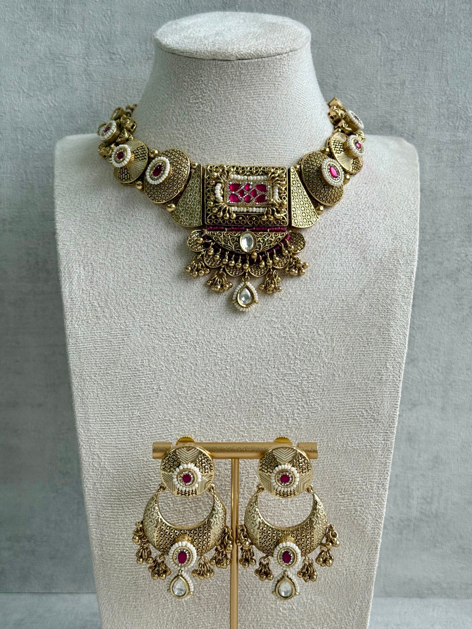 The Ayura Designs Purvi Set – Necklace & Earrings with Antique Gold Filigree, Fuchsia Pink & Pearl Detailing is a regal masterpiece inspired by traditional temple artistry and royal Indian craftsmanship. Each element of the design is steeped in intricate detailing, with handcrafted motifs, lattice textures, and rich antique gold tones that evoke a sense of old-world grandeur.