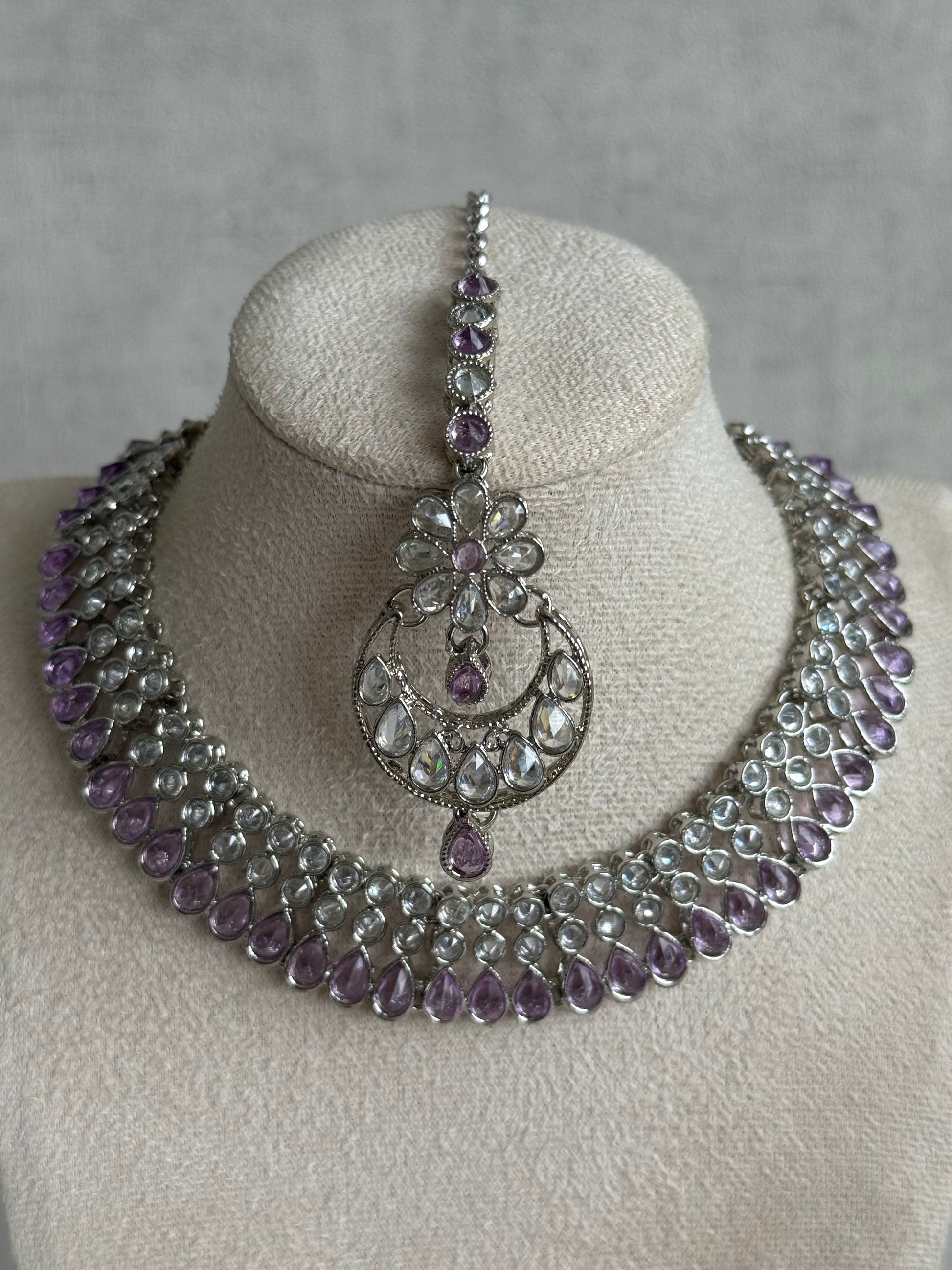 The Ayura Designs Qirat Set with Earrings & Tikka is a vision of understated beauty, crafted in a graceful silver finish. At its heart are delicate teardrop-shaped stones in a soft lilac hue, framed with mirror-cut accents that bring gentle sparkle to every movement. The necklace’s clean silhouette sits elegantly across the collarbone, offering both comfort and sophistication.