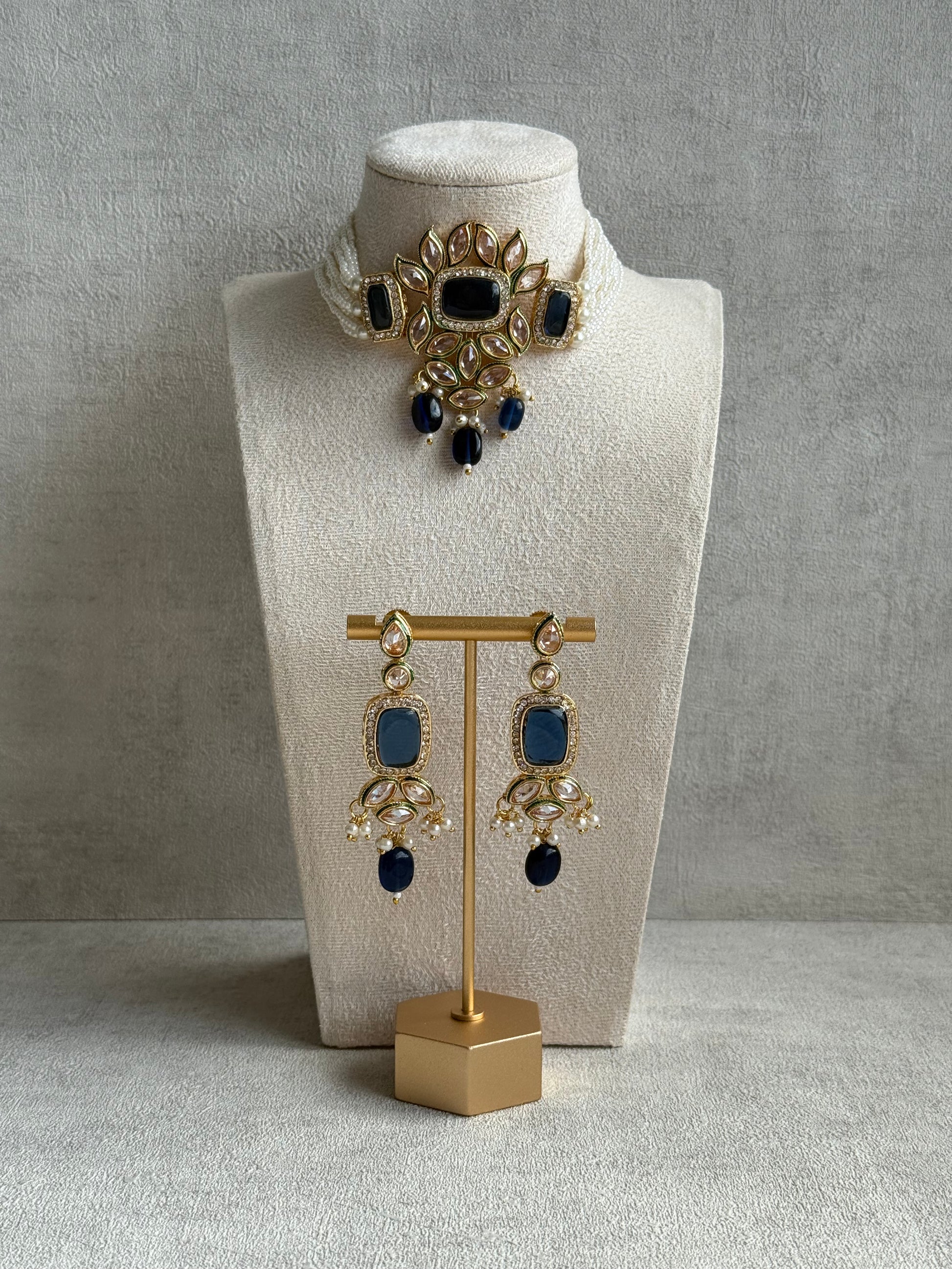 The deep ink blue bead drops lend a sense of mystique to the piece, offering a moody contrast against the warm gold tones. These aren’t your average navy stones—they’re darker, richer, and more intense, making them ideal for evening functions, winter weddings, or any occasion where you want your jewellery to leave a lasting impression. The accompanying earrings echo the same design, creating a complete look that’s both polished and powerful.