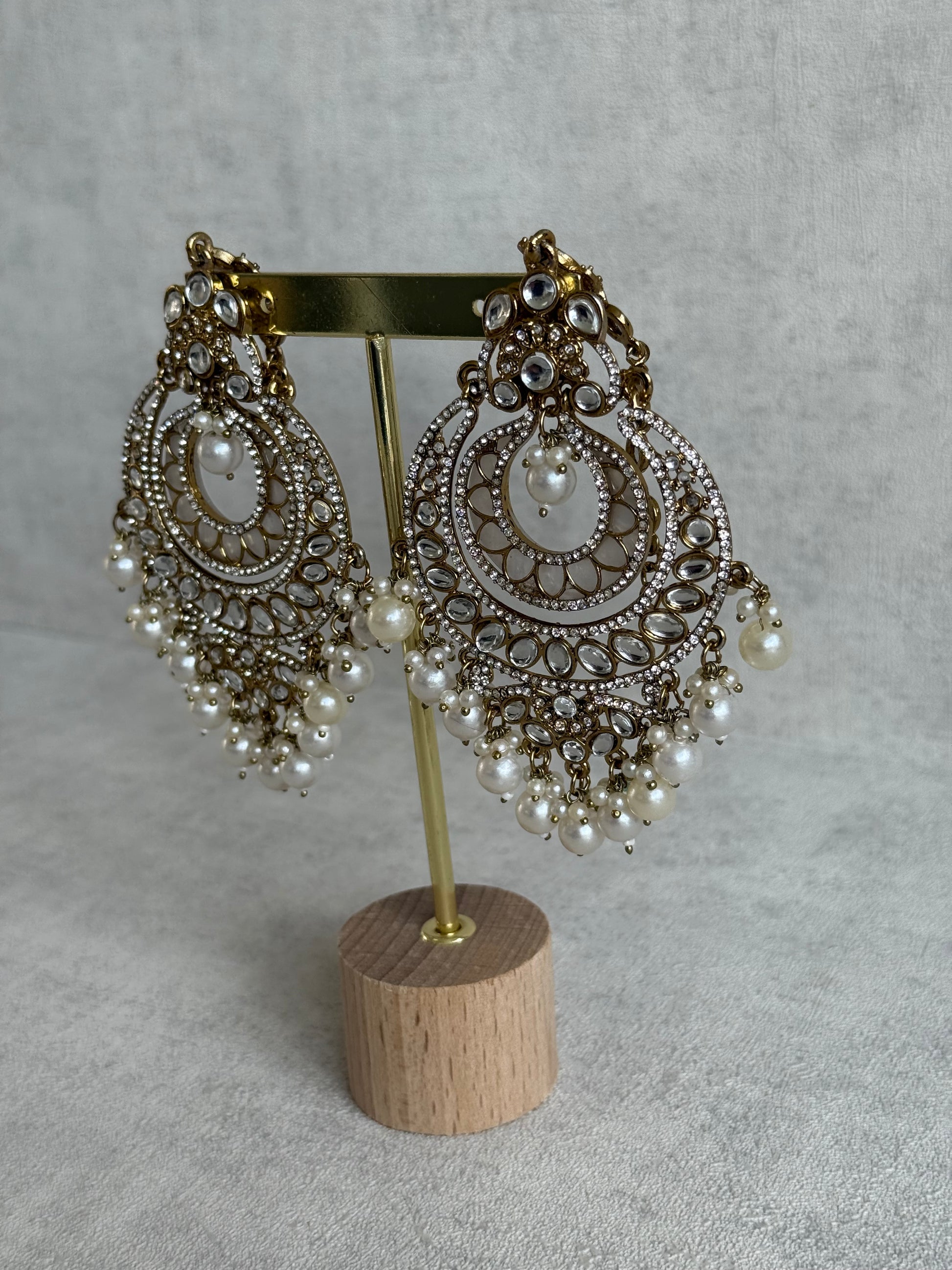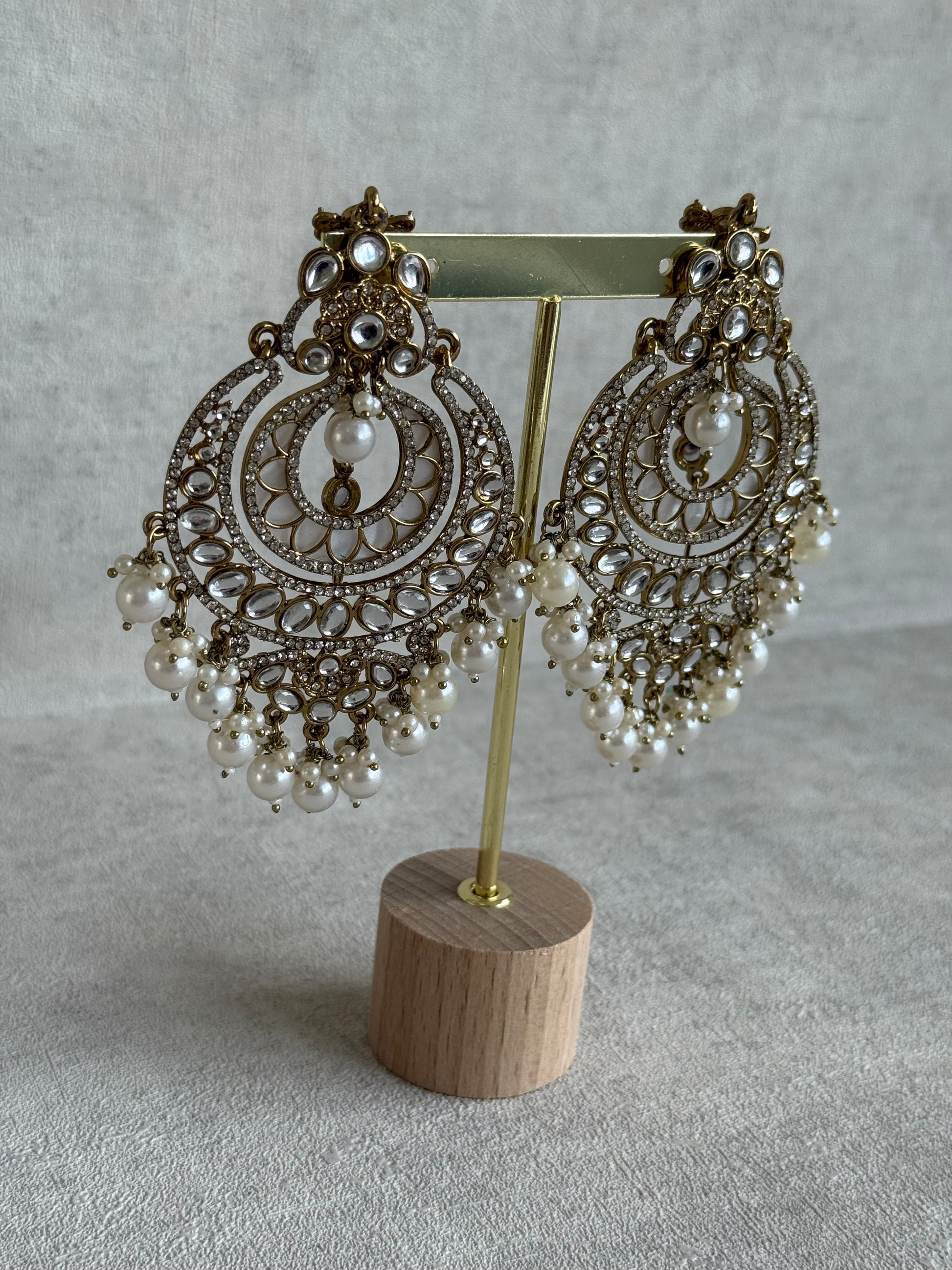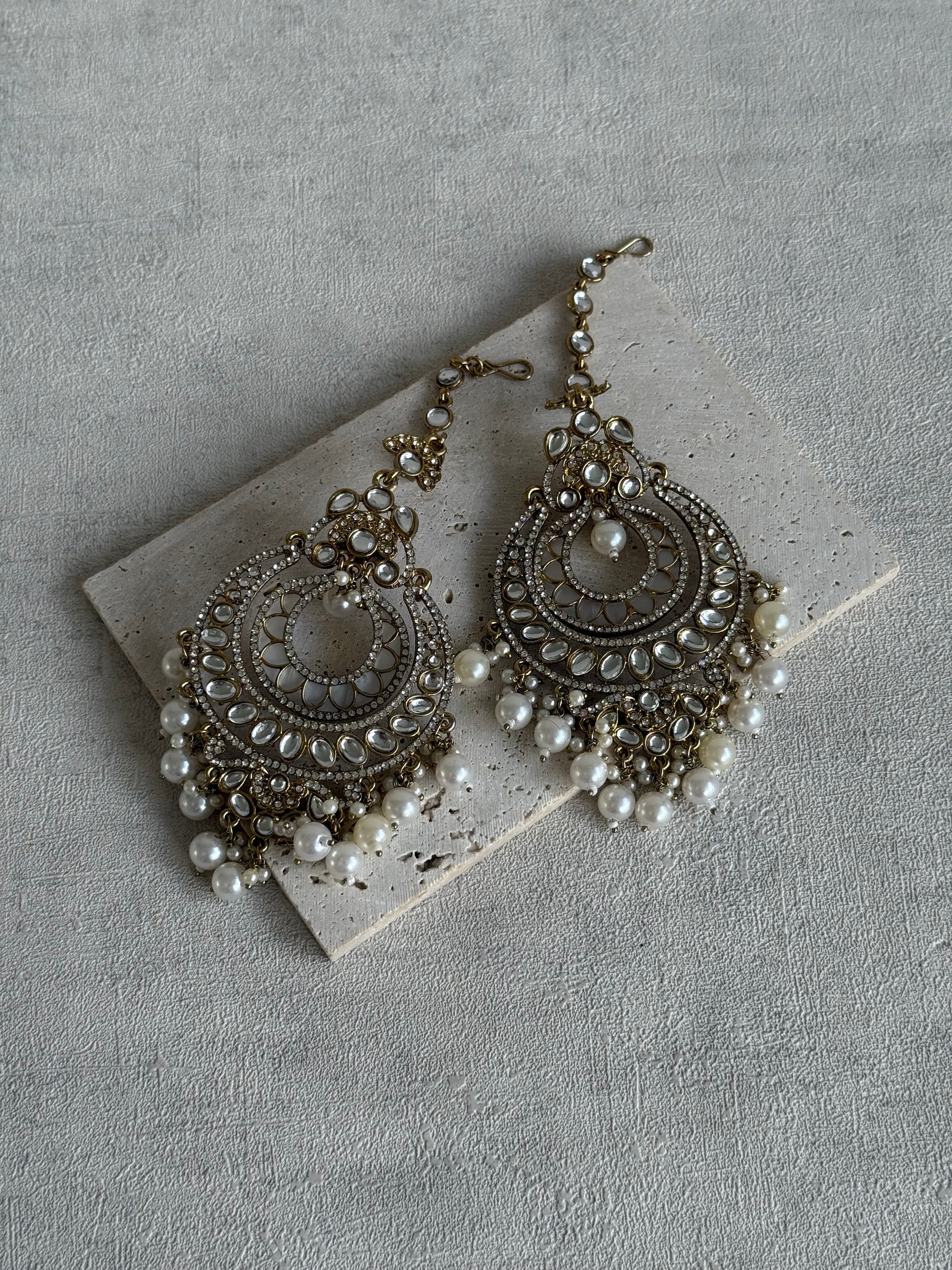Adorned with lustrous ivory pearls that cascade from the edges, the earrings radiate an ethereal glow. Each pearl sways gently with movement, reflecting the play of light across the antique gold base and mirror-cut kundan stones. The soft ivory palette pairs beautifully with gold and champagne tones, making these earrings a perfect choice for brides, festive events, or anyone drawn to classic, understated opulence.