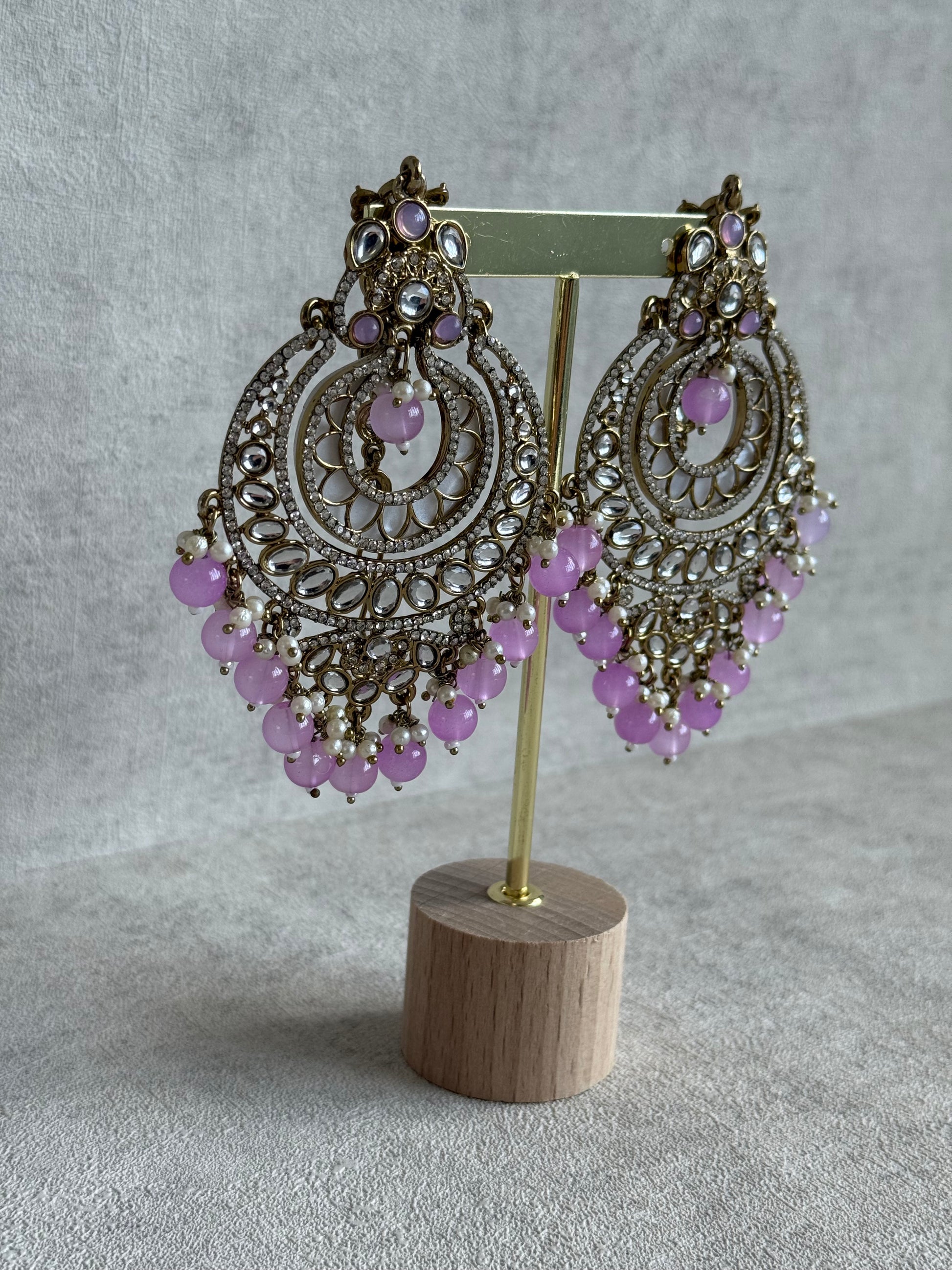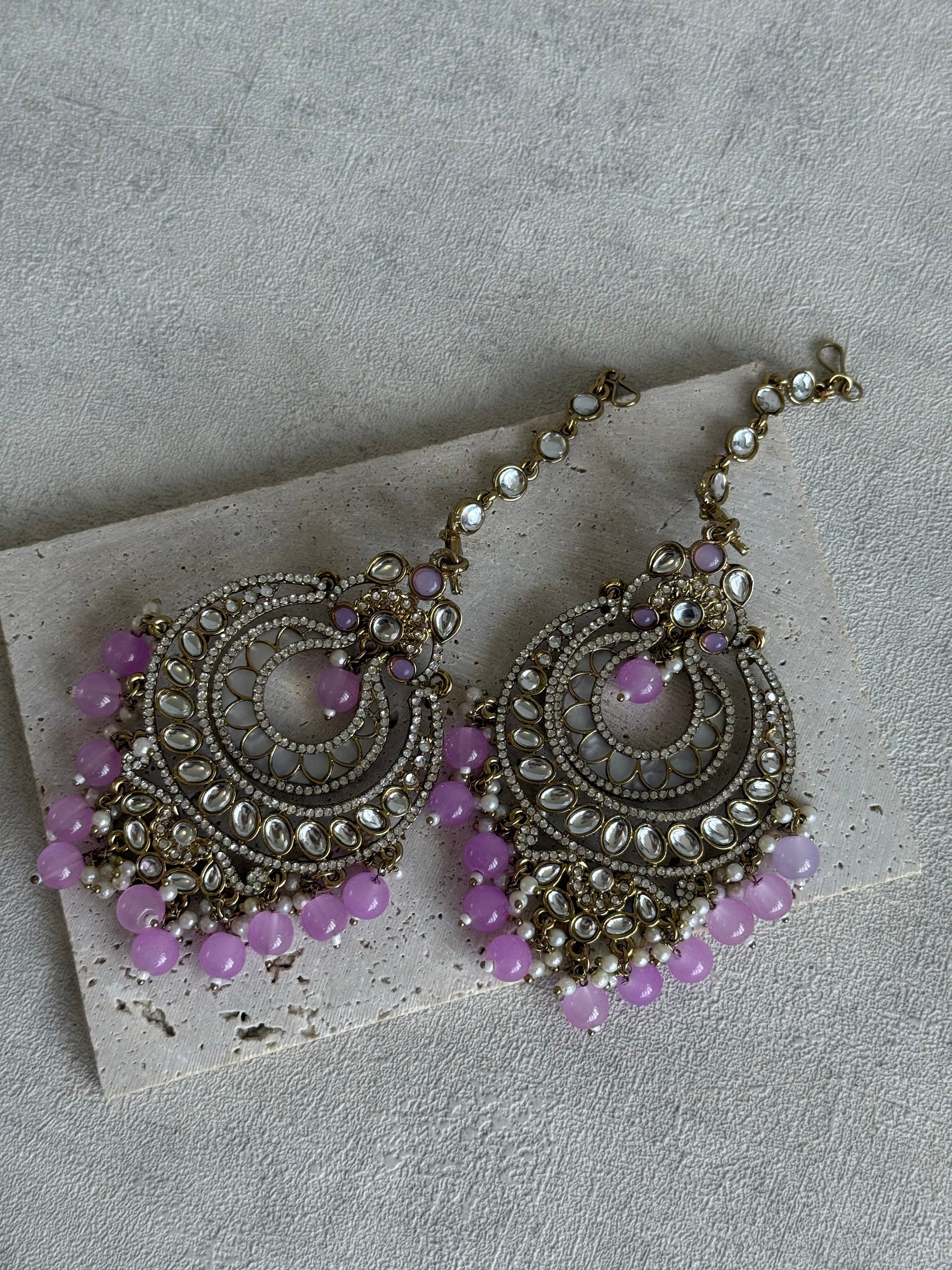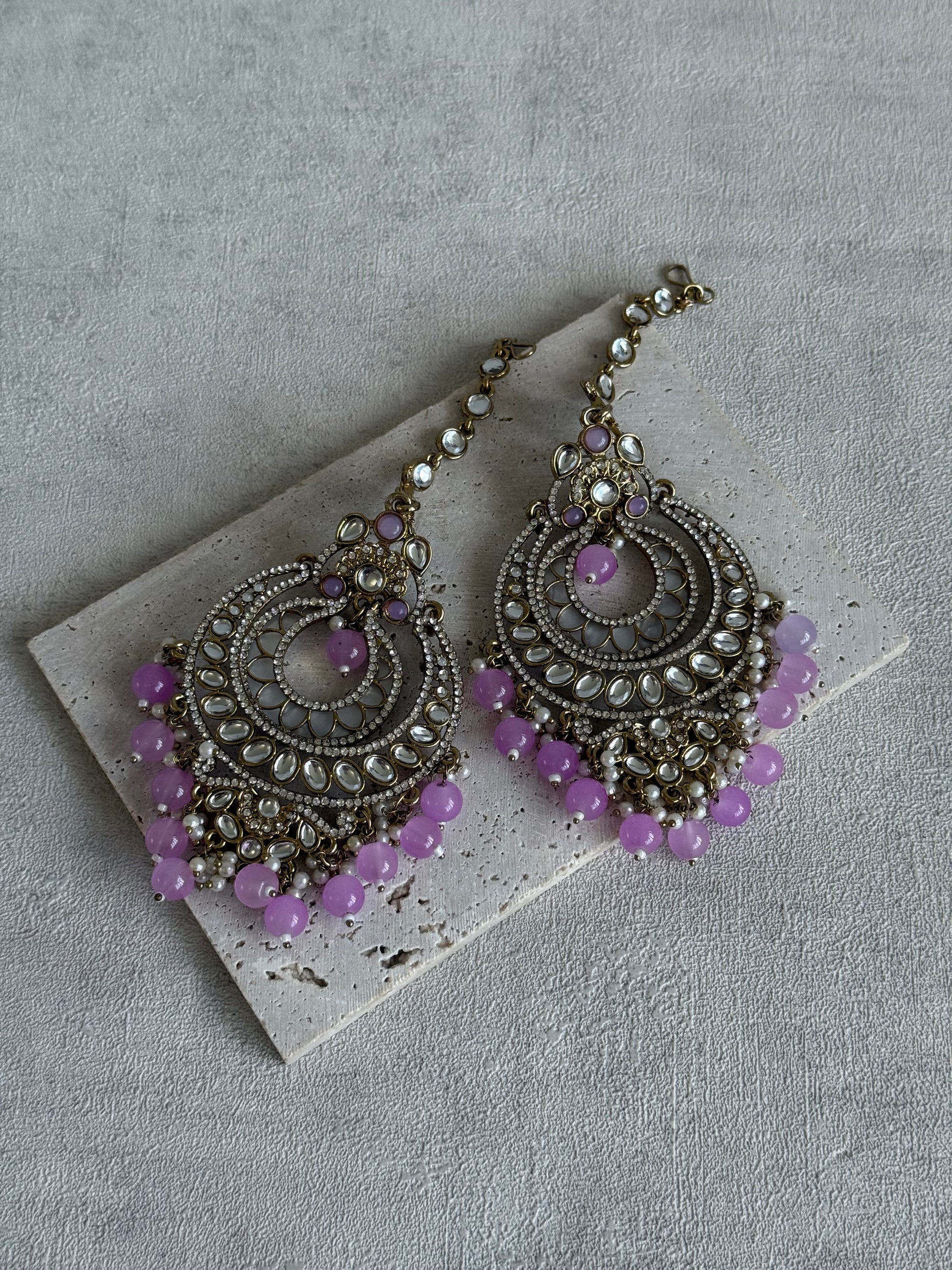 The Ayura Designs Rabia Chandbalis with attached sahare are an ode to feminine elegance and timeless craftsmanship. Rendered in an antique gold finish, these chandbalis feature intricate kundan detailing in layered crescent motifs, framed by soft lilac beads that exude a dreamy, ethereal glow. The sahare — delicate chain attachments designed to drape beautifully along the ear — add a graceful finishing touch that elevates the earrings into a truly regal statement piece.